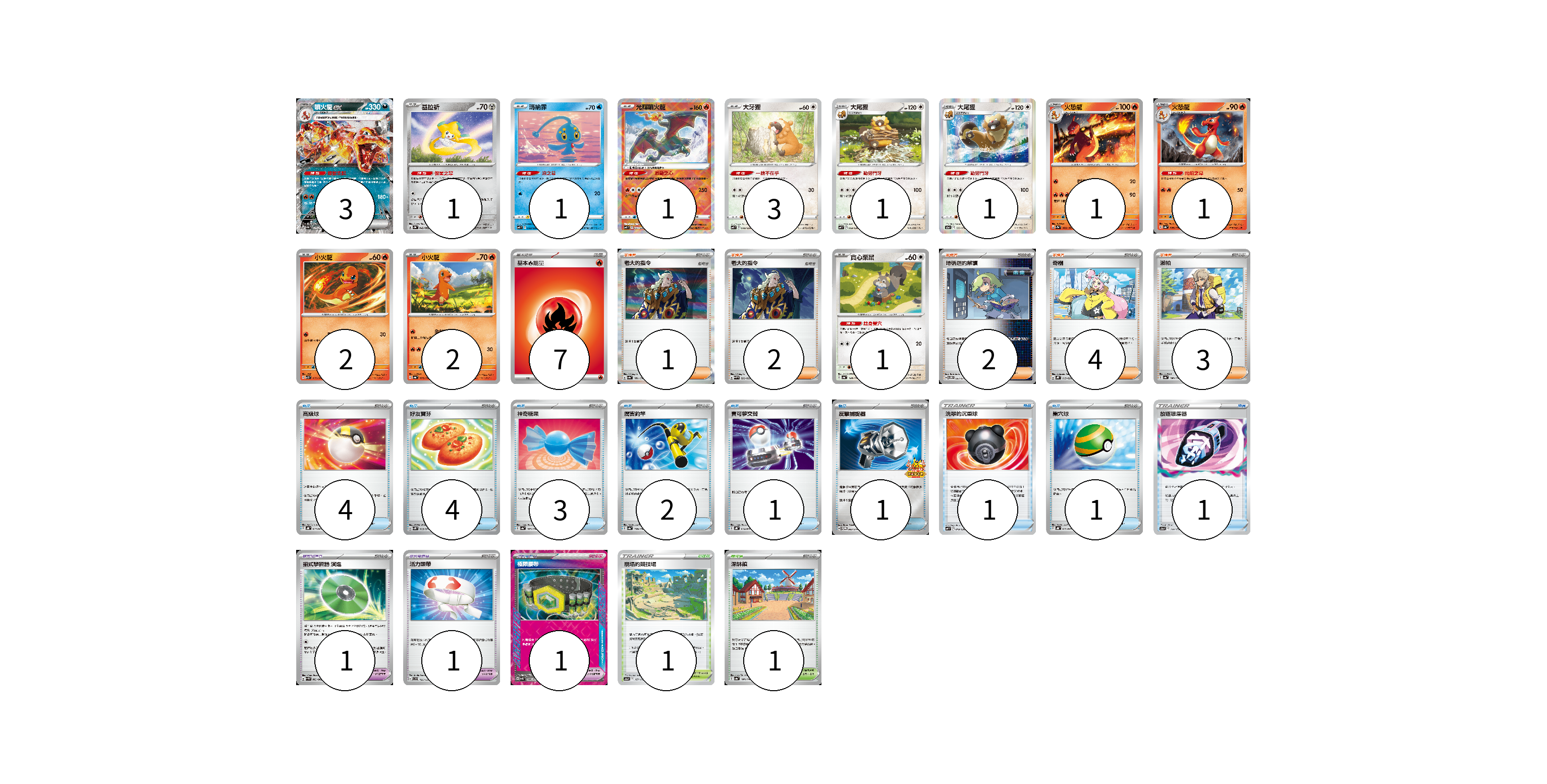 牌組構築方案 以此牌組為基礎新構築牌組 顯示卡面 顯示列表 寶可夢卡(18) 3 1 1 1 3 1 1 1 1 2 2 1 寶可夢道具(3) 1 1 1 物品卡(18) 4 4 3 2 1 1 1 1 1 支援者卡(12) 1 2 2 4 3 競技場卡(2) 1 1 能量卡(7) 7 寶可夢卡(18) 卡牌名稱 張數 卡牌名稱 張數 噴火龍ex SV4a 115/190 03 基拉祈 SV3a 042/062 01 瑪納霏 SVF 003/038 01 光輝噴火龍 SVF 001/038 01 大牙狸 SVF 008/038 03 大尾狸 SVF 009/038 01 大尾狸 S12a 122/172 01 火恐龍 SV2a 005/165 01 火恐龍 SV4a 026/190 01 小火龍 SV3 012/108 02 小火龍 SV4a 025/190 02 貪心栗鼠 SV4a 148/190 01 寶可夢道具(3) 卡牌名稱 張數 卡牌名稱 張數 招式學習器 演進 SV4M 063/066 01 活力頭帶 SVD 125/139 01 極限腰帶 SV5K 066/071 01 物品卡(18) 卡牌名稱 張數 卡牌名稱 張數 高級球 SVHK 013/022 04 好友寶芬 SV5K 063/071 04 神奇糖果 SV4a 163/190 03 厲害釣竿 SV4a 158/190 02 寶可夢交替 SVHK 014/022 01 反擊捕捉器 SV-P 083/SV-P 01 洗翠的沉重球 SVF 019/038 01 巢穴球 SVHK 012/022 01 放逐吸塵器 S12a 144/172 01 支援者卡(12) 卡牌名稱 張數 卡牌名稱 張數 老大的指令 SV4a 181/190 01 老大的指令 SVHM 022/022 02 暗碼迷的解讀 SV5M 067/071 02 奇樹 SVHK 019/022 04 派帕 SV4a 180/190 03 競技場卡(2) 卡牌名稱 張數 卡牌名稱 張數 崩塌的競技場 S12a 167/172 01 深缽鎮 SV4a 185/190 01 能量卡(7) 卡牌名稱 張數 卡牌名稱 張數 基本【火】能量 SVHK FIR 07 以此牌組為基礎新構築牌組 牌組編碼 weQmuT-CgMUFS-eLJSON copy 列印牌組單 牌組編碼已複製 分享至SNS