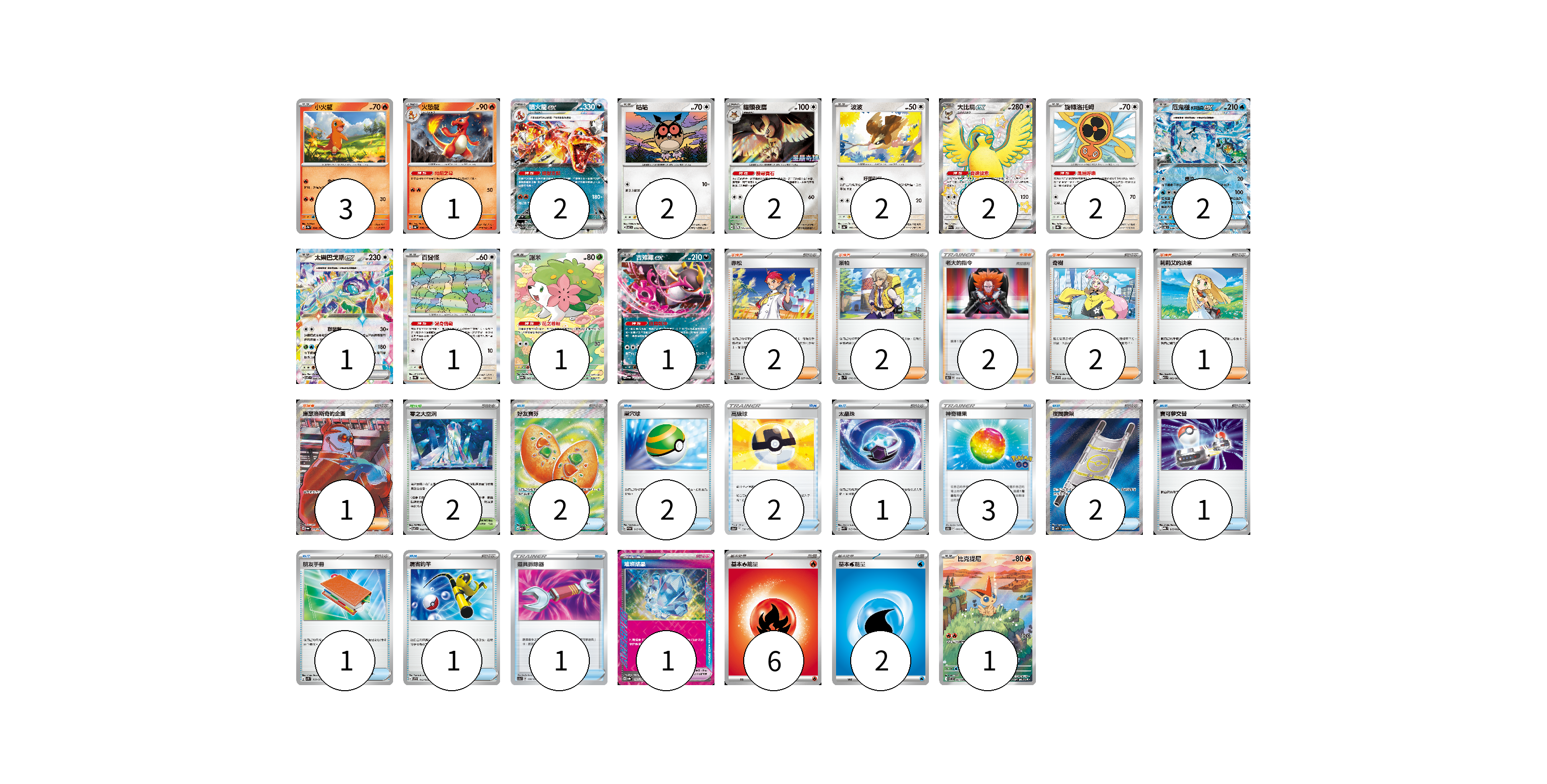 牌組構築方案 以此牌組為基礎新構築牌組 顯示卡面 顯示列表 寶可夢卡(23) 3 1 2 2 2 2 2 2 2 1 1 1 1 1 寶可夢道具(1) 1 物品卡(16) 2 2 2 1 3 2 1 1 1 1 支援者卡(10) 2 2 2 2 1 1 競技場卡(2) 2 能量卡(8) 6 2 寶可夢卡(23) 卡牌名稱 張數 卡牌名稱 張數 小火龍 SV2a 004/165 03 火恐龍 SV4a 026/190 01 噴火龍ex SV3 066/108 02 咕咕 SV7 076/102 02 貓頭夜鷹 SV-P 145/SV-P 02 波波 SV4a 137/190 02 大比鳥ex SV4a 335/190 02 旋轉洛托姆 SV8a 131/187 02 厄鬼椪 水井面具ex SV6 038/101 02 太樂巴戈斯ex SV7 088/102 01 百變怪 SV4a 144/190 01 謝米 SV9a 066/063 01 吉雉雞ex SV6a 038/064 01 比克提尼 SV11B 097/086 01 寶可夢道具(1) 卡牌名稱 張數 卡牌名稱 張數 璀璨結晶 SV8a 152/187 01 物品卡(16) 卡牌名稱 張數 卡牌名稱 張數 好友寶芬 M1S 081/063 02 巢穴球 SVAM 015/023 02 高級球 S12a 138/172 02 太晶珠 SVK 013/042 01 神奇糖果 S10b 066/071 03 夜間擔架 M1L 083/063 02 寶可夢交替 MBG 015/022 01 朋友手冊 SV1S 069/078 01 厲害釣竿 SVF 013/038 01 道具拆除器 SC1a 138/154 01 支援者卡(10) 卡牌名稱 張數 卡牌名稱 張數 赤松 SVK 027/042 02 派帕 SV1V 076/078 02 老大的指令(弗拉達利) S8b 158/184 02 奇樹 SVF 029/038 02 莉莉艾的決意 M1L 062/063 01 庫瑟洛斯奇的企圖 SV6a 086/064 01 競技場卡(2) 卡牌名稱 張數 卡牌名稱 張數 零之大空洞 SV7 102/102 02 能量卡(8) 卡牌名稱 張數 卡牌名稱 張數 基本【火】能量 M-P FIR 06 基本水能量 sv-p WAT 02 以此牌組為基礎新構築牌組 牌組編碼 wfhCNs-eaqmCu-QUCRMH copy 列印牌組單 牌組編碼已複製 分享至SNS