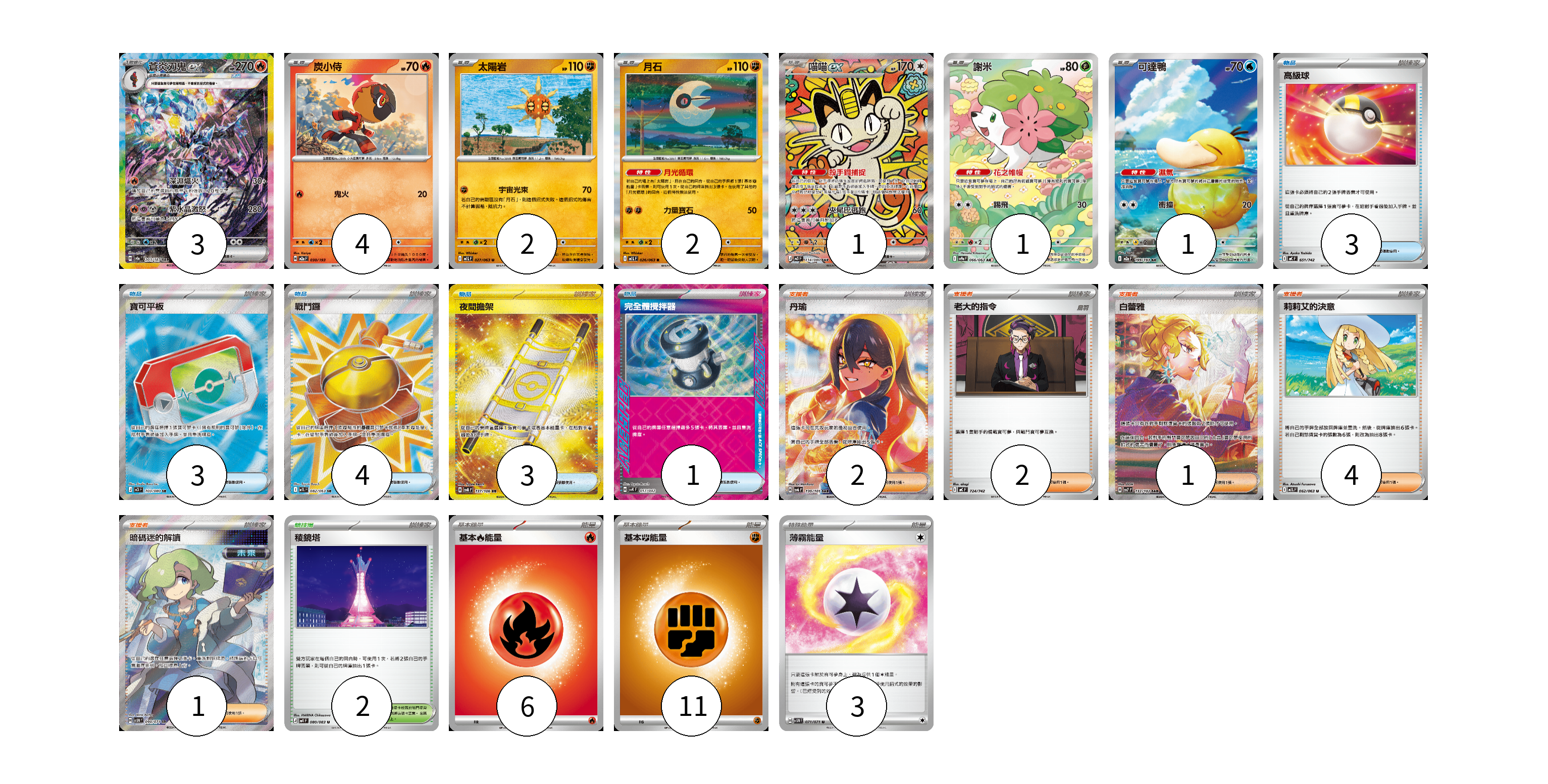 牌組構築方案 以此牌組為基礎新構築牌組 顯示卡面 顯示列表 寶可夢卡(14) 3 4 2 2 1 1 1 物品卡(14) 3 3 4 3 1 支援者卡(10) 2 2 1 4 1 競技場卡(2) 2 能量卡(20) 6 11 3 寶可夢卡(14) 卡牌名稱 張數 卡牌名稱 張數 蒼炎刃鬼ex SV8a 203/187 03 炭小侍 M2a 030/193 04 太陽岩 M1L 027/063 02 月石 M1L 026/063 02 喵喵ex M3 114/080 01 謝米 SV9a 066/063 01 可達鴨 M2a 199/193 01 物品卡(14) 卡牌名稱 張數 卡牌名稱 張數 高級球 MC 651/742 03 寶可平板 M3 103/080 03 戰鬥鑼 M1L 082/063 04 夜間擔架 SV8 137/106 03 完全體攪拌器 SVK 017/042 01 支援者卡(10) 卡牌名稱 張數 卡牌名稱 張數 丹瑜 SV6 130/101 02 老大的指令 MC 724/742 02 白蕾雅 SV7 132/102 01 莉莉艾的決意 M1L 062/063 04 暗碼迷的解讀 SV5M 090/071 01 競技場卡(2) 卡牌名稱 張數 卡牌名稱 張數 稜鏡塔 M4 080/083 02 能量卡(20) 卡牌名稱 張數 卡牌名稱 張數 基本【火】能量 MC FIR 06 基本【鬥】能量 MC FIG 11 薄霧能量 SV5M 071/071 03 以此牌組為基礎新構築牌組 牌組編碼 whUGKV-irHDkL-ojEKht copy 列印牌組單 牌組編碼已複製 分享至SNS