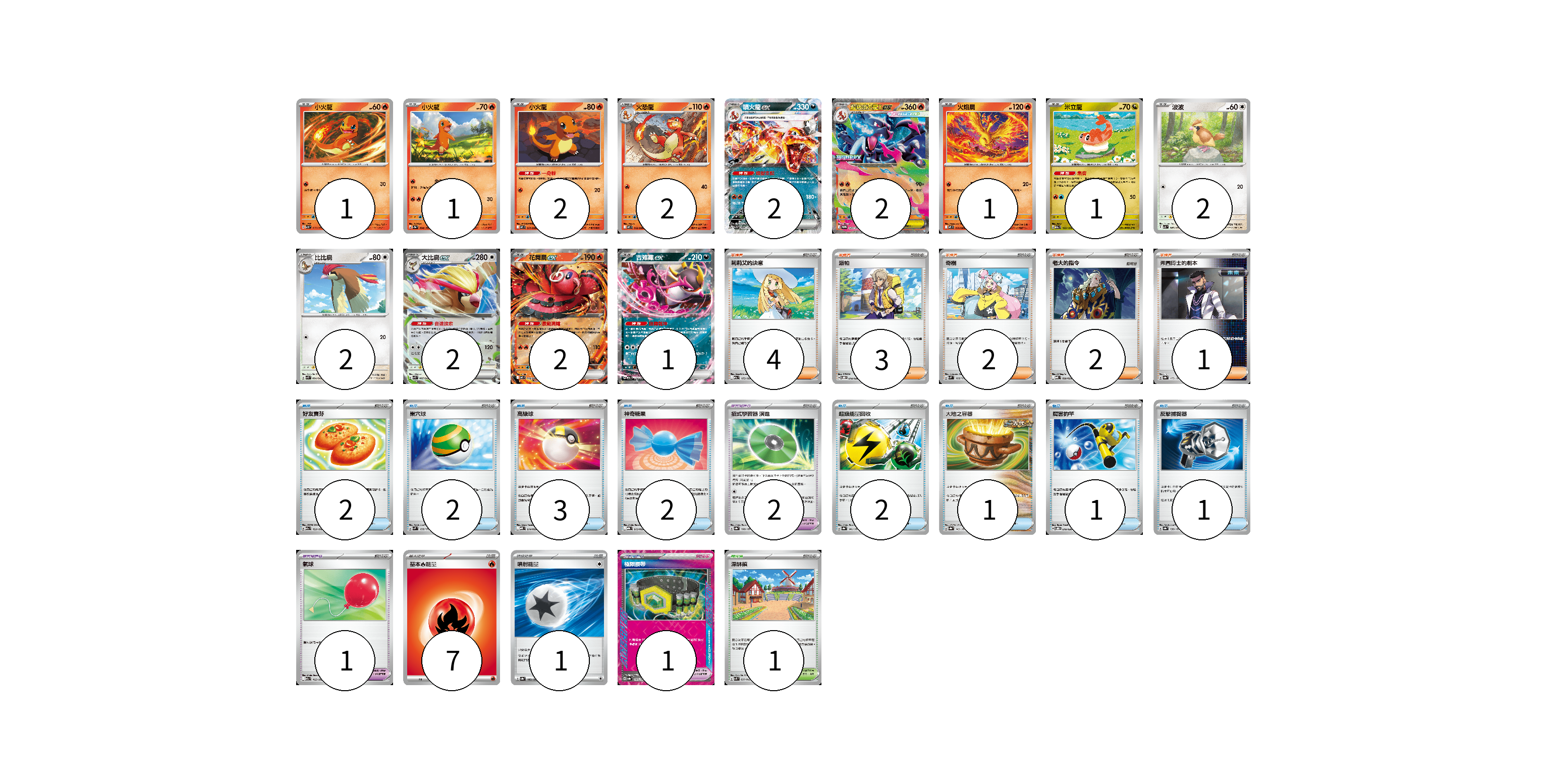 牌組構築方案 以此牌組為基礎新構築牌組 顯示卡面 顯示列表 寶可夢卡(21) 1 1 2 2 2 2 1 1 2 2 2 2 1 寶可夢道具(4) 2 1 1 物品卡(14) 2 2 3 2 2 1 1 1 支援者卡(12) 4 3 2 2 1 競技場卡(1) 1 能量卡(8) 7 1 寶可夢卡(21) 卡牌名稱 張數 卡牌名稱 張數 小火龍 SV3 012/108 01 小火龍 SV2a 004/165 01 小火龍 M2 011/080 02 火恐龍 M2 012/080 02 噴火龍ex SV3 066/108 02 超級噴火龍Xex M-P 029/M-P 02 火焰鳥 M2 014/080 01 米立龍 M2a 135/193 01 波波 SV3 087/108 02 比比鳥 SVK 004/042 02 大比鳥ex SVK 005/042 02 花舞鳥ex M2 018/080 02 吉雉雞ex M2a 114/193 01 寶可夢道具(4) 卡牌名稱 張數 卡牌名稱 張數 招式學習器 演進 SV8a 160/187 02 氣球 M2a 165/193 01 極限腰帶 SV8a 159/187 01 物品卡(14) 卡牌名稱 張數 卡牌名稱 張數 好友寶芬 M2a 153/193 02 巢穴球 SVM 133/175 02 高級球 MBD 014/022 03 神奇糖果 MBG 013/022 02 超級能量回收 SV8a 141/187 02 大地之容器 SV8a 143/187 01 厲害釣竿 SVOD 010/020 01 反擊捕捉器 SV8a 139/187 01 支援者卡(12) 卡牌名稱 張數 卡牌名稱 張數 莉莉艾的決意 M2a 175/193 04 派帕 SVOD 018/020 03 奇樹 SVM 160/175 02 老大的指令 MBD 020/022 02 弗圖博士的劇本 SV8a 175/187 01 競技場卡(1) 卡牌名稱 張數 卡牌名稱 張數 深缽鎮 SVK 039/042 01 能量卡(8) 卡牌名稱 張數 卡牌名稱 張數 基本火能量 sv-p FIR 07 噴射能量 SV8a 185/187 01 以此牌組為基礎新構築牌組 牌組編碼 wjaojv-culPcF-itQFaX copy 列印牌組單 牌組編碼已複製 分享至SNS