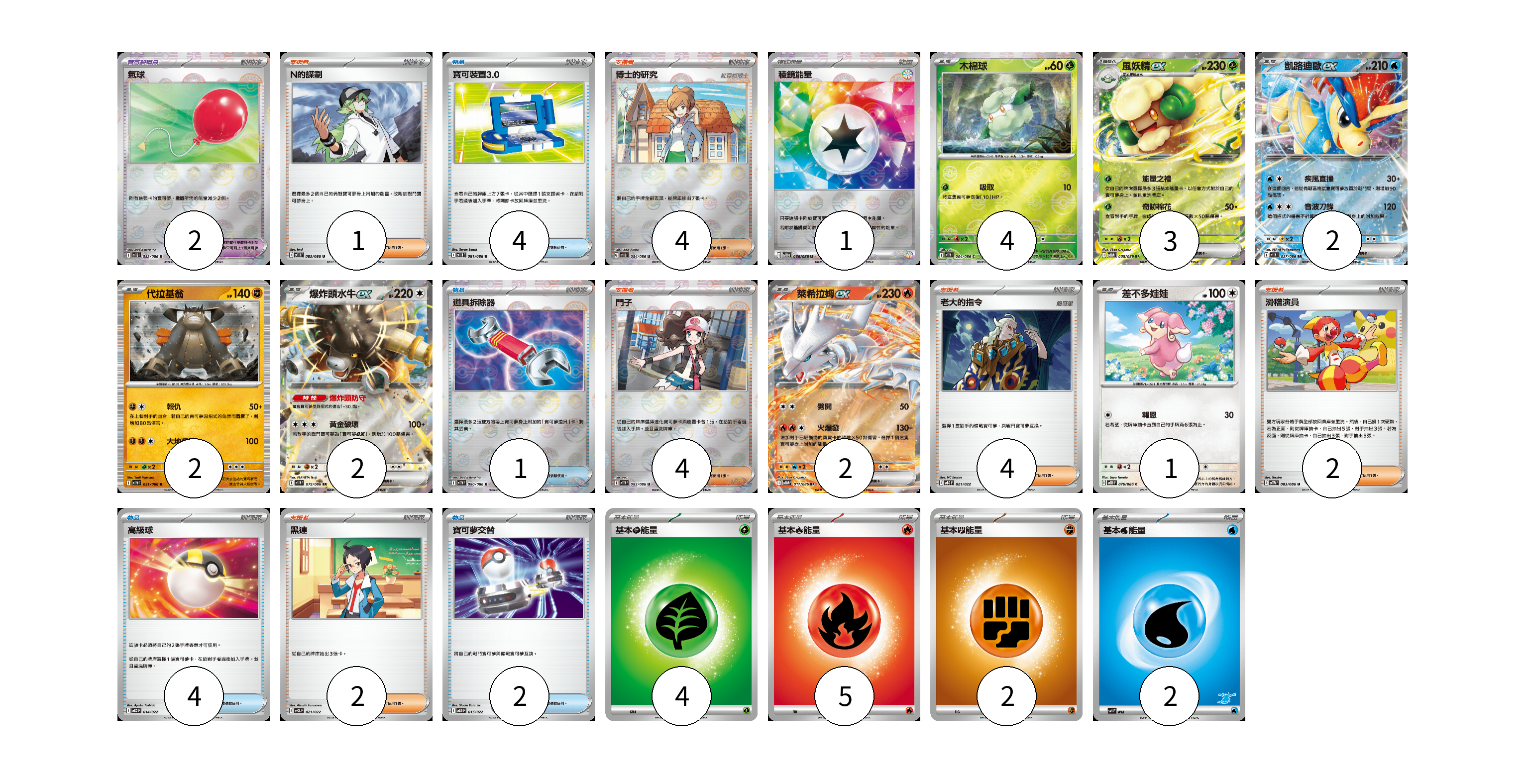 牌組構築方案 以此牌組為基礎新構築牌組 顯示卡面 顯示列表 寶可夢卡(16) 4 3 2 2 2 2 1 寶可夢道具(2) 2 物品卡(11) 4 1 4 2 支援者卡(17) 1 4 4 4 2 2 能量卡(14) 1 4 5 2 2 寶可夢卡(16) 卡牌名稱 張數 卡牌名稱 張數 木棉球 SV11W 004/086 04 風妖精ex SV11W 005/086 03 凱路迪歐ex SV11W 027/086 02 代拉基翁 SV11W 051/086 02 爆炸頭水牛ex SV11W 075/086 02 萊希拉姆ex SV11W 017/086 02 差不多娃娃 SV11B 076/086 01 寶可夢道具(2) 卡牌名稱 張數 卡牌名稱 張數 氣球 SV11B 082/086 02 物品卡(11) 卡牌名稱 張數 卡牌名稱 張數 寶可裝置3.0 SV11B 081/086 04 道具拆除器 SV11W 080/086 01 高級球 MBD 014/022 04 寶可夢交替 MBG 015/022 02 支援者卡(17) 卡牌名稱 張數 卡牌名稱 張數 N的謀劃 SV11B 083/086 01 博士的研究 SV11B 084/086 04 鬥子 SV11W 085/086 04 老大的指令 MBG 021/022 04 滑稽演員 SV11W 083/086 02 黑連 SVQL 021/022 02 能量卡(14) 卡牌名稱 張數 卡牌名稱 張數 稜鏡能量 SV11B 086/086 01 基本【草】能量 M-P GRA 04 基本【火】能量 M-P FIR 05 基本【鬥】能量 M-P FIG 02 基本【水】能量 SVI WAT 02 以此牌組為基礎新構築牌組 牌組編碼 wjzZPy-AlpzRJ-YeNcVU copy 列印牌組單 牌組編碼已複製 分享至SNS