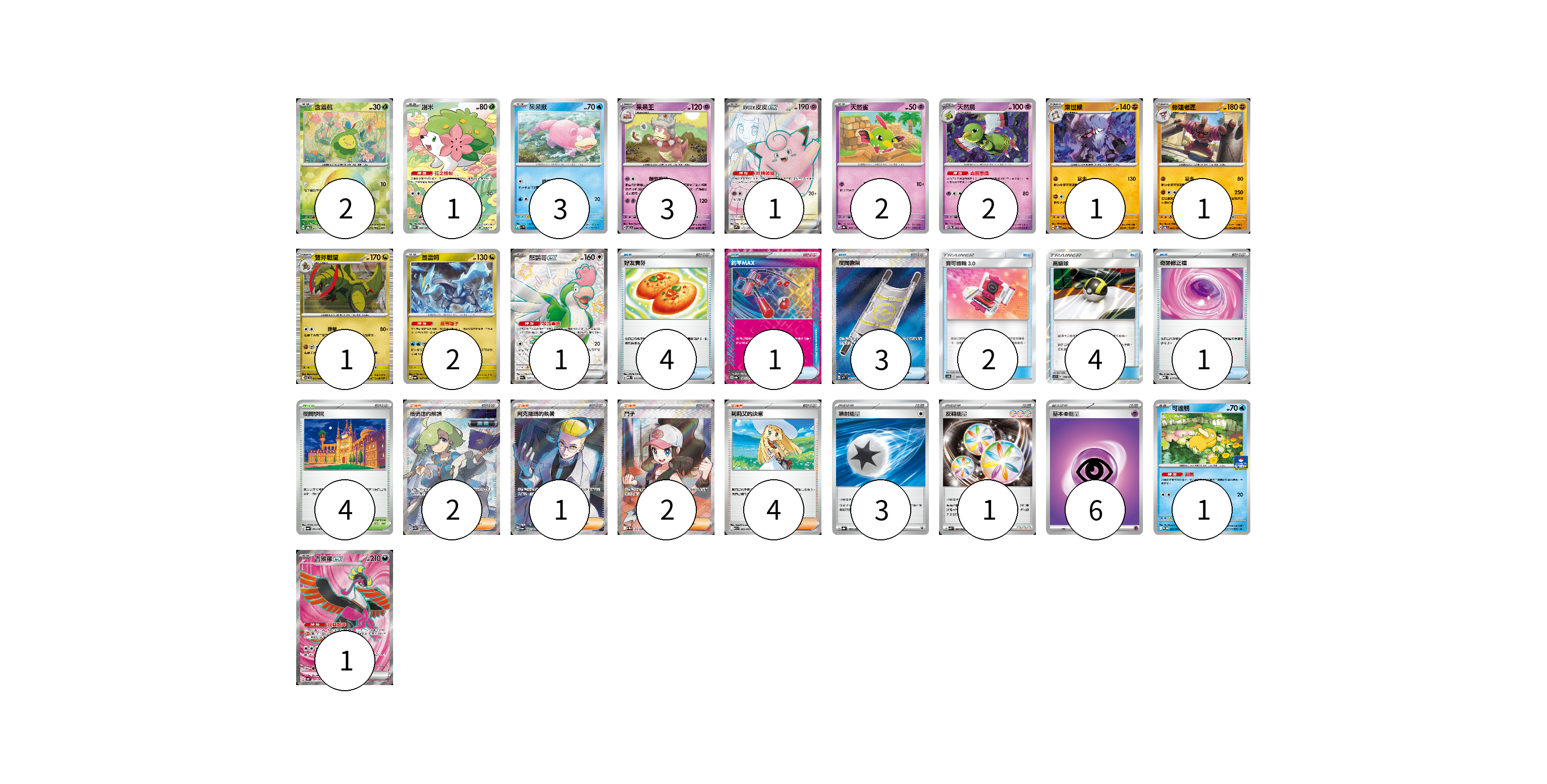牌組構築方案 以此牌組為基礎新構築牌組 顯示卡面 顯示列表 寶可夢卡(22) 2 1 3 3 1 2 2 1 1 1 2 1 1 1 物品卡(15) 4 1 3 2 4 1 支援者卡(9) 2 1 2 4 競技場卡(4) 4 能量卡(10) 3 1 6 寶可夢卡(22) 卡牌名稱 張數 卡牌名稱 張數 含羞苞 SV8a 001/187 02 謝米 SV9a 066/063 01 呆呆獸 SV1V 019/078 03 呆呆王 SV7 039/102 03 莉莉艾的皮皮ex SV9 115/100 01 天然雀 SV8a 060/187 02 天然鳥 SVEM 005/020 02 棄世猴 SV8 062/106 01 修建老匠 SV6 061/101 01 雙斧戰龍 SV11B 072/086 01 酋雷姆 SV6a 047/064 02 怒鸚哥ex SV4a 337/190 01 可達鴨 SV-P 220/SV-P 01 吉雉雞ex SV6a 081/064 01 物品卡(15) 卡牌名稱 張數 卡牌名稱 張數 好友寶芬 MBD 013/022 04 釣竿MAX SV8a 142/187 01 夜間擔架 M1L 083/063 03 寶可齒輪3.0 AS6b 190/194 02 高級球 AS5b 178/186 04 奇跡修正檔 MBD 017/022 01 支援者卡(9) 卡牌名稱 張數 卡牌名稱 張數 暗碼迷的解讀 SV5M 090/071 02 阿克羅瑪的執著 SV6a 083/064 01 鬥子 SV11W 166/086 02 莉莉艾的決意 M1L 062/063 04 競技場卡(4) 卡牌名稱 張數 卡牌名稱 張數 夜間學院 SV6a 064/064 04 能量卡(10) 卡牌名稱 張數 卡牌名稱 張數 噴射能量 SV8a 185/187 03 反轉能量 SVK 041/042 01 基本超能量 sv-p PSY 06 以此牌組為基礎新構築牌組 牌組編碼 wlSPDT-QqKROY-BujjAR copy 列印牌組單 牌組編碼已複製 分享至SNS