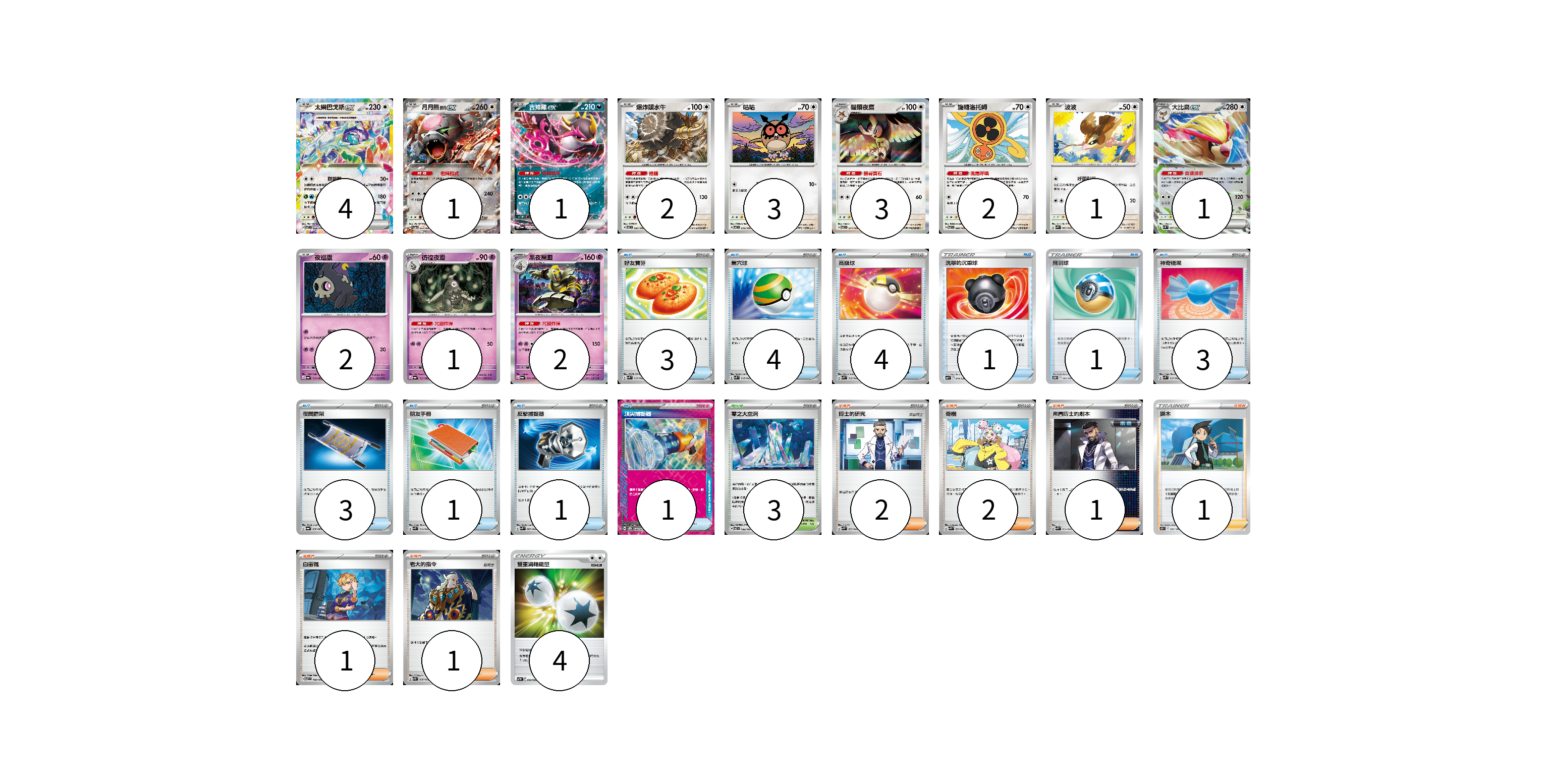 牌組構築方案 以此牌組為基礎新構築牌組 顯示卡面 顯示列表 寶可夢卡(23) 4 1 1 2 3 3 2 1 1 2 1 2 物品卡(22) 3 4 4 1 1 3 3 1 1 1 支援者卡(8) 2 2 1 1 1 1 競技場卡(3) 3 能量卡(4) 4 寶可夢卡(23) 卡牌名稱 張數 卡牌名稱 張數 太樂巴戈斯ex SV7 088/102 04 月月熊 赫月 ex SV5a 052/066 01 吉雉雞ex SV6a 038/064 01 爆炸頭水牛 SV7 081/102 02 咕咕 SV7 076/102 03 貓頭夜鷹 SV7 077/102 03 旋轉洛托姆 SV7 080/102 02 波波 SVK 003/042 01 大比鳥ex SVK 005/042 01 夜巡靈 SV6a 018/064 02 彷徨夜靈 SV6a 019/064 01 黑夜魔靈 SV6a 020/064 02 物品卡(22) 卡牌名稱 張數 卡牌名稱 張數 好友寶芬 SVK 015/042 03 巢穴球 SVK 016/042 04 高級球 SVK 018/042 04 洗翠的沉重球 SVF 019/038 01 飛羽球 S10D 063/067 01 神奇糖果 SVK 019/042 03 夜間擔架 SV6a 056/064 03 朋友手冊 SVK 014/042 01 反擊捕捉器 SVK 009/042 01 頂尖捕捉器 SV5M 062/071 01 支援者卡(8) 卡牌名稱 張數 卡牌名稱 張數 博士的研究 SVK 033/042 02 奇樹 SVK 031/042 02 弗圖博士的劇本 SVK 034/042 01 捩木 S11 097/100 01 白蕾雅 SV7 100/102 01 老大的指令 SVK 036/042 01 競技場卡(3) 卡牌名稱 張數 卡牌名稱 張數 零之大空洞 SV7 102/102 03 能量卡(4) 卡牌名稱 張數 卡牌名稱 張數 雙重渦輪能量 SVTM 022/022 04 以此牌組為基礎新構築牌組 牌組編碼 wlxwEZ-EYVZoC-zCXpcO copy 列印牌組單 牌組編碼已複製 分享至SNS