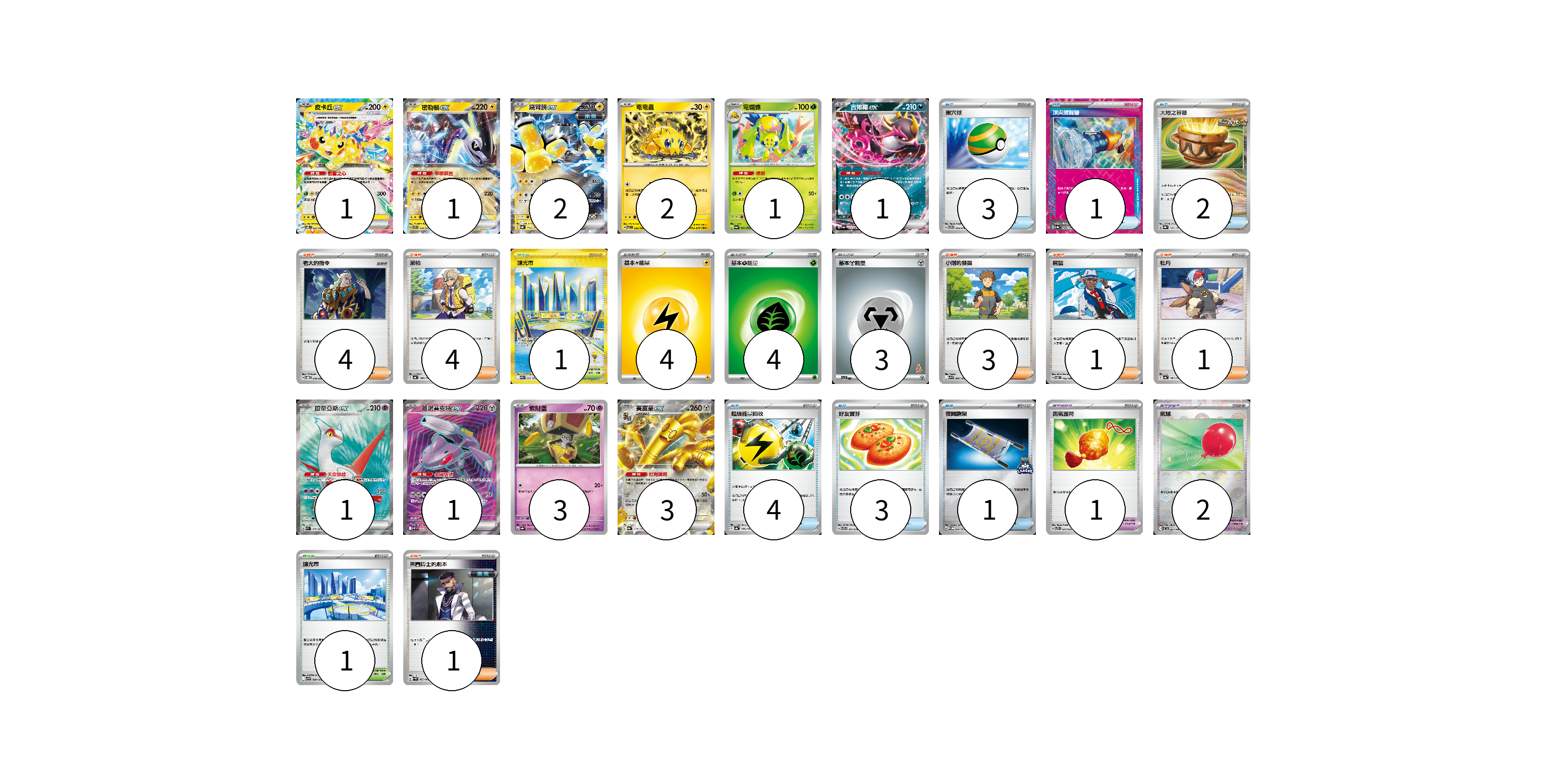牌組構築方案 以此牌組為基礎新構築牌組 顯示卡面 顯示列表 寶可夢卡(16) 1 1 2 2 1 1 1 1 3 3 寶可夢道具(3) 1 2 物品卡(14) 3 1 2 4 3 1 支援者卡(14) 4 4 3 1 1 1 競技場卡(2) 1 1 能量卡(11) 4 4 3 寶可夢卡(16) 卡牌名稱 張數 卡牌名稱 張數 皮卡丘ex SV8 033/106 01 密勒頓ex SVTR 008/021 01 鐵臂膀ex SV8a 054/187 02 電電蟲 SV7 032/102 02 電蜘蛛 SV6a 002/064 01 吉雉雞ex SV6a 038/064 01 拉帝亞斯ex SV7a 078/064 01 蓋諾賽克特ex SV11B 164/086 01 索財靈 SV8a 073/187 03 賽富豪ex SV8a 117/187 03 寶可夢道具(3) 卡牌名稱 張數 卡牌名稱 張數 勇氣護符 SVTS 017/022 01 氣球 SV11B 082/086 02 物品卡(14) 卡牌名稱 張數 卡牌名稱 張數 巢穴球 SVTG 012/019 03 頂尖捕捉器 SV8a 148/187 01 大地之容器 SV8a 143/187 02 超級能量回收 SV4a 157/190 04 好友寶芬 SVTG 011/019 03 夜間擔架 SV-P 204/SV-P 01 支援者卡(14) 卡牌名稱 張數 卡牌名稱 張數 老大的指令 SVOD 019/020 04 派帕 SV4a 180/190 04 小剛的發掘 SV9 096/100 03 席藍 SV8 102/106 01 牡丹 SV4a 182/190 01 弗圖博士的劇本 SV4M 065/066 01 競技場卡(2) 卡牌名稱 張數 卡牌名稱 張數 釀光市 SV9a 092/063 01 釀光市 SV9 098/100 01 能量卡(11) 卡牌名稱 張數 卡牌名稱 張數 基本【雷】能量 SVF LIG 04 基本【草】能量 SVTM GRA 04 基本【鋼】能量 SVI MET 03 以此牌組為基礎新構築牌組 牌組編碼 wpCapn-YRMqeo-WDaiTA copy 列印牌組單 牌組編碼已複製 分享至SNS