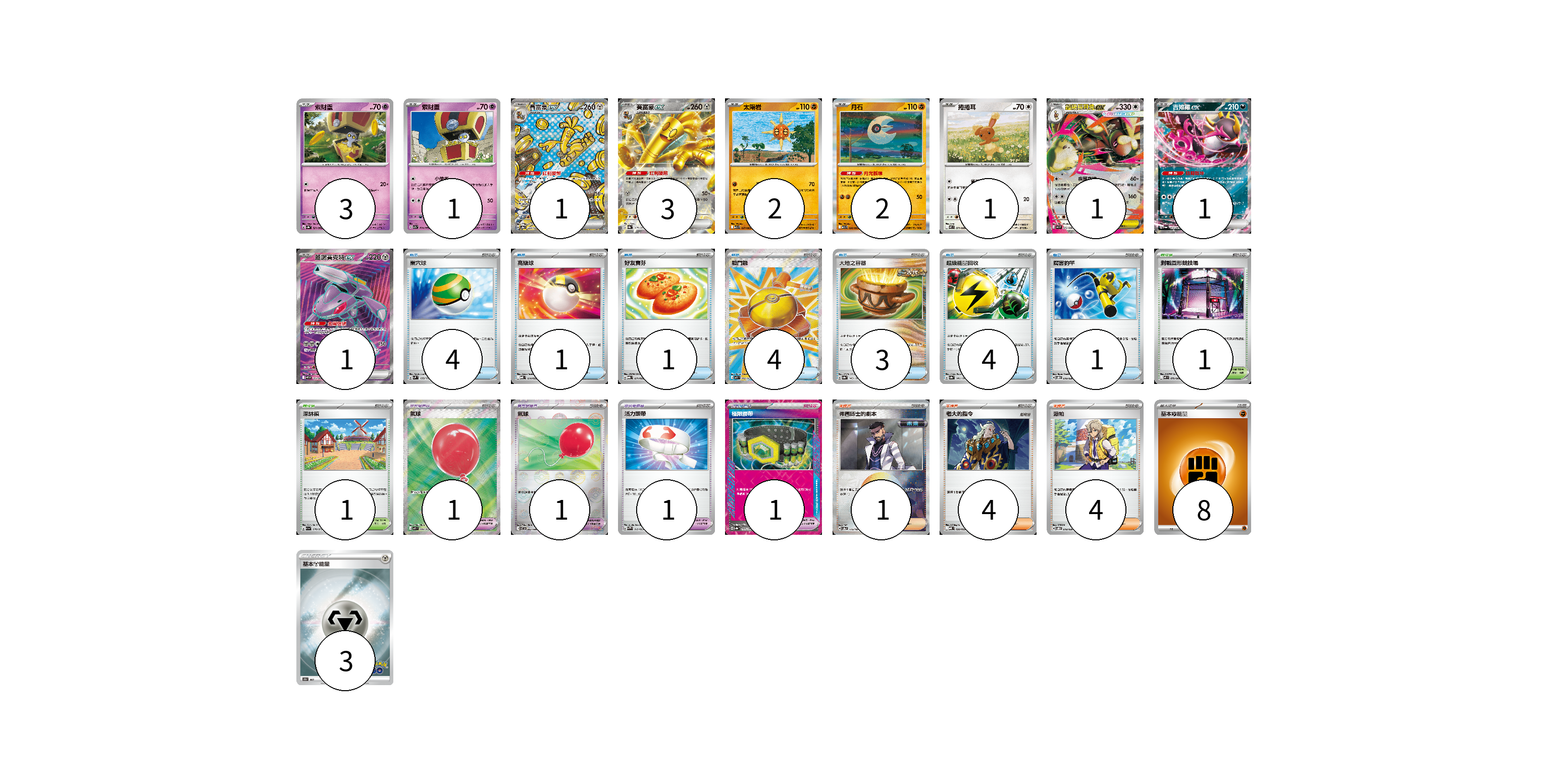 牌組構築方案 以此牌組為基礎新構築牌組 顯示卡面 顯示列表 寶可夢卡(16) 3 1 1 3 2 2 1 1 1 1 寶可夢道具(4) 1 1 1 1 物品卡(18) 4 1 1 4 3 4 1 支援者卡(9) 1 4 4 競技場卡(2) 1 1 能量卡(11) 8 3 寶可夢卡(16) 卡牌名稱 張數 卡牌名稱 張數 索財靈 SV3a 021/062 03 索財靈 SV7a 024/064 01 賽富豪ex SV8a 220/187 01 賽富豪ex SV8a 117/187 03 太陽岩 M1L 027/063 02 月石 M1L 026/063 02 捲捲耳 M2 071/080 01 超級長耳兔ex M2 072/080 01 吉雉雞ex SV6a 038/064 01 蓋諾賽克特ex SV11B 164/086 01 寶可夢道具(4) 卡牌名稱 張數 卡牌名稱 張數 氣球 M1L 084/063 01 氣球 SV11B 082/086 01 活力頭帶 SVAW 019/023 01 極限腰帶 SV8a 159/187 01 物品卡(18) 卡牌名稱 張數 卡牌名稱 張數 巢穴球 SVM 133/175 04 高級球 MBD 014/022 01 好友寶芬 MBG 011/022 01 戰鬥鑼 M1L 082/063 04 大地之容器 SV8a 143/187 03 超級能量回收 SV8a 141/187 04 厲害釣竿 SVOD 010/020 01 支援者卡(9) 卡牌名稱 張數 卡牌名稱 張數 弗圖博士的劇本 SV8a 175/187 01 老大的指令 MBD 020/022 04 派帕 SVOD 018/020 04 競技場卡(2) 卡牌名稱 張數 卡牌名稱 張數 對戰圓形競技場 M2 079/080 01 深缽鎮 SV1a 070/073 01 能量卡(11) 卡牌名稱 張數 卡牌名稱 張數 基本鬥能量 sv-p FIG 08 基本鋼能量 S10b MET 03 以此牌組為基礎新構築牌組 牌組編碼 wqFpfI-YrKqnt-EGvJFH copy 列印牌組單 牌組編碼已複製 分享至SNS