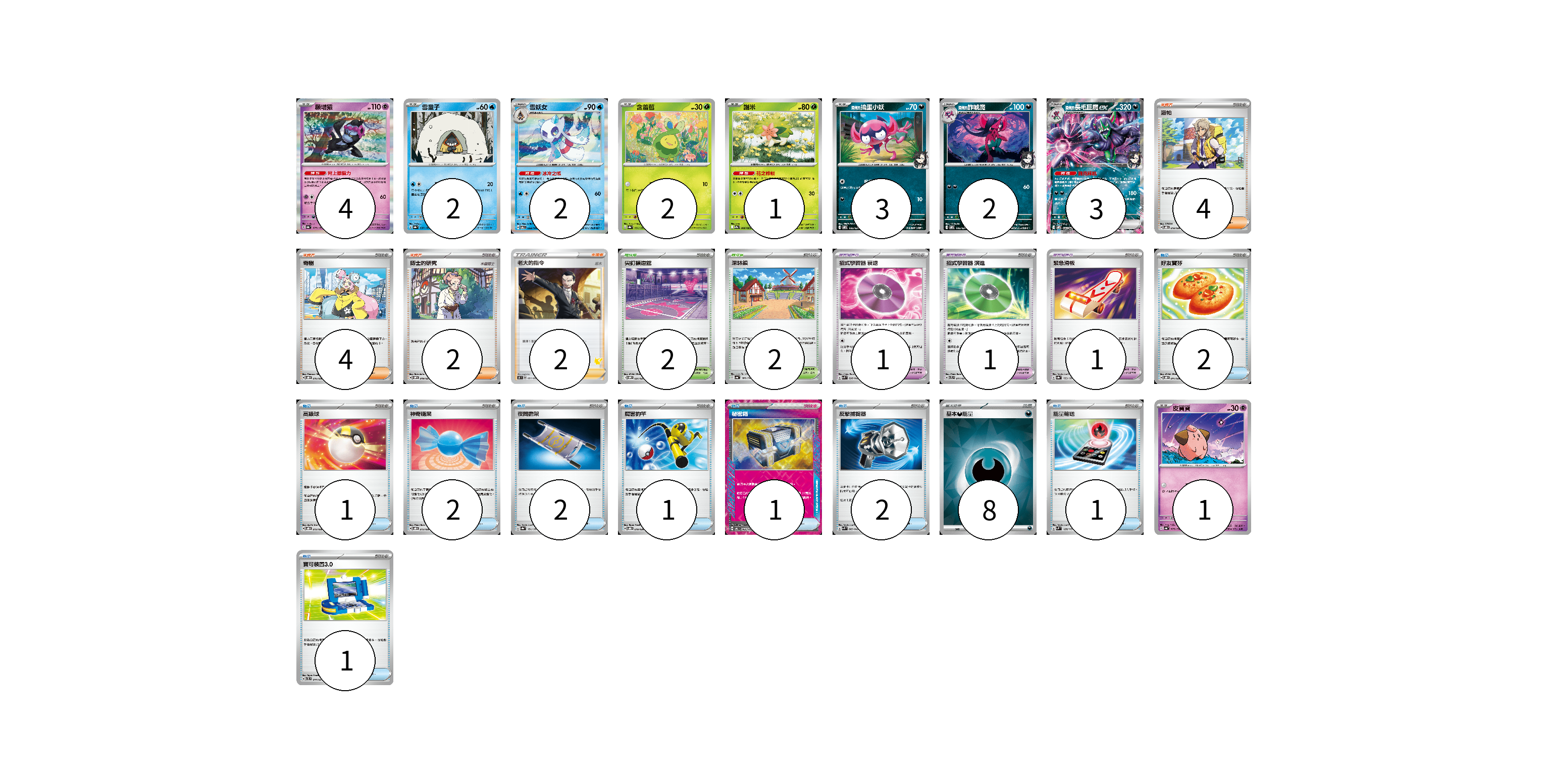 牌組構築方案 以此牌組為基礎新構築牌組 顯示卡面 顯示列表 寶可夢卡(20) 4 2 2 2 1 3 2 3 1 寶可夢道具(3) 1 1 1 物品卡(13) 2 1 2 2 1 1 2 1 1 支援者卡(12) 4 4 2 2 競技場卡(4) 2 2 能量卡(8) 8 寶可夢卡(20) 卡牌名稱 張數 卡牌名稱 張數 願增猿 SV8a 075/187 04 雪童子 SV8a 037/187 02 雪妖女 SV6 033/101 02 含羞苞 SV8a 001/187 02 謝米 SV9a 006/063 01 <瑪俐的>搗蛋小妖 SVOM 005/021 03 <瑪俐的>詐唬魔 SVOM 006/021 02 <瑪俐的>長毛巨魔ex SVOM 007/021 03 皮寶寶 SV4a 077/190 01 寶可夢道具(3) 卡牌名稱 張數 卡牌名稱 張數 招式學習器 衰退 SVK 026/042 01 招式學習器 演進 SVTL 017/021 01 緊急滑板 SV8a 153/187 01 物品卡(13) 卡牌名稱 張數 卡牌名稱 張數 好友寶芬 SVOD 011/020 02 高級球 SVOD 012/020 01 神奇糖果 SVOD 013/020 02 夜間擔架 SV8a 151/187 02 厲害釣竿 SVOD 010/020 01 秘密箱 SV6 092/101 01 反擊捕捉器 SVK 009/042 02 能量輸送 SVM 128/175 01 寶可裝置3.0 SVTL 014/021 01 支援者卡(12) 卡牌名稱 張數 卡牌名稱 張數 派帕 SVOD 018/020 04 奇樹 SVOD 016/020 04 博士的研究 SVOM 019/021 02 老大的指令(坂木) SH 051/053 02 競技場卡(4) 卡牌名稱 張數 卡牌名稱 張數 尖釘鎮道館 SVOM 021/021 02 深缽鎮 SV4a 185/190 02 能量卡(8) 卡牌名稱 張數 卡牌名稱 張數 基本【惡】能量 SVOM DAR 08 以此牌組為基礎新構築牌組 牌組編碼 wqLWOP-FLMwSd-mIKfni copy 列印牌組單 牌組編碼已複製 分享至SNS