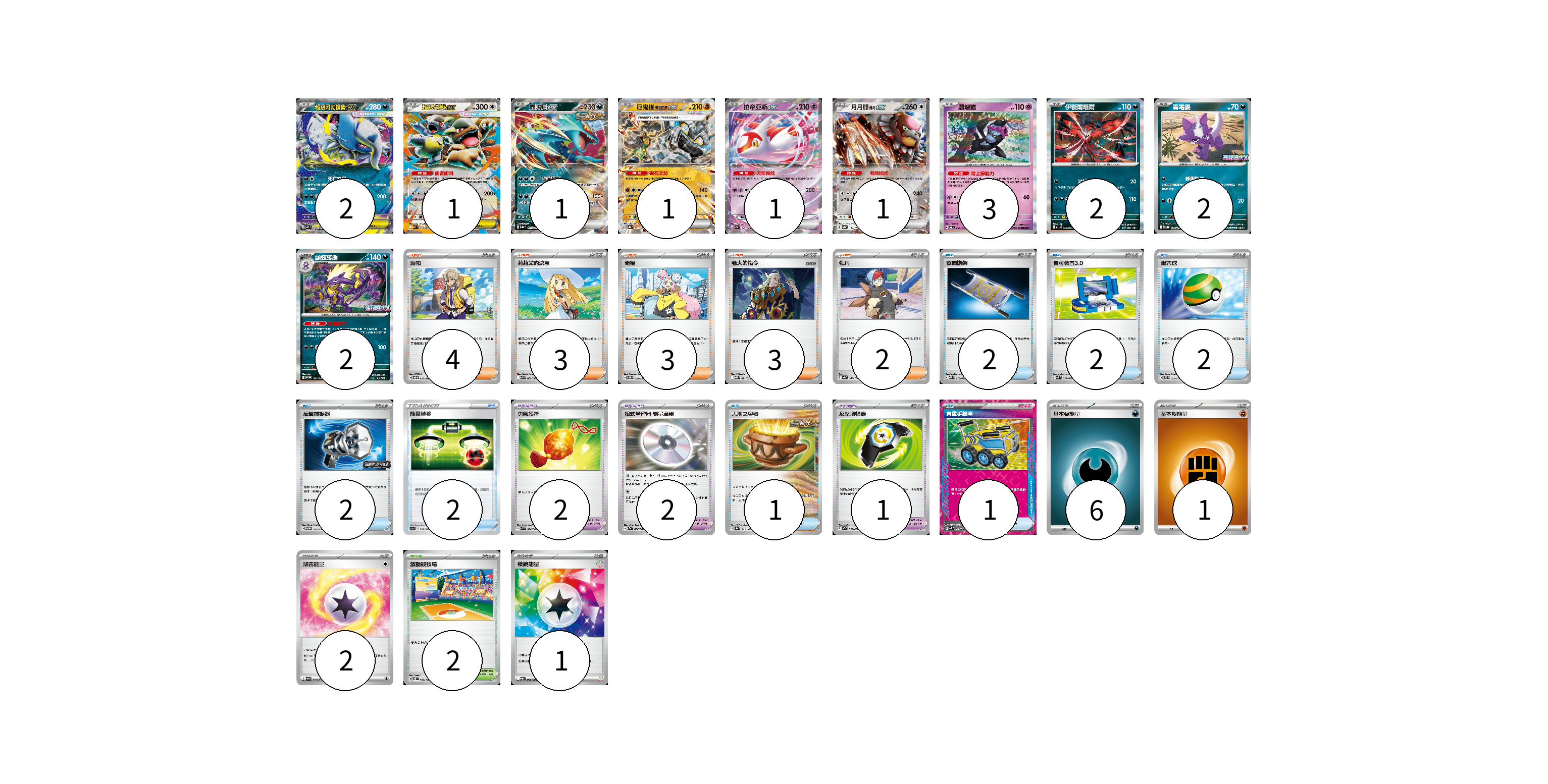 牌組構築方案 以此牌組為基礎新構築牌組 顯示卡面 顯示列表 寶可夢卡(16) 2 1 1 1 1 1 3 2 2 2 寶可夢道具(5) 2 2 1 物品卡(12) 2 2 2 2 2 1 1 支援者卡(15) 4 3 3 3 2 競技場卡(2) 2 能量卡(10) 6 1 2 1 寶可夢卡(16) 卡牌名稱 張數 卡牌名稱 張數 超級阿勃梭魯ex M1L 038/063 02 超級袋獸ex M1S 051/063 01 轟鳴月ex SV8a 101/187 01 厄鬼椪 礎石面具ex SV8a 091/187 01 拉帝亞斯ex SV7a 019/064 01 月月熊 赫月ex SV8a 134/187 01 願增猿 SV6 055/101 03 伊裴爾塔爾 M1L 040/063 02 毒電嬰 M-P 027/M-P 02 顫弦蠑螈 M-P 031/M-P 02 寶可夢道具(5) 卡牌名稱 張數 卡牌名稱 張數 勇氣護符 SVK 024/042 02 招式學習器 能量渦輪 SV3a 056/062 02 反擊增幅器 SV7a 059/064 01 物品卡(12) 卡牌名稱 張數 卡牌名稱 張數 夜間擔架 MBD 016/022 02 寶可裝置3.0 SVK 021/042 02 巢穴球 SVTG 012/019 02 反擊捕捉器 SV-P 136/SV-P 02 能量轉移 S11a 059/068 02 大地之容器 SV8a 143/187 01 貴重手推車 SVK 020/042 01 支援者卡(15) 卡牌名稱 張數 卡牌名稱 張數 派帕 SVOD 018/020 04 莉莉艾的決意 M1L 062/063 03 奇樹 SVOM 018/021 03 老大的指令 MBG 021/022 03 牡丹 SV4a 182/190 02 競技場卡(2) 卡牌名稱 張數 卡牌名稱 張數 激動競技場 SV8 105/106 02 能量卡(10) 卡牌名稱 張數 卡牌名稱 張數 基本惡能量 sv-p DAR 06 基本鬥能量 sv-p FIG 01 薄霧能量 SV5M 071/071 02 稜鏡能量 SV11B 086/086 01 以此牌組為基礎新構築牌組 牌組編碼 wqTigB-ysMYHJ-feyrpv copy 列印牌組單 牌組編碼已複製 分享至SNS