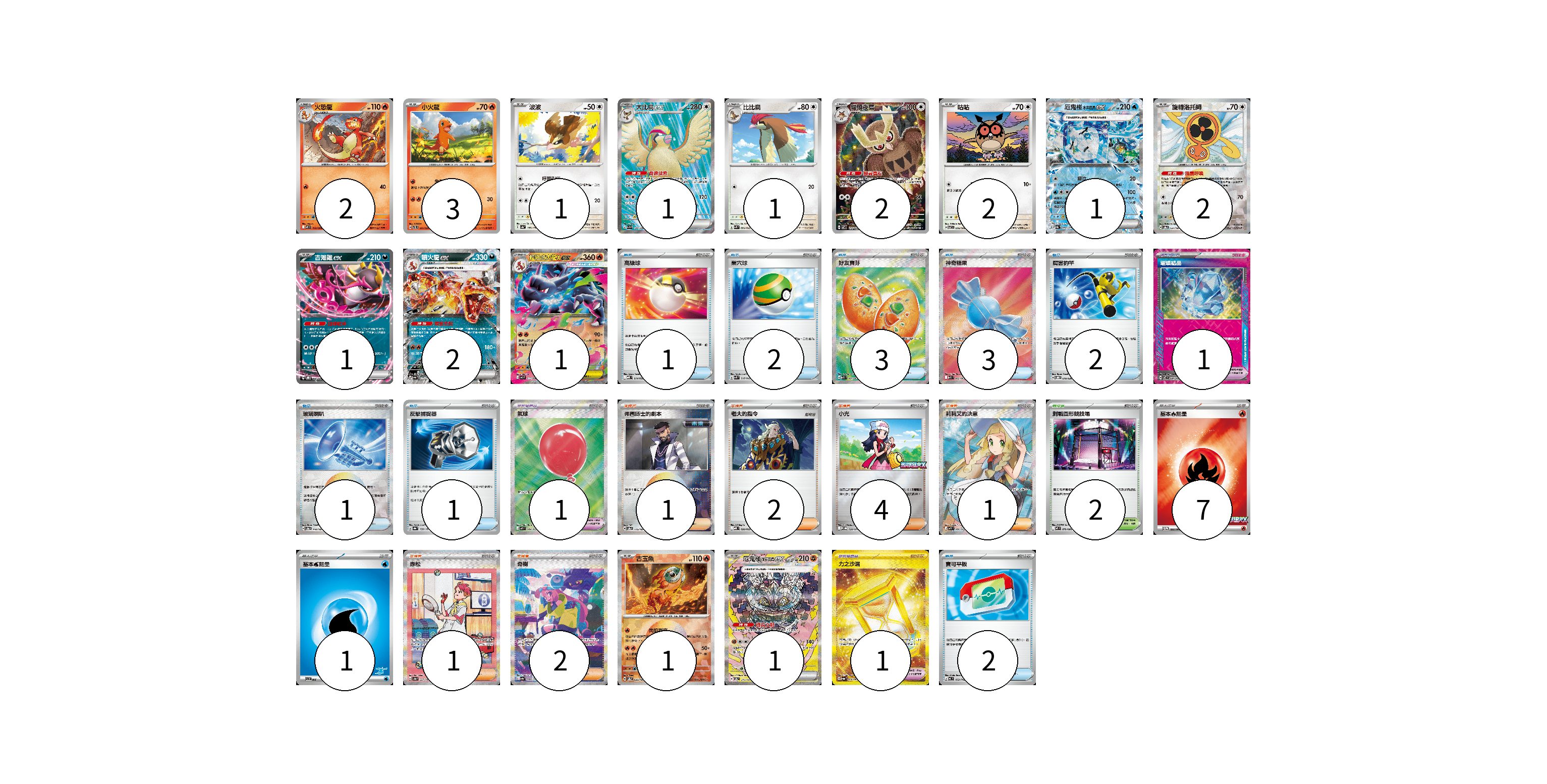 牌組構築方案 以此牌組為基礎新構築牌組 顯示卡面 顯示列表 寶可夢卡(21) 2 3 1 1 1 2 2 1 2 1 2 1 1 1 寶可夢道具(3) 1 1 1 物品卡(15) 1 2 3 3 2 1 1 2 支援者卡(11) 1 2 4 1 1 2 競技場卡(2) 2 能量卡(8) 7 1 寶可夢卡(21) 卡牌名稱 張數 卡牌名稱 張數 火恐龍 M2 012/080 02 小火龍 SVTL 001/021 03 波波 SV4a 137/190 01 大比鳥ex SV3 128/108 01 比比鳥 SVK 004/042 01 貓頭夜鷹 SV7 114/102 02 咕咕 SV7 076/102 02 厄鬼椪 水井面具ex SV8a 050/187 01 旋轉洛托姆 SV8a 131/187 02 吉雉雞ex SVOD 004/020 01 噴火龍ex SV4a 115/190 02 超級噴火龍Xex M2 013/080 01 古玉魚 SV8a 025/187 01 厄鬼椪 礎石面具ex SV8a 216/187 01 寶可夢道具(3) 卡牌名稱 張數 卡牌名稱 張數 璀璨結晶 SV7 094/102 01 氣球 M1L 084/063 01 力之沙漏 SV6a 094/064 01 物品卡(15) 卡牌名稱 張數 卡牌名稱 張數 高級球 MBD 014/022 01 巢穴球 SVK 016/042 02 好友寶芬 M1S 081/063 03 神奇糖果 M1S 082/063 03 厲害釣竿 SVOD 010/020 02 玻璃喇叭 SV8a 140/187 01 反擊捕捉器 SV8a 139/187 01 寶可平板 MC 662/742 02 支援者卡(11) 卡牌名稱 張數 卡牌名稱 張數 弗圖博士的劇本 SV8a 175/187 01 老大的指令 MBD 020/022 02 小光 M-P 028/M-P 04 莉莉艾的決意 M1L 086/063 01 赤松 SV8a 227/187 01 奇樹 SV4a 350/190 02 競技場卡(2) 卡牌名稱 張數 卡牌名稱 張數 對戰圓形競技場 M2 079/080 02 能量卡(8) 卡牌名稱 張數 卡牌名稱 張數 基本【火】能量 M-P 032/M-P 07 基本【水】能量 SVI WAT 01 以此牌組為基礎新構築牌組 牌組編碼 wrIlXA-HGLKLA-qyxhSl copy 列印牌組單 牌組編碼已複製 分享至SNS