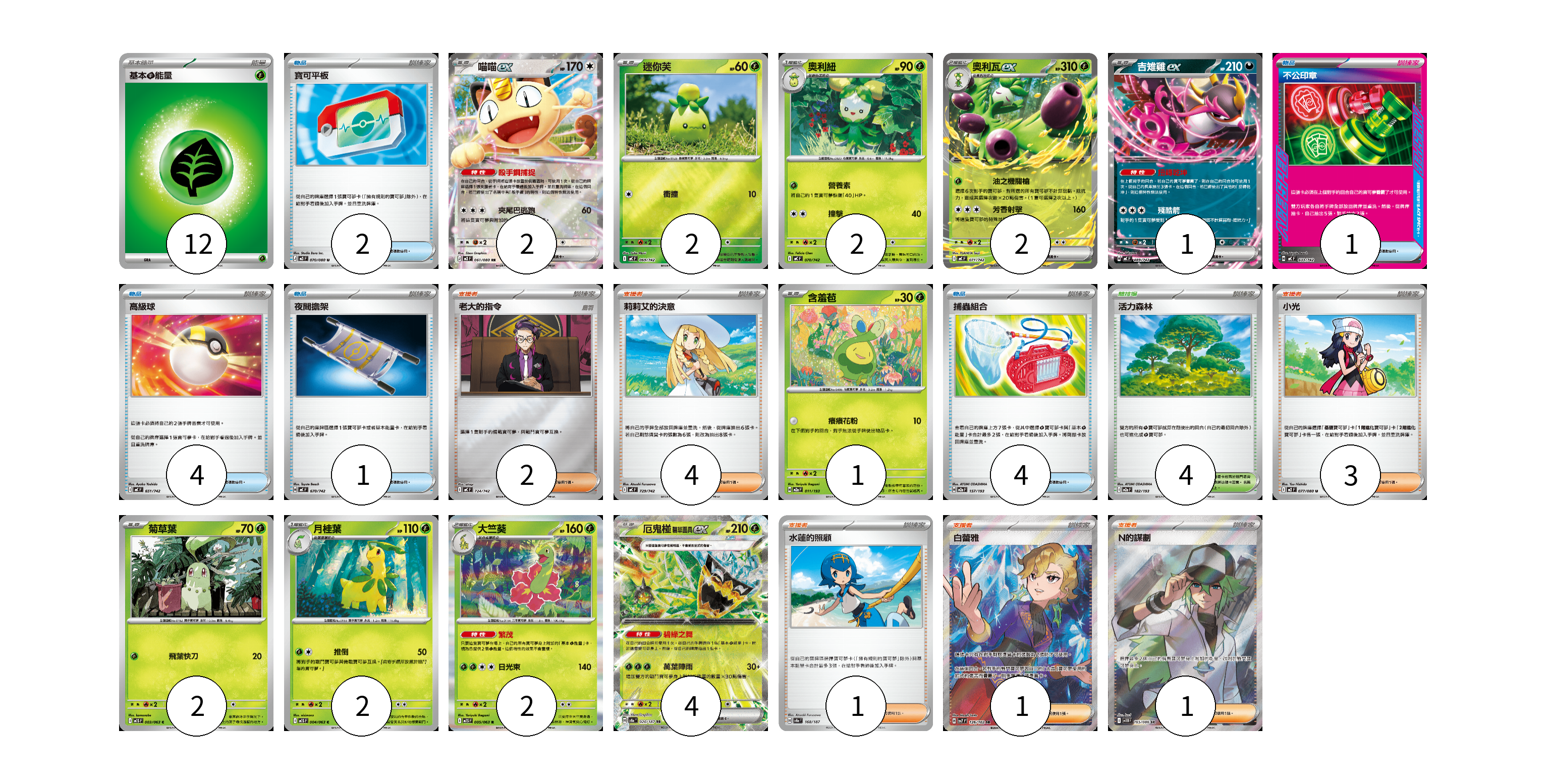 牌組構築方案 以此牌組為基礎新構築牌組 顯示卡面 顯示列表 寶可夢卡(20) 2 2 2 2 1 1 2 2 2 4 物品卡(12) 2 1 4 1 4 支援者卡(12) 2 4 3 1 1 1 競技場卡(4) 4 能量卡(12) 12 寶可夢卡(20) 卡牌名稱 張數 卡牌名稱 張數 喵喵ex M3 061/080 02 迷你芙 MC 069/742 02 奧利紐 MC 070/742 02 奧利瓦ex MC 071/742 02 吉雉雞ex MC 489/742 01 含羞苞 M2a 011/193 01 菊草葉 M1S 003/063 02 月桂葉 M1S 004/063 02 大竺葵 M1S 005/063 02 厄鬼椪 碧草面具ex SV8a 020/187 04 物品卡(12) 卡牌名稱 張數 卡牌名稱 張數 寶可平板 M3 070/080 02 不公印章 MC 633/742 01 高級球 MC 651/742 04 夜間擔架 MC 670/742 01 捕蟲組合 M2a 157/193 04 支援者卡(12) 卡牌名稱 張數 卡牌名稱 張數 老大的指令 MC 724/742 02 莉莉艾的決意 MC 729/742 04 小光 M2 077/080 03 水蓮的照顧 SV8a 168/187 01 白蕾雅 SV7 126/102 01 N的謀劃 SV11B 165/086 01 競技場卡(4) 卡牌名稱 張數 卡牌名稱 張數 活力森林 M2a 182/193 04 能量卡(12) 卡牌名稱 張數 卡牌名稱 張數 基本【草】能量 MJ GRA 12 以此牌組為基礎新構築牌組 牌組編碼 wrpcKW-WsYkYw-qsEYJY copy 列印牌組單 牌組編碼已複製 分享至SNS