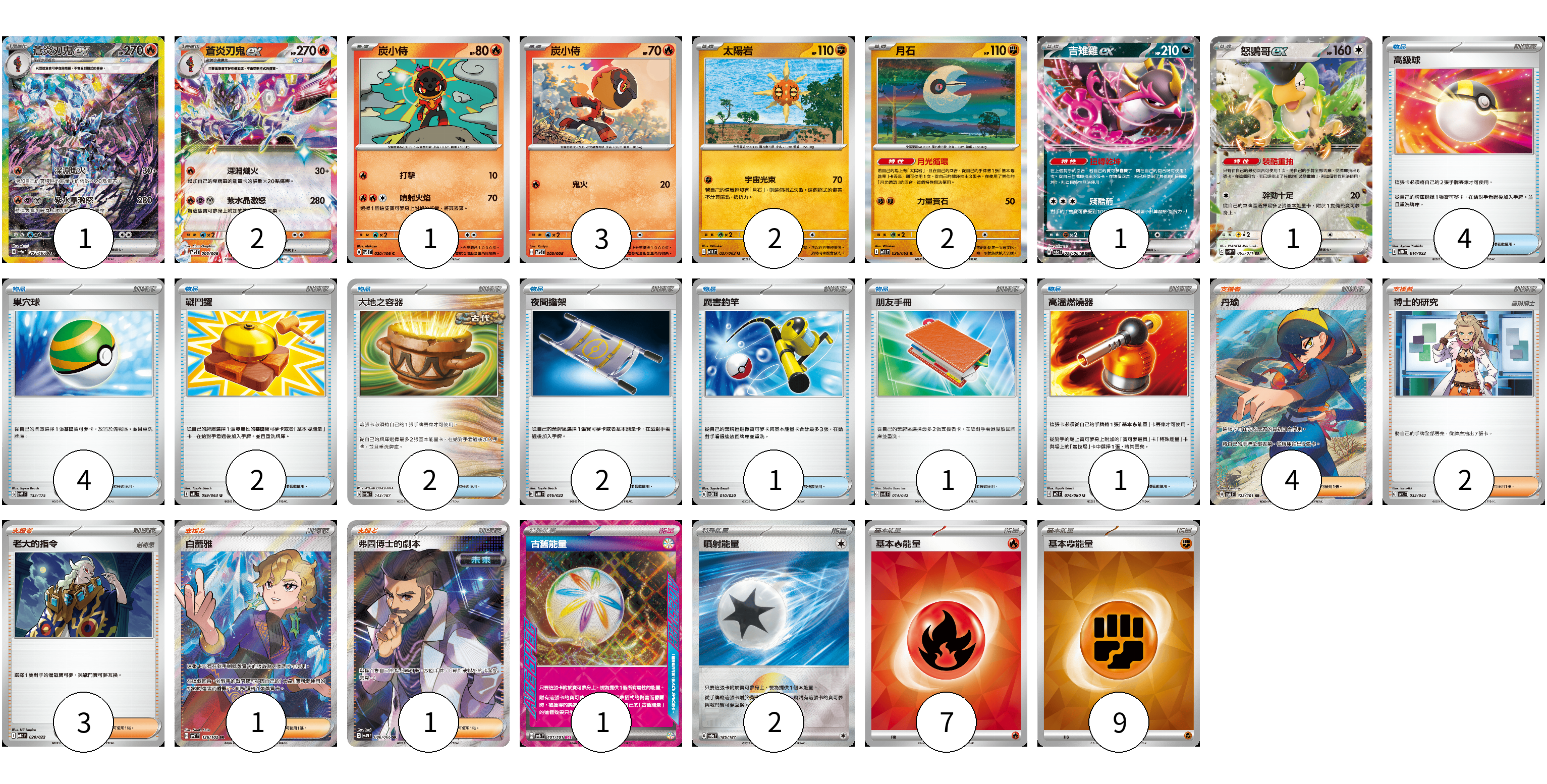 牌組構築方案 以此牌組為基礎新構築牌組 顯示卡面 顯示列表 寶可夢卡(13) 1 2 1 3 2 2 1 1 物品卡(17) 4 4 2 2 2 1 1 1 支援者卡(11) 4 2 3 1 1 能量卡(19) 1 2 7 9 寶可夢卡(13) 卡牌名稱 張數 卡牌名稱 張數 蒼炎刃鬼ex SV8a 203/187 01 蒼炎刃鬼ex SVPS 006/008 02 炭小侍 SV8 020/106 01 炭小侍 SVPS 005/008 03 太陽岩 M1L 027/063 02 月石 M1L 026/063 02 吉雉雞ex SV6a 038/064 01 怒鸚哥ex SV2P 065/071 01 物品卡(17) 卡牌名稱 張數 卡牌名稱 張數 高級球 MBD 014/022 04 巢穴球 SVM 133/175 04 戰鬥鑼 M1L 059/063 02 大地之容器 SV8a 143/187 02 夜間擔架 MBD 016/022 02 厲害釣竿 SVOD 010/020 01 朋友手冊 SVK 014/042 01 高溫燃燒器 M2 074/080 01 支援者卡(11) 卡牌名稱 張數 卡牌名稱 張數 丹瑜 SV6 123/101 04 博士的研究 SVK 032/042 02 老大的指令 MBD 020/022 03 白蕾雅 SV7 126/102 01 弗圖博士的劇本 SV4M 086/066 01 能量卡(19) 卡牌名稱 張數 卡牌名稱 張數 古舊能量 SV6 101/101 01 噴射能量 SV8a 185/187 02 基本【火】能量 SVQL FIR 07 基本【鬥】能量 SVM FIG 09 以此牌組為基礎新構築牌組 牌組編碼 wtowgt-FpwOHJ-ZDLIeQ copy 列印牌組單 牌組編碼已複製 分享至SNS