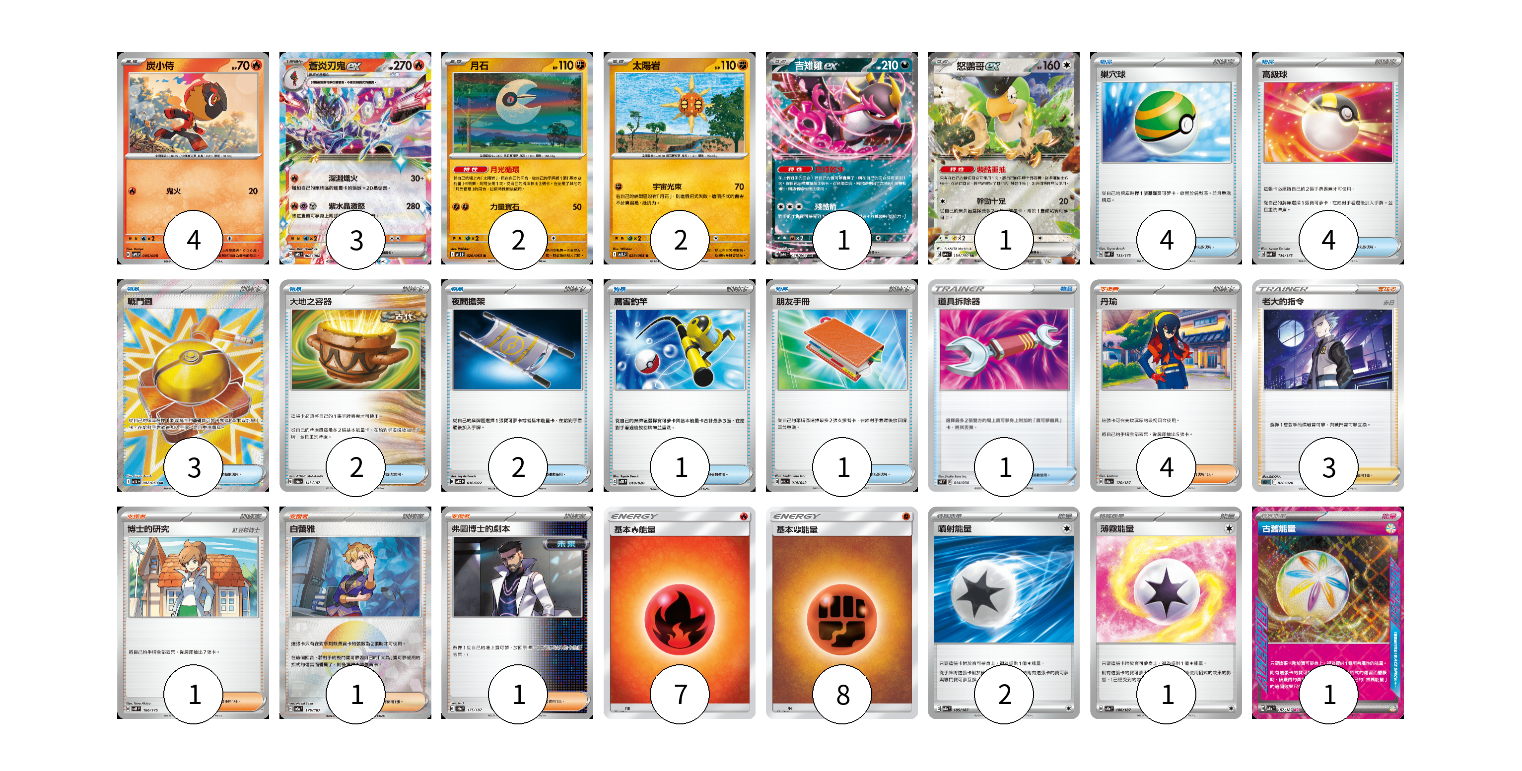牌組構築方案 以此牌組為基礎新構築牌組 顯示卡面 顯示列表 寶可夢卡(13) 4 3 2 2 1 1 物品卡(18) 4 4 3 2 2 1 1 1 支援者卡(10) 4 3 1 1 1 能量卡(19) 7 8 2 1 1 寶可夢卡(13) 卡牌名稱 張數 卡牌名稱 張數 炭小侍 SVPS 005/008 04 蒼炎刃鬼ex SVPS 006/008 03 月石 M1L 026/063 02 太陽岩 M1L 027/063 02 吉雉雞ex SV6a 038/064 01 怒鸚哥ex SV4a 154/190 01 物品卡(18) 卡牌名稱 張數 卡牌名稱 張數 巢穴球 SVM 133/175 04 高級球 SVM 134/175 04 戰鬥鑼 M1L 082/063 03 大地之容器 SV8a 143/187 02 夜間擔架 MBD 016/022 02 厲害釣竿 SVOD 010/020 01 朋友手冊 SVK 014/042 01 道具拆除器 SK 014/030 01 支援者卡(10) 卡牌名稱 張數 卡牌名稱 張數 丹瑜 SV8a 170/187 04 老大的指令(赤日) SLD 020/020 03 博士的研究 SVM 166/175 01 白蕾雅 SV8a 176/187 01 弗圖博士的劇本 SV8a 175/187 01 能量卡(19) 卡牌名稱 張數 卡牌名稱 張數 基本火能量 AS6D FIR 07 基本鬥能量 AS6D FIG 08 噴射能量 SV8a 185/187 02 薄霧能量 SV8a 186/187 01 古舊能量 SV8a 187/187 01 以此牌組為基礎新構築牌組 牌組編碼 wuwglF-hzfjUI-YvydsY copy 列印牌組單 牌組編碼已複製 分享至SNS