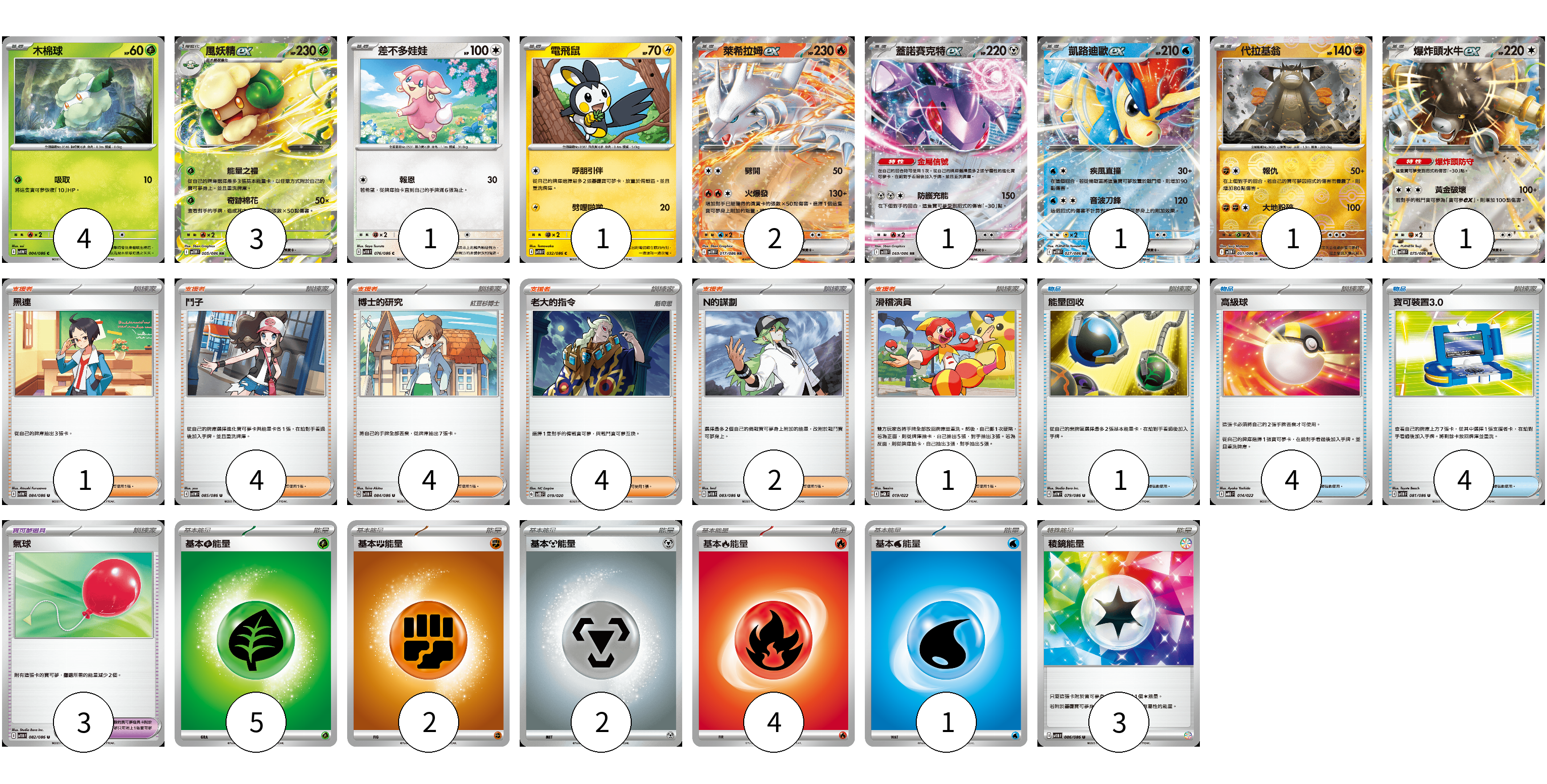 牌組構築方案 以此牌組為基礎新構築牌組 顯示卡面 顯示列表 寶可夢卡(15) 4 3 1 1 2 1 1 1 1 寶可夢道具(3) 3 物品卡(9) 1 4 4 支援者卡(16) 1 4 4 4 2 1 能量卡(17) 5 2 2 4 1 3 寶可夢卡(15) 卡牌名稱 張數 卡牌名稱 張數 木棉球 SV11W 004/086 04 風妖精ex SV11W 005/086 03 差不多娃娃 SV11B 076/086 01 電飛鼠 SV11B 032/086 01 萊希拉姆ex SV11W 017/086 02 蓋諾賽克特ex SV11B 069/086 01 凱路迪歐ex SV11W 027/086 01 代拉基翁 SV11W 051/086 01 爆炸頭水牛ex SV11W 075/086 01 寶可夢道具(3) 卡牌名稱 張數 卡牌名稱 張數 氣球 SV11B 082/086 03 物品卡(9) 卡牌名稱 張數 卡牌名稱 張數 能量回收 SV11W 079/086 01 高級球 MBD 014/022 04 寶可裝置3.0 SV11B 081/086 04 支援者卡(16) 卡牌名稱 張數 卡牌名稱 張數 黑連 SV11W 084/086 01 鬥子 SV11W 085/086 04 博士的研究 SV11B 084/086 04 老大的指令 SVOD 019/020 04 N的謀劃 SV11B 083/086 02 滑稽演員 SVQL 019/022 01 能量卡(17) 卡牌名稱 張數 卡牌名稱 張數 基本【草】能量 M-P GRA 05 基本【鬥】能量 M-P FIG 02 基本【鋼】能量 M-P MET 02 基本【火】能量 SVTL FIR 04 基本【水】能量 SVF WAT 01 稜鏡能量 SV11B 086/086 03 以此牌組為基礎新構築牌組 牌組編碼 wwLmtI-xUHlUe-iHwMgC copy 列印牌組單 牌組編碼已複製 分享至SNS