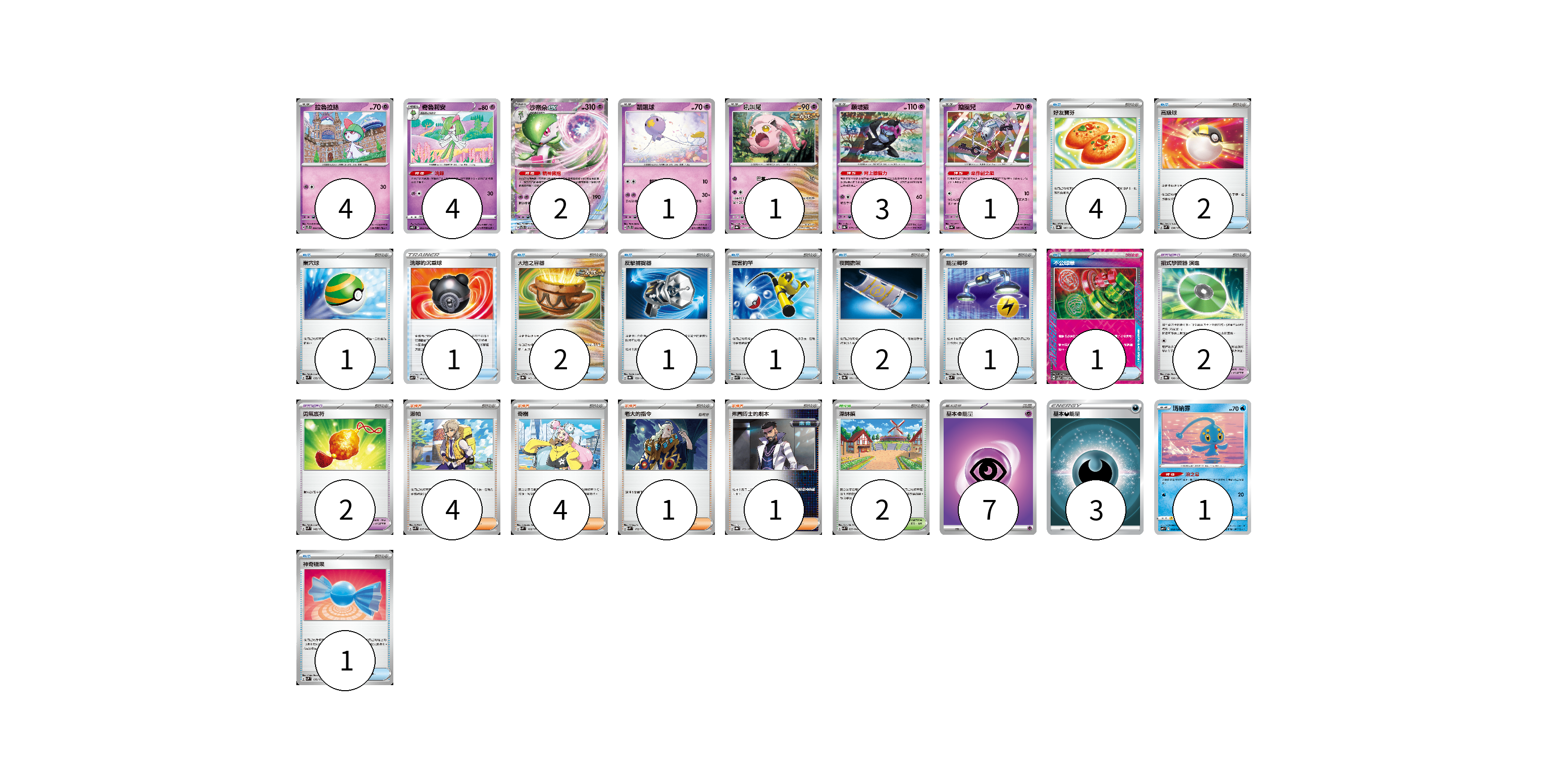 牌組構築方案 以此牌組為基礎新構築牌組 顯示卡面 顯示列表 寶可夢卡(17) 4 4 2 1 1 3 1 1 寶可夢道具(4) 2 2 物品卡(17) 4 2 1 1 2 1 1 2 1 1 1 支援者卡(10) 4 4 1 1 競技場卡(2) 2 能量卡(10) 7 3 寶可夢卡(17) 卡牌名稱 張數 卡牌名稱 張數 拉魯拉絲 SVTS 002/022 04 奇魯莉安 SVTS 003/022 04 沙奈朵ex SVTS 004/022 02 飄飄球 SVTS 005/022 01 吼叫尾 SV8a 071/187 01 願增猿 SV8a 075/187 03 鑰圈兒 SV4a 087/190 01 瑪納霏 SVF 003/038 01 寶可夢道具(4) 卡牌名稱 張數 卡牌名稱 張數 招式學習器 演進 SV8a 160/187 02 勇氣護符 SVM 142/175 02 物品卡(17) 卡牌名稱 張數 卡牌名稱 張數 好友寶芬 SV8a 147/187 04 高級球 SVM 134/175 02 巢穴球 SVM 133/175 01 洗翠的沉重球 SVF 019/038 01 大地之容器 SV8a 143/187 02 反擊捕捉器 SV8a 139/187 01 厲害釣竿 SVK 011/042 01 夜間擔架 SV8a 151/187 02 能量轉移 SVM 127/175 01 不公印章 SV5a 053/066 01 神奇糖果 SVM 135/175 01 支援者卡(10) 卡牌名稱 張數 卡牌名稱 張數 派帕 SVK 035/042 04 奇樹 SVM 160/175 04 老大的指令 SVM 172/175 01 弗圖博士的劇本 SV8a 175/187 01 競技場卡(2) 卡牌名稱 張數 卡牌名稱 張數 深缽鎮 SVK 039/042 02 能量卡(10) 卡牌名稱 張數 卡牌名稱 張數 基本超能量 sv-p PSY 07 基本惡能量 SLD DAR 03 以此牌組為基礎新構築牌組 牌組編碼 wwNOIw-SaGbUb-ZiHvcl copy 列印牌組單 牌組編碼已複製 分享至SNS