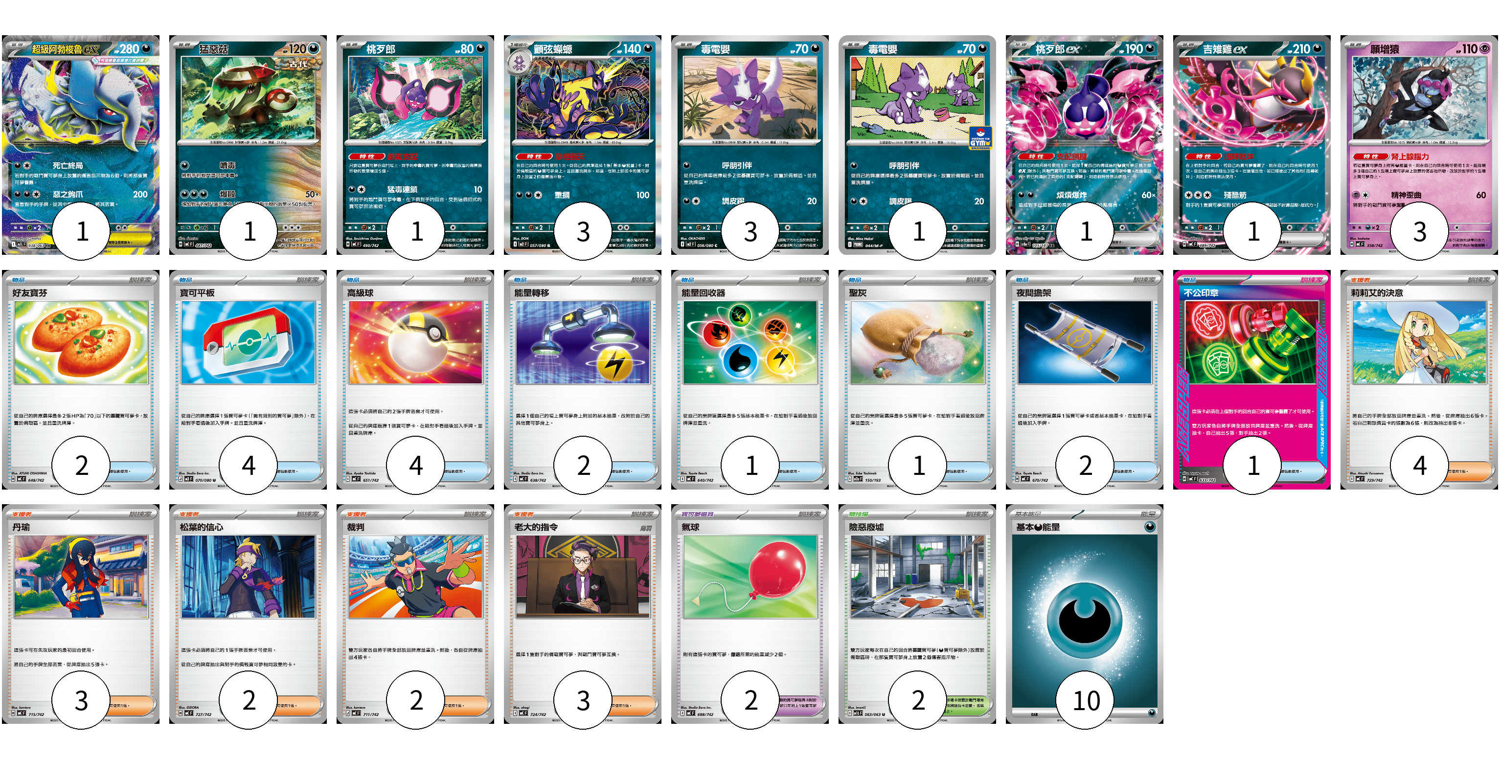 牌組構築方案 以此牌組為基礎新構築牌組 顯示卡面 顯示列表 寶可夢卡(15) 1 1 1 3 3 1 1 1 3 寶可夢道具(2) 2 物品卡(17) 2 4 4 2 1 1 2 1 支援者卡(14) 4 3 2 2 3 競技場卡(2) 2 能量卡(10) 10 寶可夢卡(15) 卡牌名稱 張數 卡牌名稱 張數 超級阿勃梭魯ex M1L 038/063 01 猛惡菇 MC 487/742 01 桃歹郎 MC 490/742 01 顫弦蠑螈 M2 057/080 03 毒電嬰 M2 056/080 03 毒電嬰 M-P 044/M-P 01 桃歹郎ex SV8a 105/187 01 吉雉雞ex MC 489/742 01 願增猿 MC 358/742 03 寶可夢道具(2) 卡牌名稱 張數 卡牌名稱 張數 氣球 MC 688/742 02 物品卡(17) 卡牌名稱 張數 卡牌名稱 張數 好友寶芬 MC 648/742 02 寶可平板 M3 070/080 04 高級球 MC 651/742 04 能量轉移 MC 638/742 02 能量回收器 MC 640/742 01 聖灰 M2a 150/193 01 夜間擔架 MC 670/742 02 不公印章 MC 633/742 01 支援者卡(14) 卡牌名稱 張數 卡牌名稱 張數 莉莉艾的決意 MC 729/742 04 丹瑜 MC 715/742 03 松葉的信心 MC 727/742 02 裁判 MC 711/742 02 老大的指令 MC 724/742 03 競技場卡(2) 卡牌名稱 張數 卡牌名稱 張數 險惡廢墟 M1L 063/063 02 能量卡(10) 卡牌名稱 張數 卡牌名稱 張數 基本【惡】能量 MC DAR 10 以此牌組為基礎新構築牌組 牌組編碼 wxWhbZ-ONWHFN-ZWejzo copy 列印牌組單 牌組編碼已複製 分享至SNS