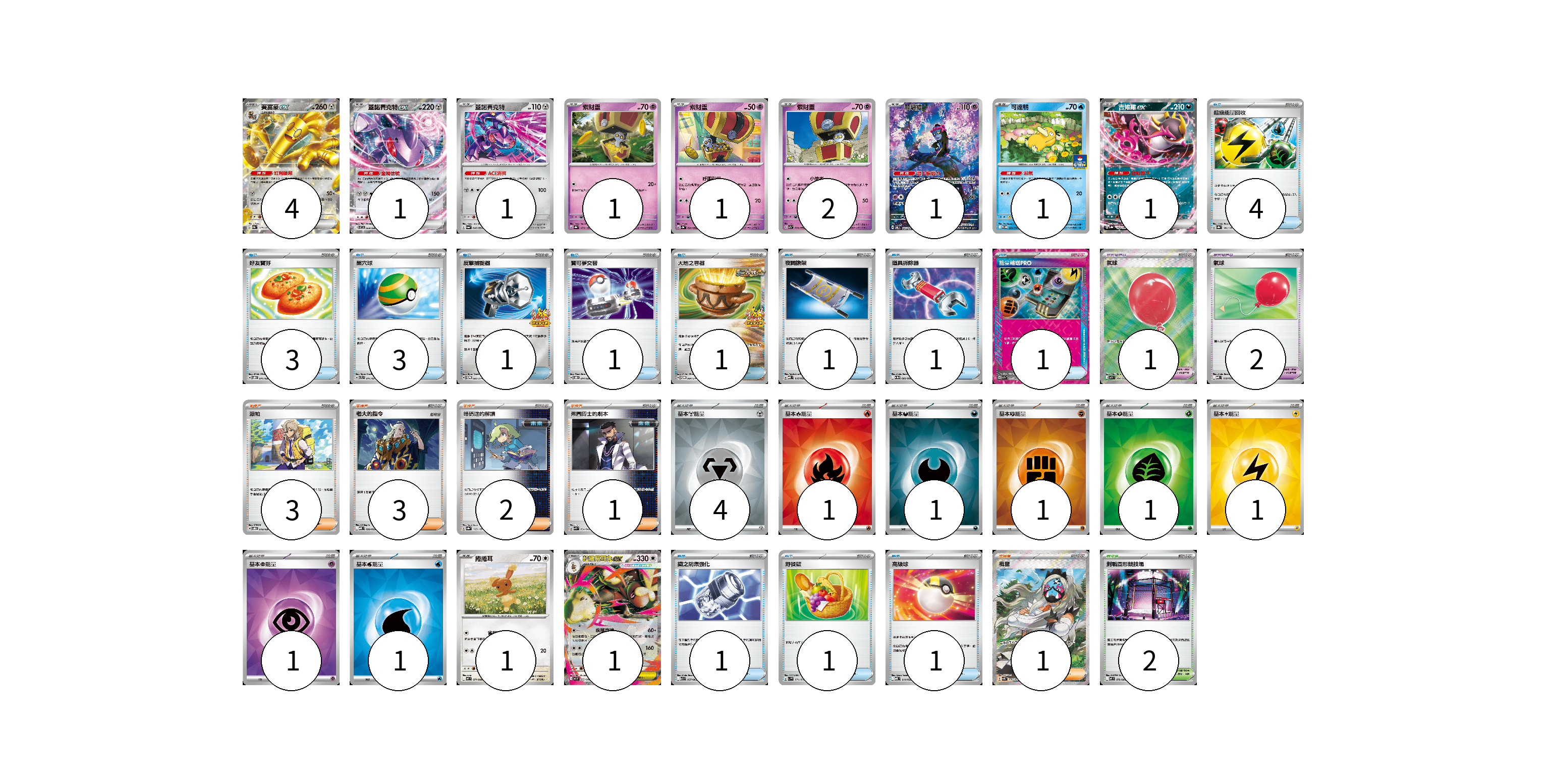 牌組構築方案 以此牌組為基礎新構築牌組 顯示卡面 顯示列表 寶可夢卡(15) 4 1 1 1 1 2 1 1 1 1 1 寶可夢道具(3) 1 2 物品卡(19) 4 3 3 1 1 1 1 1 1 1 1 1 支援者卡(10) 3 3 2 1 1 競技場卡(2) 2 能量卡(11) 4 1 1 1 1 1 1 1 寶可夢卡(15) 卡牌名稱 張數 卡牌名稱 張數 賽富豪ex SV8a 117/187 04 蓋諾賽克特ex SV11B 069/086 01 蓋諾賽克特 SV6a 040/064 01 索財靈 SV8a 073/187 01 索財靈 SV3a 020/062 01 索財靈 SV7a 024/064 02 願增猿 SV6 107/101 01 可達鴨 SV-P 220/SV-P 01 吉雉雞ex SV8a 104/187 01 捲捲耳 M2 071/080 01 超級長耳兔ex M2 072/080 01 寶可夢道具(3) 卡牌名稱 張數 卡牌名稱 張數 氣球 M1L 084/063 01 氣球 MBD 018/022 02 物品卡(19) 卡牌名稱 張數 卡牌名稱 張數 超級能量回收 SV8a 141/187 04 好友寶芬 SVOD 011/020 03 巢穴球 SVTL 011/021 03 反擊捕捉器 SV-P 083/SV-P 01 寶可夢交替 SVOD 014/020 01 大地之容器 SV-P 084/SV-P 01 夜間擔架 MBD 016/022 01 道具拆除器 SV11W 080/086 01 能量輸送PRO SV7a 052/064 01 鐵之防禦強化 M1L 057/063 01 野餐籃 SV1V 071/078 01 高級球 MBD 014/022 01 支援者卡(10) 卡牌名稱 張數 卡牌名稱 張數 派帕 SVOD 018/020 03 老大的指令 MBD 020/022 03 暗碼迷的解讀 SV8a 165/187 02 弗圖博士的劇本 SVK 034/042 01 枇琶 SV5K 091/071 01 競技場卡(2) 卡牌名稱 張數 卡牌名稱 張數 對戰圓形競技場 M2 079/080 02 能量卡(11) 卡牌名稱 張數 卡牌名稱 張數 基本【鋼】能量 SVOD MET 04 基本【火】能量 SVQL FIR 01 基本【惡】能量 SVK DAR 01 基本【鬥】能量 SVK FIG 01 基本【草】能量 SVK GRA 01 基本【雷】能量 SVK LIG 01 基本【超】能量 SVK PSY 01 基本【水】能量 SVK WAT 01 以此牌組為基礎新構築牌組 牌組編碼 xAYRFs-TqDNwr-pAGwQQ copy 列印牌組單 牌組編碼已複製 分享至SNS