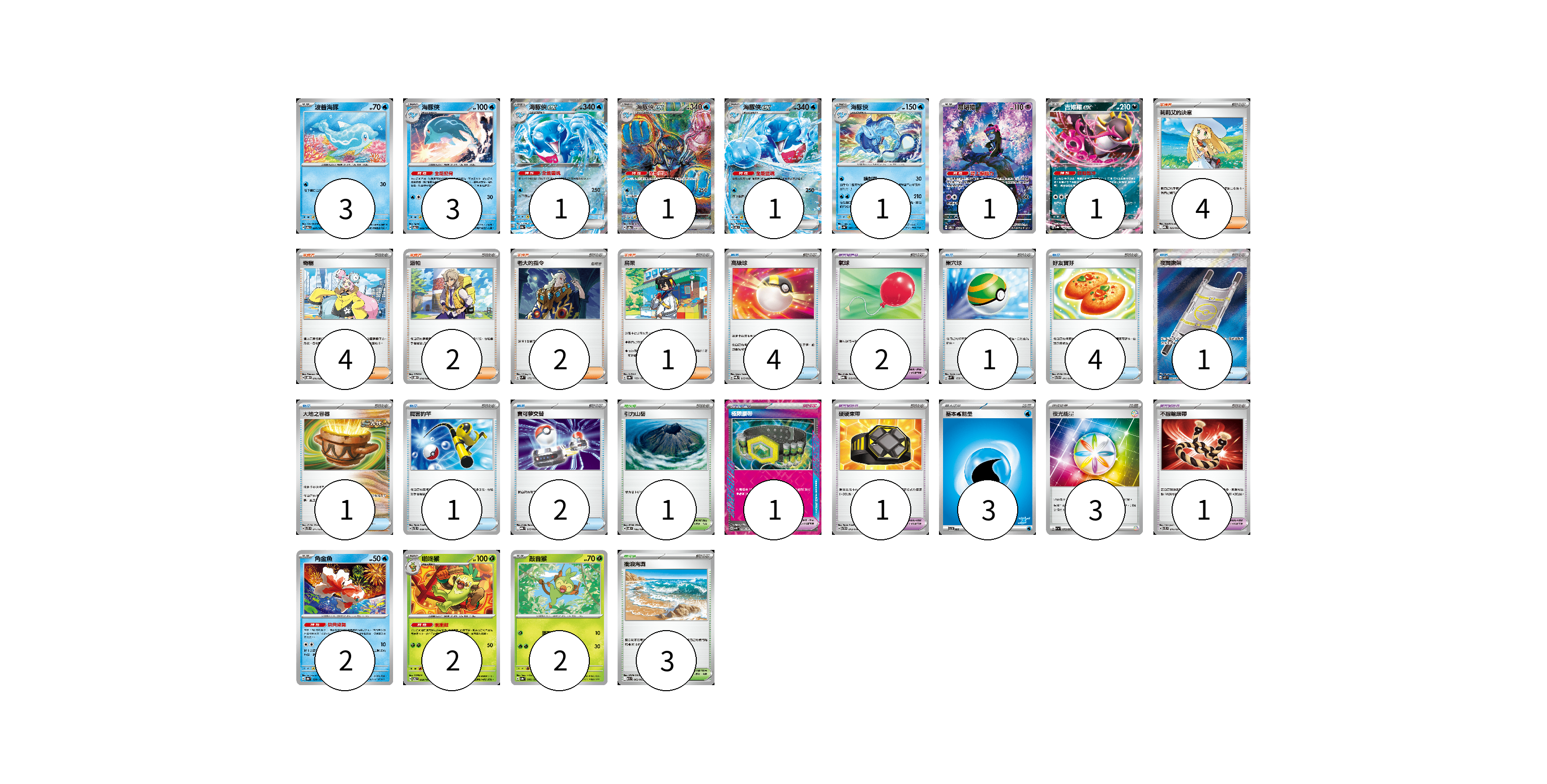 牌組構築方案 以此牌組為基礎新構築牌組 顯示卡面 顯示列表 寶可夢卡(18) 3 3 1 1 1 1 1 1 2 2 2 寶可夢道具(5) 2 1 1 1 物品卡(14) 4 1 4 1 1 1 2 支援者卡(13) 4 4 2 2 1 競技場卡(4) 1 3 能量卡(6) 3 3 寶可夢卡(18) 卡牌名稱 張數 卡牌名稱 張數 波普海豚 SV6 034/101 03 海豚俠 SV6 035/101 03 海豚俠ex SV8a 046/187 01 海豚俠ex SV8a 207/187 01 海豚俠ex SV6 036/101 01 海豚俠 SV4a 047/190 01 願增猿 SV6 107/101 01 吉雉雞ex SV8a 104/187 01 角金魚 SV8a 028/187 02 啪咚猴 SV6 009/101 02 敲音猴 SV8a 006/187 02 寶可夢道具(5) 卡牌名稱 張數 卡牌名稱 張數 氣球 MBG 019/022 02 極限腰帶 SV5K 066/071 01 硬硬束帶 SVTH 013/018 01 不服輸頭帶 SVTL 016/021 01 物品卡(14) 卡牌名稱 張數 卡牌名稱 張數 高級球 SVQL 015/022 04 巢穴球 SVM 133/175 01 好友寶芬 SVTG 011/019 04 夜間擔架 M1L 083/063 01 大地之容器 SVTS 011/022 01 厲害釣竿 SVTL 009/021 01 寶可夢交替 MBG 015/022 02 支援者卡(13) 卡牌名稱 張數 卡牌名稱 張數 莉莉艾的決意 MBG 022/022 04 奇樹 SVOD 016/020 04 派帕 SVOD 018/020 02 老大的指令 SVM 172/175 02 烏栗 SV8a 169/187 01 競技場卡(4) 卡牌名稱 張數 卡牌名稱 張數 引力山岳 SV8 106/106 01 衝浪海灘 M1S 062/063 03 能量卡(6) 卡牌名稱 張數 卡牌名稱 張數 基本【水】能量 SVI WAT 03 夜光能量 SV1a 073/073 03 以此牌組為基礎新構築牌組 牌組編碼 xAboNa-XdLJWJ-DYYWPt copy 列印牌組單 牌組編碼已複製 分享至SNS
