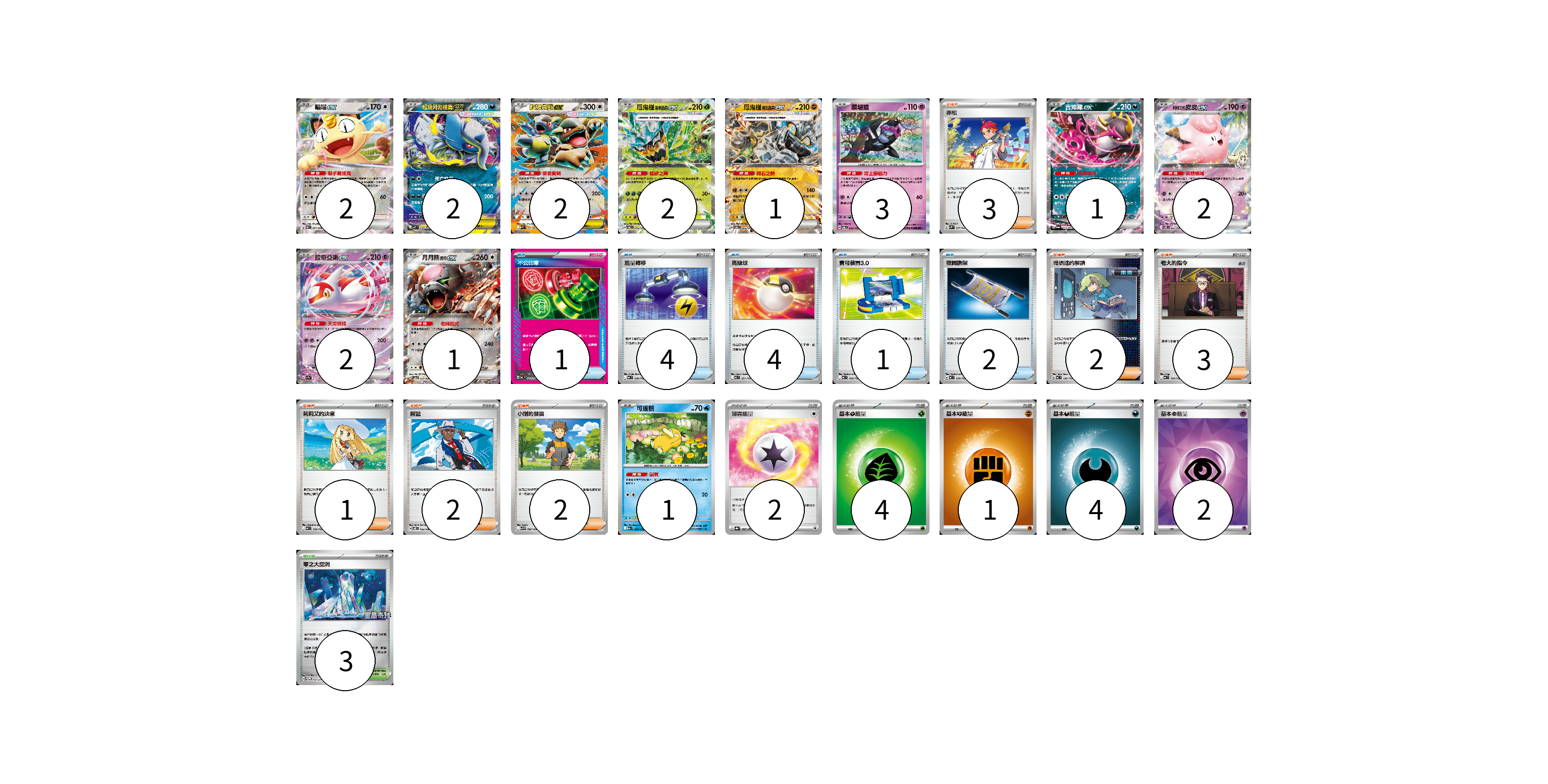 牌組構築方案 以此牌組為基礎新構築牌組 顯示卡面 顯示列表 寶可夢卡(19) 2 2 2 2 1 3 1 2 2 1 1 物品卡(12) 1 4 4 1 2 支援者卡(13) 3 2 3 1 2 2 競技場卡(3) 3 能量卡(13) 2 4 1 4 2 寶可夢卡(19) 卡牌名稱 張數 卡牌名稱 張數 喵喵ex M3 061/080 02 超級阿勃梭魯ex M1L 038/063 02 超級袋獸ex M1S 051/063 02 厄鬼椪 碧草面具ex SV6 016/101 02 厄鬼椪 礎石面具ex SV6 065/101 01 願增猿 SV6 055/101 03 吉雉雞ex SV6a 038/064 01 莉莉艾的皮皮ex SV9 033/100 02 拉帝亞斯ex SV7a 019/064 02 月月熊 赫月 ex SV5a 052/066 01 可達鴨 M2a 032/193 01 物品卡(12) 卡牌名稱 張數 卡牌名稱 張數 不公印章 MC 633/742 01 能量轉移 MC 638/742 04 高級球 MC 651/742 04 寶可裝置3.0 MC 660/742 01 夜間擔架 MC 670/742 02 支援者卡(13) 卡牌名稱 張數 卡牌名稱 張數 赤松 SVK 027/042 03 暗碼迷的解讀 MC 698/742 02 老大的指令 MC 724/742 03 莉莉艾的決意 MC 729/742 01 席藍 SV8 102/106 02 小剛的發掘 SV9 096/100 02 競技場卡(3) 卡牌名稱 張數 卡牌名稱 張數 零之大空洞 SV-P 151/SV-P 03 能量卡(13) 卡牌名稱 張數 卡牌名稱 張數 薄霧能量 SV8a 186/187 02 基本【草】能量 MJ GRA 04 基本【鬥】能量 MC FIG 01 基本【惡】能量 MC DAR 04 基本【超】能量 SVOD PSY 02 以此牌組為基礎新構築牌組 牌組編碼 xBLaJa-XCQvsP-WHRECk copy 列印牌組單 牌組編碼已複製 分享至SNS