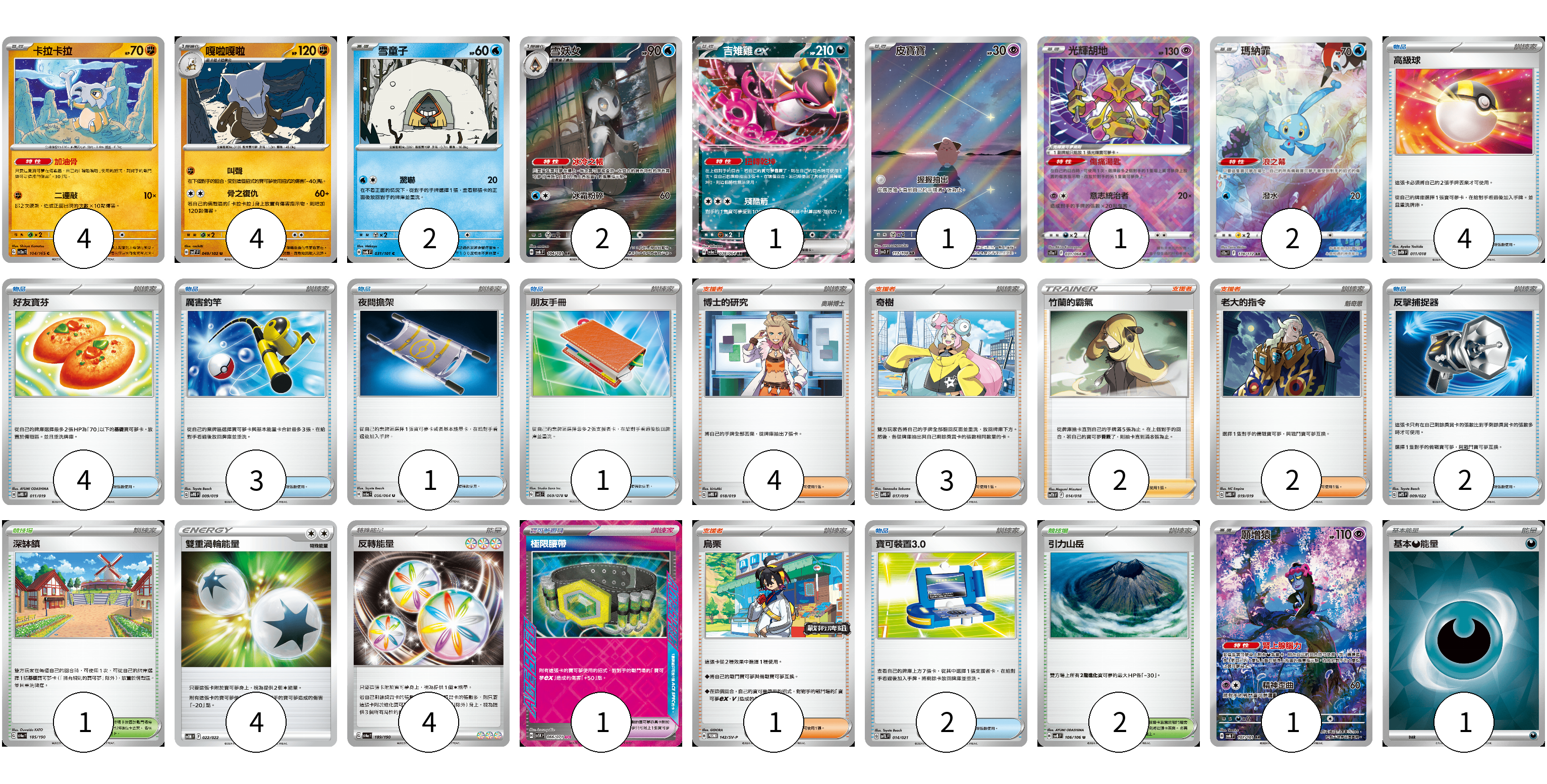 牌組構築方案 以此牌組為基礎新構築牌組 顯示卡面 顯示列表 寶可夢卡(18) 4 4 2 2 1 1 1 2 1 寶可夢道具(1) 1 物品卡(17) 4 4 3 1 1 2 2 支援者卡(12) 4 3 2 2 1 競技場卡(3) 1 2 能量卡(9) 4 4 1 寶可夢卡(18) 卡牌名稱 張數 卡牌名稱 張數 卡拉卡拉 SV2a 104/165 04 嘎啦嘎啦 SV7 049/102 04 雪童子 SV6 031/101 02 雪妖女 SV6 104/101 02 吉雉雞ex SV6a 038/064 01 皮寶寶 SV3 113/108 01 光輝胡地 S11a 031/068 01 瑪納霏 S12a 178/172 02 願增猿 SV6 107/101 01 寶可夢道具(1) 卡牌名稱 張數 卡牌名稱 張數 極限腰帶 SV5K 066/071 01 物品卡(17) 卡牌名稱 張數 卡牌名稱 張數 高級球 SVTH 011/018 04 好友寶芬 SVTG 011/019 04 厲害釣竿 SVTG 009/019 03 夜間擔架 SV6a 056/064 01 朋友手冊 SV1S 069/078 01 反擊捕捉器 SVTS 009/022 02 寶可裝置3.0 SVTL 014/021 02 支援者卡(12) 卡牌名稱 張數 卡牌名稱 張數 博士的研究 SVTG 018/019 04 奇樹 SVTG 017/019 03 竹蘭的霸氣 SVTH 014/018 02 老大的指令 SVTG 019/019 02 烏栗 SV-P 142/SV-P 01 競技場卡(3) 卡牌名稱 張數 卡牌名稱 張數 深缽鎮 SV4a 185/190 01 引力山岳 SV8 106/106 02 能量卡(9) 卡牌名稱 張數 卡牌名稱 張數 雙重渦輪能量 SVTM 022/022 04 反轉能量 SV4a 189/190 04 基本【惡】能量 SVK DAR 01 以此牌組為基礎新構築牌組 牌組編碼 xGbQIl-LhLMmk-TwakLR copy 列印牌組單 牌組編碼已複製 分享至SNS