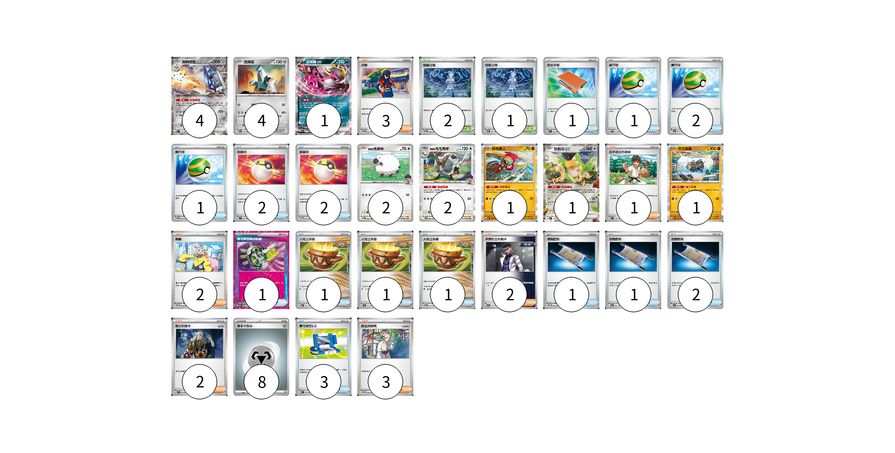 牌組構築方案 以此牌組為基礎新構築牌組 顯示卡面 顯示列表 寶可夢卡(16) 4 4 1 2 2 1 1 1 物品卡(20) 1 1 2 1 2 2 1 1 1 1 1 1 2 3 支援者卡(13) 3 1 2 2 2 3 競技場卡(3) 2 1 能量卡(8) 8 寶可夢卡(16) 卡牌名稱 張數 卡牌名稱 張數 鋁鋼橋龍ex SV7a 037/064 04 鋁鋼龍 SV8a 112/187 04 吉雉雞ex SV6a 038/064 01 赫普的毛辮羊 SV9 085/100 02 赫普的毛毛角羊 SV9 086/100 02 摔角鷹人 SV8a 084/187 01 怒鸚哥ex SV4a 154/190 01 古空棘魚 SV8a 079/187 01 物品卡(20) 卡牌名稱 張數 卡牌名稱 張數 朋友手冊 SV1S 069/078 01 巢穴球 SVAW 014/023 01 巢穴球 SV4a 159/190 02 巢穴球 SVTH 010/018 01 高級球 SVK 018/042 02 高級球 SVTM 012/022 02 寶可夢旋風回收機 SV8a 149/187 01 大地之容器 SV8a 143/187 01 大地之容器 SVK 012/042 01 大地之容器 SVTS 011/022 01 夜間擔架 SVOM 016/021 01 夜間擔架 SV8a 151/187 01 夜間擔架 SV6a 056/064 02 寶可裝置3.0 SVK 021/042 03 支援者卡(13) 卡牌名稱 張數 卡牌名稱 張數 丹瑜 SV6 097/101 03 空手道王的演練 SVM 147/175 01 奇樹 SVOM 018/021 02 弗圖博士的劇本 SV8a 175/187 02 老大的指令 SVK 036/042 02 博士的研究 SVOM 019/021 03 競技場卡(3) 卡牌名稱 張數 卡牌名稱 張數 阻礙之塔 SV6 100/101 02 阻礙之塔 SV8a 181/187 01 能量卡(8) 卡牌名稱 張數 卡牌名稱 張數 基本【鋼】能量 SVF MET 08 以此牌組為基礎新構築牌組 牌組編碼 xHqVLv-MfZMWq-epFDgk copy 列印牌組單 牌組編碼已複製 分享至SNS