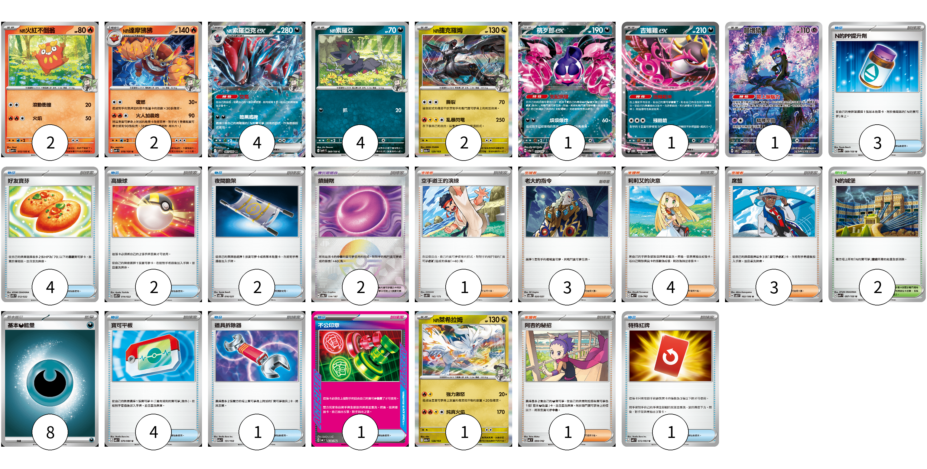 牌組構築方案 以此牌組為基礎新構築牌組 顯示卡面 顯示列表 寶可夢卡(18) 2 2 4 4 2 1 1 1 1 寶可夢道具(2) 2 物品卡(18) 3 4 2 2 4 1 1 1 支援者卡(12) 1 3 4 3 1 競技場卡(2) 2 能量卡(8) 8 寶可夢卡(18) 卡牌名稱 張數 卡牌名稱 張數 N的火紅不倒翁 SV9 015/100 02 N的達摩狒狒 SV9 016/100 02 N的索羅亞克ex SV9 061/100 04 N的索羅亞 SV9 060/100 04 N的捷克羅姆 M2a 129/193 02 桃歹郎ex SV8a 105/187 01 吉雉雞ex SVOM 009/021 01 願增猿 SV6 107/101 01 N的萊希拉姆 M2a 128/193 01 寶可夢道具(2) 卡牌名稱 張數 卡牌名稱 張數 鎖鏈糬 SV8a 154/187 02 物品卡(18) 卡牌名稱 張數 卡牌名稱 張數 N的PP提升劑 SV9 089/100 03 好友寶芬 SVTS 012/022 04 高級球 SVTS 014/022 02 夜間擔架 SVOM 016/021 02 寶可平板 M3 070/080 04 道具拆除器 M2a 151/193 01 不公印章 MC 633/742 01 特殊紅牌 M4 072/083 01 支援者卡(12) 卡牌名稱 張數 卡牌名稱 張數 空手道王的演練 SVM 145/175 01 老大的指令 SVOM 020/021 03 莉莉艾的決意 MC 729/742 04 席藍 SV8 102/106 03 阿杏的秘招 MC 699/742 01 競技場卡(2) 卡牌名稱 張數 卡牌名稱 張數 N的城堡 SV9 097/100 02 能量卡(8) 卡牌名稱 張數 卡牌名稱 張數 基本【惡】能量 MC DAR 08 以此牌組為基礎新構築牌組 牌組編碼 xKRmrl-mDKrdG-womrSg copy 列印牌組單 牌組編碼已複製 分享至SNS