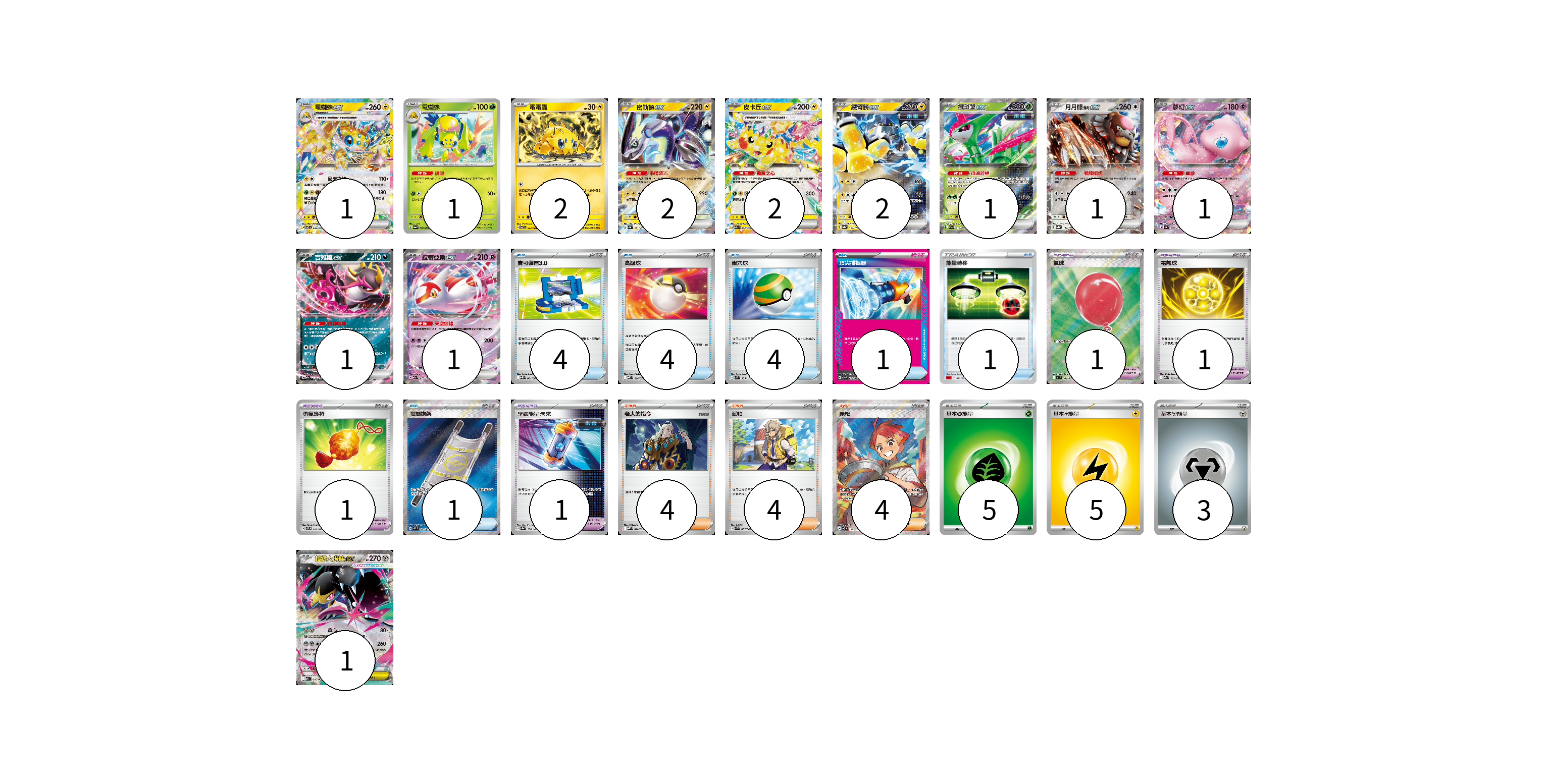 牌組構築方案 以此牌組為基礎新構築牌組 顯示卡面 顯示列表 寶可夢卡(16) 1 1 2 2 2 2 1 1 1 1 1 1 寶可夢道具(4) 1 1 1 1 物品卡(15) 4 4 4 1 1 1 支援者卡(12) 4 4 4 能量卡(13) 5 5 3 寶可夢卡(16) 卡牌名稱 張數 卡牌名稱 張數 電蜘蛛ex SV7 033/102 01 電蜘蛛 SV6a 002/064 01 電電蟲 SV7 032/102 02 密勒頓ex SV4a 071/190 02 皮卡丘ex M2a 044/193 02 鐵臂膀ex SV8a 054/187 02 鐵斑葉ex SV5M 016/071 01 月月熊 赫月ex SV8a 134/187 01 夢幻ex SV4a 076/190 01 吉雉雞ex M2a 114/193 01 拉帝亞斯ex M2a 075/193 01 超級大嘴娃ex M1L 046/063 01 寶可夢道具(4) 卡牌名稱 張數 卡牌名稱 張數 氣球 M1L 084/063 01 電氣球 M2a 163/193 01 勇氣護符 SVTR 015/021 01 驅勁能量 未來 SV8a 158/187 01 物品卡(15) 卡牌名稱 張數 卡牌名稱 張數 寶可裝置3.0 SV11B 081/086 04 高級球 MBD 014/022 04 巢穴球 SVM 133/175 04 頂尖捕捉器 MBG 014/022 01 能量轉移 SDL 011/021 01 夜間擔架 M1L 083/063 01 支援者卡(12) 卡牌名稱 張數 卡牌名稱 張數 老大的指令 MBD 020/022 04 派帕 SVK 035/042 04 赤松 SV7 123/102 04 能量卡(13) 卡牌名稱 張數 卡牌名稱 張數 基本草能量 sv-p GRA 05 基本雷能量 sv-p LIG 05 基本鋼能量 sv-p MET 03 以此牌組為基礎新構築牌組 牌組編碼 xLSxlr-brJqgR-JearmW copy 列印牌組單 牌組編碼已複製 分享至SNS