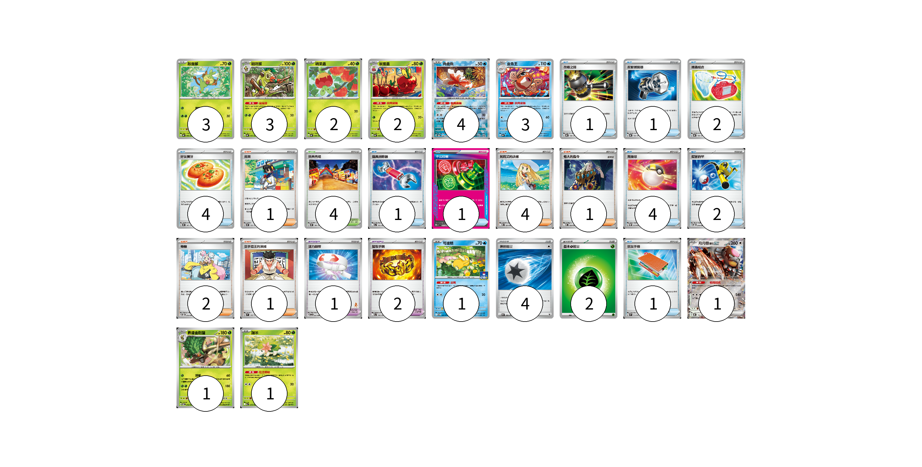牌組構築方案 以此牌組為基礎新構築牌組 顯示卡面 顯示列表 寶可夢卡(21) 3 3 2 2 4 3 1 1 1 1 寶可夢道具(3) 1 2 物品卡(17) 1 1 2 4 1 1 4 2 1 支援者卡(9) 1 4 1 2 1 競技場卡(4) 4 能量卡(6) 4 2 寶可夢卡(21) 卡牌名稱 張數 卡牌名稱 張數 敲音猴 SV8a 006/187 03 啪咚猴 SV8a 007/187 03 啃果蟲 SV8a 008/187 02 裹蜜蟲 SV8a 009/187 02 角金魚 SV8a 028/187 04 金魚王 SV8a 029/187 03 可達鴨 SV-P 220/SV-P 01 月月熊 赫月ex SV8a 134/187 01 轟擂金剛猩 SV6 010/101 01 謝米 M2a 012/193 01 寶可夢道具(3) 卡牌名稱 張數 卡牌名稱 張數 活力頭帶 SVI 057/066 01 猛攻手鐲 M2a 166/193 02 物品卡(17) 卡牌名稱 張數 卡牌名稱 張數 改造之錘 SV8a 138/187 01 反擊捕捉器 SV8a 139/187 01 捕蟲組合 SV8a 150/187 02 好友寶芬 SV8a 147/187 04 道具拆除器 M2a 151/193 01 不公印章 MBD 011/022 01 高級球 SVQP 015/023 04 厲害釣竿 SVOD 010/020 02 朋友手冊 SVK 014/042 01 支援者卡(9) 卡牌名稱 張數 卡牌名稱 張數 烏栗 SV8a 169/187 01 莉莉艾的決意 MBD 021/022 04 老大的指令 MBD 020/022 01 奇樹 SVOD 016/020 02 空手道王的演練 SVM 143/175 01 競技場卡(4) 卡牌名稱 張數 卡牌名稱 張數 祭典會場 SV8a 180/187 04 能量卡(6) 卡牌名稱 張數 卡牌名稱 張數 噴射能量 SV8a 185/187 04 基本【草】能量 M-P GRA 02 以此牌組為基礎新構築牌組 牌組編碼 xMtYbA-xNTzvY-thtuge copy 列印牌組單 牌組編碼已複製 分享至SNS
