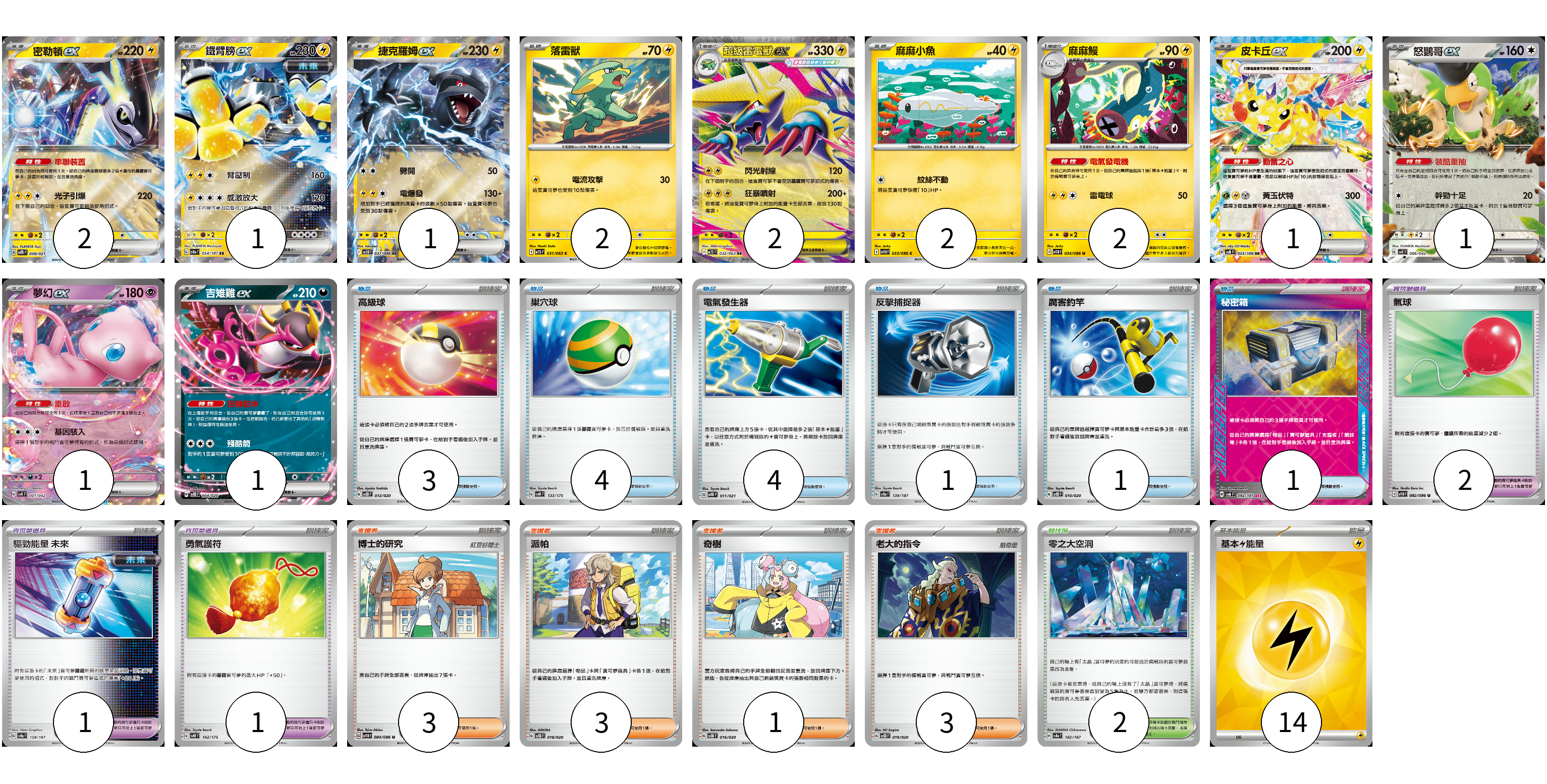 牌組構築方案 以此牌組為基礎新構築牌組 顯示卡面 顯示列表 寶可夢卡(16) 2 1 1 2 2 2 2 1 1 1 1 寶可夢道具(4) 2 1 1 物品卡(14) 3 4 4 1 1 1 支援者卡(10) 3 3 1 3 競技場卡(2) 2 能量卡(14) 14 寶可夢卡(16) 卡牌名稱 張數 卡牌名稱 張數 密勒頓ex SVTR 008/021 02 鐵臂膀ex SV8a 054/187 01 捷克羅姆ex SV11B 037/086 01 落雷獸 M1S 031/063 02 超級雷電獸ex M1S 032/063 02 麻麻小魚 SV11B 033/086 02 麻麻鰻 SV11B 034/086 02 皮卡丘ex SV8 033/106 01 怒鸚哥ex SVK 006/042 01 夢幻ex SVK 001/042 01 吉雉雞ex SVOD 004/020 01 寶可夢道具(4) 卡牌名稱 張數 卡牌名稱 張數 氣球 SV11B 082/086 02 驅勁能量 未來 SV8a 158/187 01 勇氣護符 SVM 142/175 01 物品卡(14) 卡牌名稱 張數 卡牌名稱 張數 高級球 SVOD 012/020 03 巢穴球 SVM 133/175 04 電氣發生器 SVTR 011/021 04 反擊捕捉器 SV8a 139/187 01 厲害釣竿 SVOD 010/020 01 秘密箱 SV6 092/101 01 支援者卡(10) 卡牌名稱 張數 卡牌名稱 張數 博士的研究 SV11B 084/086 03 派帕 SVOD 018/020 03 奇樹 SVOD 016/020 01 老大的指令 SVOD 019/020 03 競技場卡(2) 卡牌名稱 張數 卡牌名稱 張數 零之大空洞 SV8a 182/187 02 能量卡(14) 卡牌名稱 張數 卡牌名稱 張數 基本【雷】能量 SVQP LIG 14 以此牌組為基礎新構築牌組 牌組編碼 xPdfbY-eKHYvq-zJXEJN copy 列印牌組單 牌組編碼已複製 分享至SNS