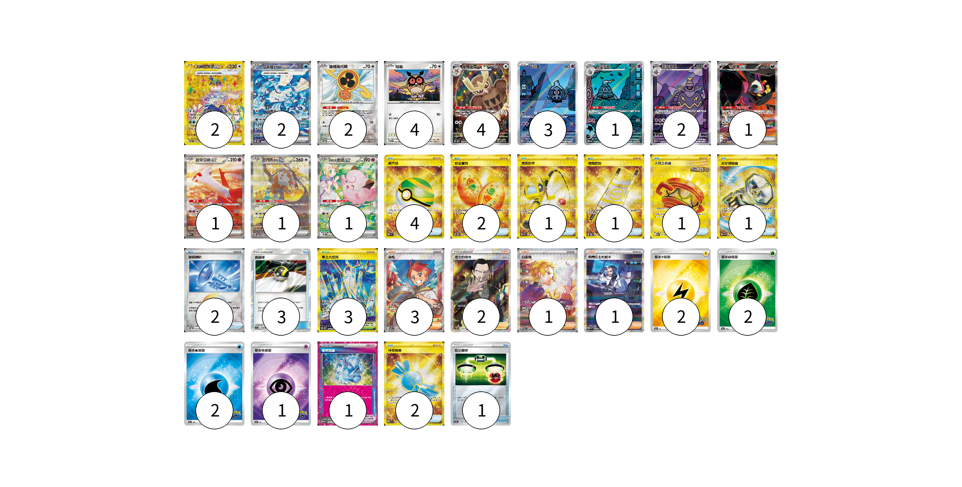 牌組構築方案 以此牌組為基礎新構築牌組 顯示卡面 顯示列表 寶可夢卡(24) 2 2 2 4 4 3 1 2 1 1 1 1 寶可夢道具(1) 1 物品卡(18) 4 2 1 1 1 1 2 3 2 1 支援者卡(7) 3 2 1 1 競技場卡(3) 3 能量卡(7) 2 2 2 1 寶可夢卡(24) 卡牌名稱 張數 卡牌名稱 張數 太樂巴戈斯ex SV7 133/102 02 厄鬼椪 水井面具ex SV6 127/101 02 旋轉洛托姆 SV8a 131/187 02 咕咕 SV7 076/102 04 貓頭夜鷹 SV7 114/102 04 夜巡靈 SV6a 068/064 03 彷徨夜靈 SV6a 069/064 01 黑夜魔靈 SV6a 070/064 02 吉雉雞ex SV6a 089/064 01 拉帝亞斯ex SV7a 087/064 01 月月熊 赫月 ex SV5a 091/066 01 莉莉艾的皮皮ex SV9 126/100 01 寶可夢道具(1) 卡牌名稱 張數 卡牌名稱 張數 璀璨結晶 SV8a 152/187 01 物品卡(18) 卡牌名稱 張數 卡牌名稱 張數 巢穴球 SV1S 107/078 04 好友寶芬 SV6 133/101 02 厲害釣竿 SV2P 098/071 01 夜間擔架 SV8 137/106 01 大地之容器 SV6a 093/064 01 反擊捕捉器 SV4M 094/066 01 玻璃喇叭 SV8a 140/187 02 高級球 AS5b 178/186 03 神奇糖果 SV1V 107/078 02 能量轉移 SO 017/030 01 支援者卡(7) 卡牌名稱 張數 卡牌名稱 張數 赤松 SV7 123/102 03 老大的指令(坂木) SC1b 170/153 02 白蕾雅 SV7 132/102 01 弗圖博士的劇本 SV4M 091/066 01 競技場卡(3) 卡牌名稱 張數 卡牌名稱 張數 零之大空洞 SV7 135/102 03 能量卡(7) 卡牌名稱 張數 卡牌名稱 張數 基本雷能量 S10b LIG 02 基本草能量 S10b GRA 02 基本水能量 S10b WAT 02 基本超能量 S10b PSY 01 以此牌組為基礎新構築牌組 牌組編碼 xQTVen-eeVBOb-OMtSMX copy 列印牌組單 牌組編碼已複製 分享至SNS