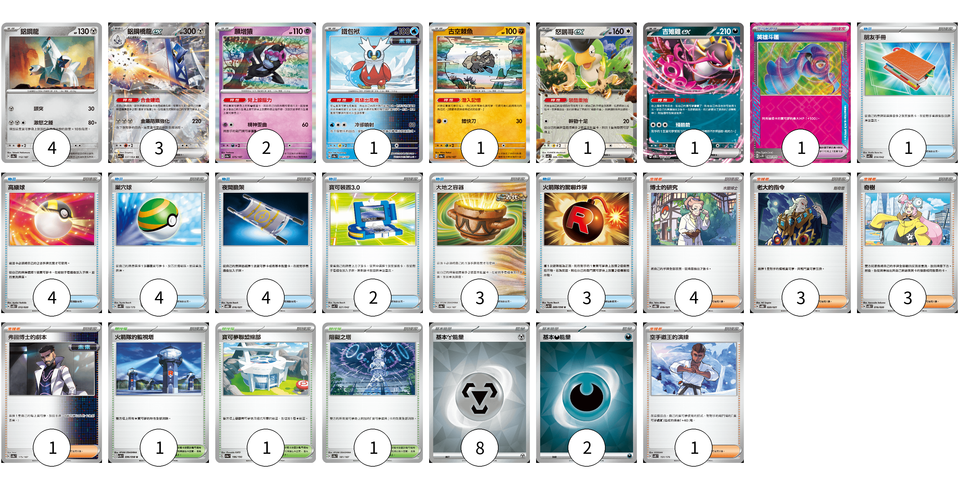 牌組構築方案 以此牌組為基礎新構築牌組 顯示卡面 顯示列表 寶可夢卡(13) 4 3 2 1 1 1 1 寶可夢道具(1) 1 物品卡(21) 1 4 4 4 2 3 3 支援者卡(12) 4 3 3 1 1 競技場卡(3) 1 1 1 能量卡(10) 8 2 寶可夢卡(13) 卡牌名稱 張數 卡牌名稱 張數 鋁鋼龍 SV8a 112/187 04 鋁鋼橋龍ex SV7a 037/064 03 願增猿 SV8a 075/187 02 鐵包袱 SV8a 047/187 01 古空棘魚 SV8a 079/187 01 怒鸚哥ex SVK 006/042 01 吉雉雞ex SVOD 004/020 01 寶可夢道具(1) 卡牌名稱 張數 卡牌名稱 張數 英雄斗篷 SV5M 064/071 01 物品卡(21) 卡牌名稱 張數 卡牌名稱 張數 朋友手冊 SVK 014/042 01 高級球 SVOD 012/020 04 巢穴球 SVM 133/175 04 夜間擔架 SVOM 016/021 04 寶可裝置3.0 SVK 021/042 02 大地之容器 SV8a 143/187 03 火箭隊的驚嚇炸彈 SV10 089/098 03 支援者卡(12) 卡牌名稱 張數 卡牌名稱 張數 博士的研究 SVOM 019/021 04 老大的指令 SVOM 020/021 03 奇樹 SVOD 016/020 03 弗圖博士的劇本 SV8a 175/187 01 空手道王的演練 SVM 151/175 01 競技場卡(3) 卡牌名稱 張數 卡牌名稱 張數 火箭隊的監視塔 SV10 096/098 01 寶可夢聯盟總部 SV4a 186/190 01 阻礙之塔 SV8a 181/187 01 能量卡(10) 卡牌名稱 張數 卡牌名稱 張數 基本【鋼】能量 SVOD MET 08 基本【惡】能量 SVOM DAR 02 以此牌組為基礎新構築牌組 牌組編碼 xSbiga-MulyLt-MDCexa copy 列印牌組單 牌組編碼已複製 分享至SNS