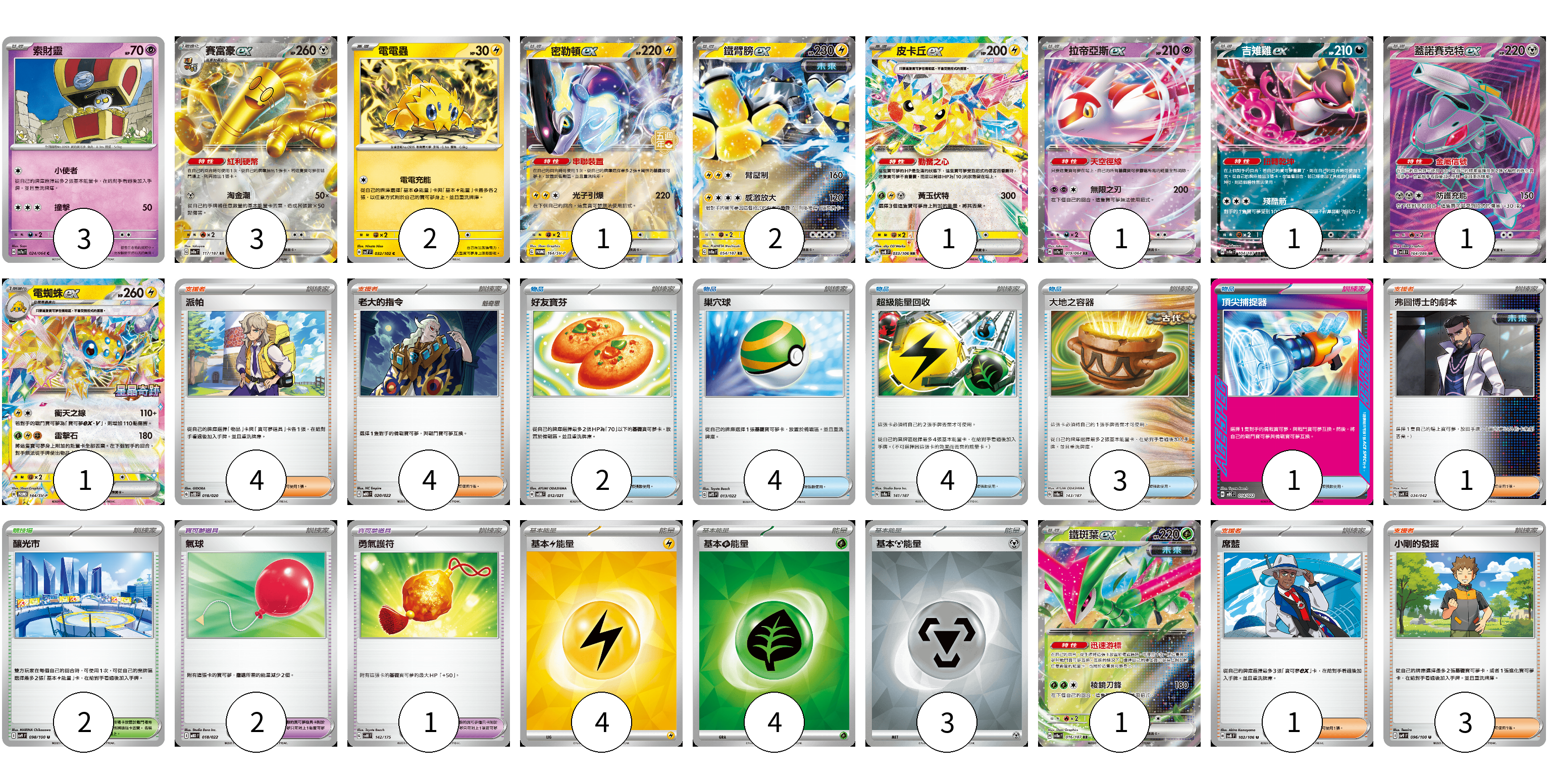 牌組構築方案 以此牌組為基礎新構築牌組 顯示卡面 顯示列表 寶可夢卡(17) 3 3 2 1 2 1 1 1 1 1 1 寶可夢道具(3) 2 1 物品卡(14) 2 4 4 3 1 支援者卡(13) 4 4 1 1 3 競技場卡(2) 2 能量卡(11) 4 4 3 寶可夢卡(17) 卡牌名稱 張數 卡牌名稱 張數 索財靈 SV7a 024/064 03 賽富豪ex SV8a 117/187 03 電電蟲 SV7 032/102 02 密勒頓ex SV-P 164/SV-P 01 鐵臂膀ex SV8a 054/187 02 皮卡丘ex SV8 033/106 01 拉帝亞斯ex SV7a 019/064 01 吉雉雞ex SV8a 104/187 01 蓋諾賽克特ex SV11B 164/086 01 電蜘蛛ex SV-P 144/SV-P 01 鐵斑葉ex SV8a 016/187 01 寶可夢道具(3) 卡牌名稱 張數 卡牌名稱 張數 氣球 MBD 018/022 02 勇氣護符 SVM 142/175 01 物品卡(14) 卡牌名稱 張數 卡牌名稱 張數 好友寶芬 SVOM 012/021 02 巢穴球 SVTS 013/022 04 超級能量回收 SV8a 141/187 04 大地之容器 SV8a 143/187 03 頂尖捕捉器 MBG 014/022 01 支援者卡(13) 卡牌名稱 張數 卡牌名稱 張數 派帕 SVOD 018/020 04 老大的指令 MBD 020/022 04 弗圖博士的劇本 SVK 034/042 01 席藍 SV8 102/106 01 小剛的發掘 SV9 096/100 03 競技場卡(2) 卡牌名稱 張數 卡牌名稱 張數 釀光市 SV9 098/100 02 能量卡(11) 卡牌名稱 張數 卡牌名稱 張數 基本【雷】能量 SVQP LIG 04 基本【草】能量 SVM GRA 04 基本【鋼】能量 SVOD MET 03 以此牌組為基礎新構築牌組 牌組編碼 xSbzXN-ZORxee-wGdFTZ copy 列印牌組單 牌組編碼已複製 分享至SNS