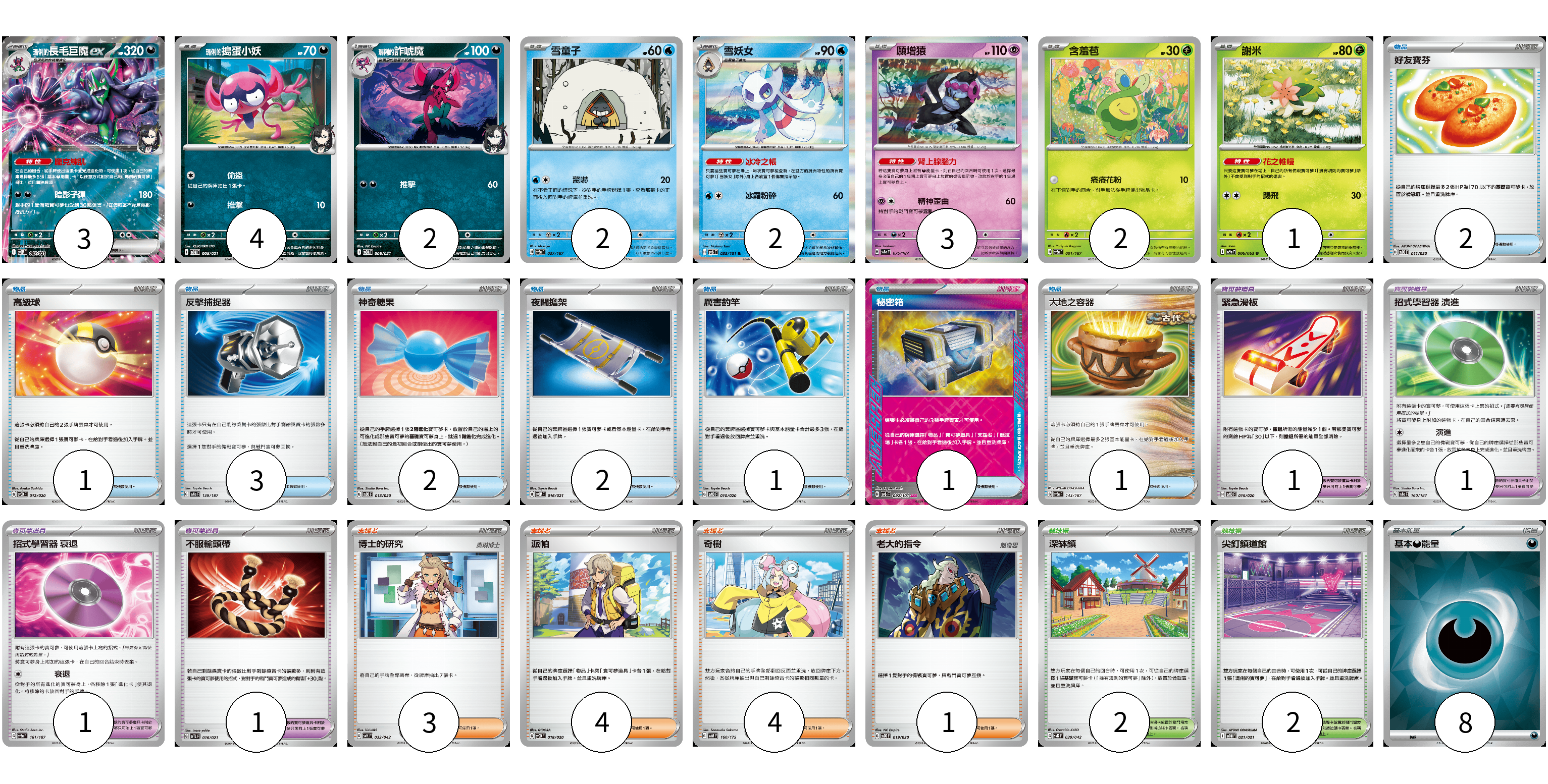 牌組構築方案 以此牌組為基礎新構築牌組 顯示卡面 顯示列表 寶可夢卡(19) 3 4 2 2 2 3 2 1 寶可夢道具(4) 1 1 1 1 物品卡(13) 2 1 3 2 2 1 1 1 支援者卡(12) 3 4 4 1 競技場卡(4) 2 2 能量卡(8) 8 寶可夢卡(19) 卡牌名稱 張數 卡牌名稱 張數 <瑪俐的>長毛巨魔ex SVOM 007/021 03 <瑪俐的>搗蛋小妖 SVOM 005/021 04 <瑪俐的>詐唬魔 SVOM 006/021 02 雪童子 SV8a 037/187 02 雪妖女 SV6 033/101 02 願增猿 SV8a 075/187 03 含羞苞 SV8a 001/187 02 謝米 SV9a 006/063 01 寶可夢道具(4) 卡牌名稱 張數 卡牌名稱 張數 緊急滑板 SVOD 015/020 01 招式學習器 演進 SV8a 160/187 01 招式學習器 衰退 SV8a 161/187 01 不服輸頭帶 SVTL 016/021 01 物品卡(13) 卡牌名稱 張數 卡牌名稱 張數 好友寶芬 SVOD 011/020 02 高級球 SVOD 012/020 01 反擊捕捉器 SV8a 139/187 03 神奇糖果 SVOD 013/020 02 夜間擔架 SVOM 016/021 02 厲害釣竿 SVOD 010/020 01 秘密箱 SV6 092/101 01 大地之容器 SV8a 143/187 01 支援者卡(12) 卡牌名稱 張數 卡牌名稱 張數 博士的研究 SVK 032/042 03 派帕 SVOD 018/020 04 奇樹 SVM 160/175 04 老大的指令 SVOD 019/020 01 競技場卡(4) 卡牌名稱 張數 卡牌名稱 張數 深缽鎮 SVK 039/042 02 尖釘鎮道館 SVOM 021/021 02 能量卡(8) 卡牌名稱 張數 卡牌名稱 張數 基本【惡】能量 SVOM DAR 08 以此牌組為基礎新構築牌組 牌組編碼 xUZsEe-cmJBhp-tdZAbC copy 列印牌組單 牌組編碼已複製 分享至SNS