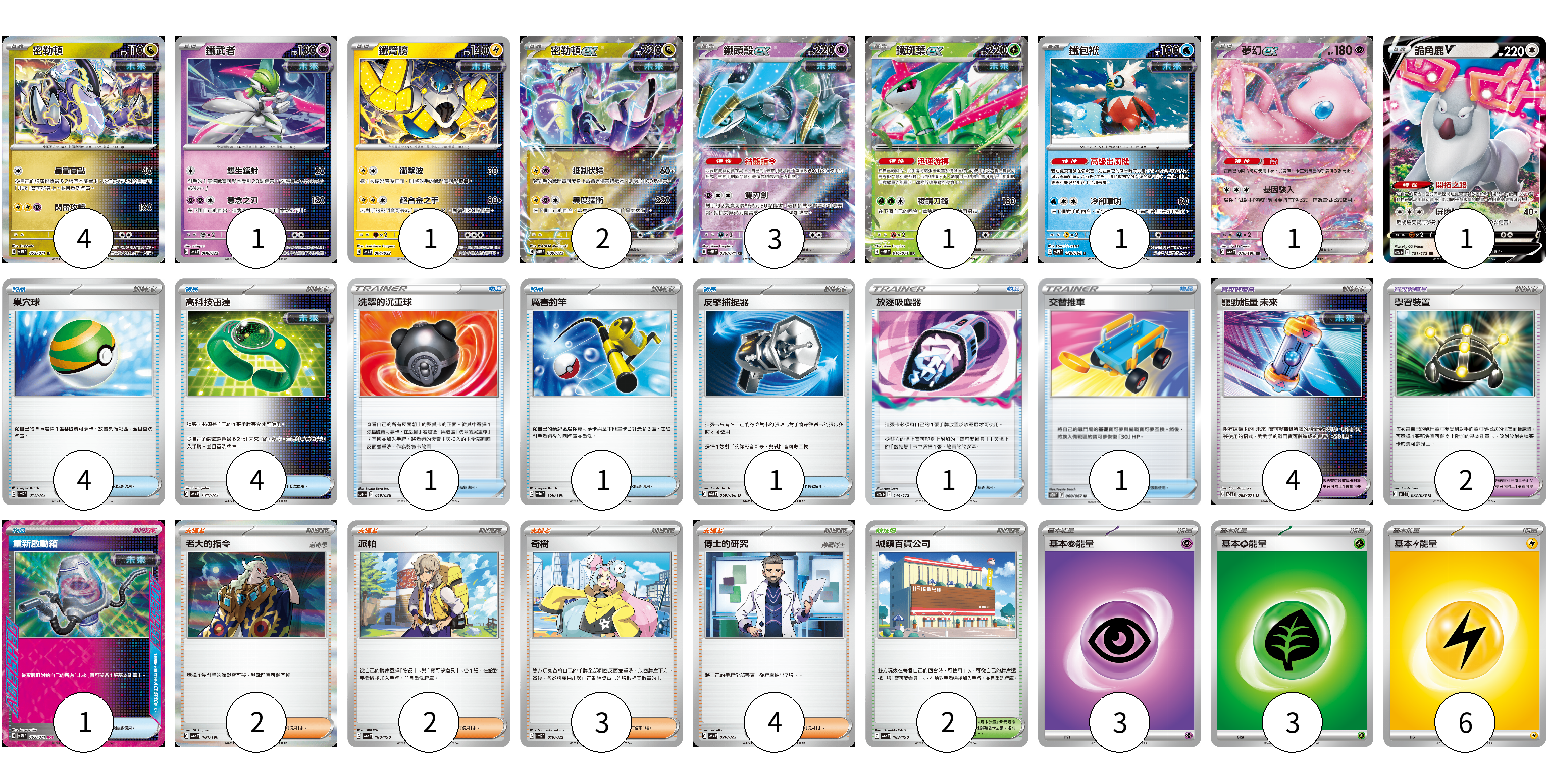牌組構築方案 以此牌組為基礎新構築牌組 顯示卡面 顯示列表 寶可夢卡(15) 4 1 1 2 3 1 1 1 1 寶可夢道具(6) 4 2 物品卡(14) 4 4 1 1 1 1 1 1 支援者卡(11) 2 2 3 4 競技場卡(2) 2 能量卡(12) 3 3 6 寶可夢卡(15) 卡牌名稱 張數 卡牌名稱 張數 密勒頓 SV5M 052/071 04 鐵武者 SVHM 008/022 01 鐵臂膀 SVHM 004/022 01 密勒頓ex SVHM 009/022 02 鐵頭殼ex SV5M 036/071 03 鐵斑葉ex SV5M 016/071 01 鐵包袱 SV4M 020/066 01 夢幻ex SV4a 076/190 01 詭角鹿V S12a 131/172 01 寶可夢道具(6) 卡牌名稱 張數 卡牌名稱 張數 驅勁能量 未來 SV5M 065/071 04 學習裝置 SV1S 072/078 02 物品卡(14) 卡牌名稱 張數 卡牌名稱 張數 巢穴球 SVHK 012/022 04 高科技雷達 SVHM 011/022 04 洗翠的沉重球 SVF 019/038 01 厲害釣竿 SV4a 158/190 01 反擊捕捉器 SV4M 059/066 01 放逐吸塵器 S12a 144/172 01 交替推車 S10D 060/067 01 重新啟動箱 SV5M 063/071 01 支援者卡(11) 卡牌名稱 張數 卡牌名稱 張數 老大的指令 SV4a 181/190 02 派帕 SV4a 180/190 02 奇樹 SVHK 019/022 03 博士的研究 SVHM 020/022 04 競技場卡(2) 卡牌名稱 張數 卡牌名稱 張數 城鎮百貨公司 SV4a 183/190 02 能量卡(12) 卡牌名稱 張數 卡牌名稱 張數 基本超能量 sv-p PSY 03 基本草能量 sv-p GRA 03 基本雷能量 sv-p LIG 06 以此牌組為基礎新構築牌組 牌組編碼 xUpIqm-IMBKrs-NVYLlV copy 列印牌組單 牌組編碼已複製 分享至SNS