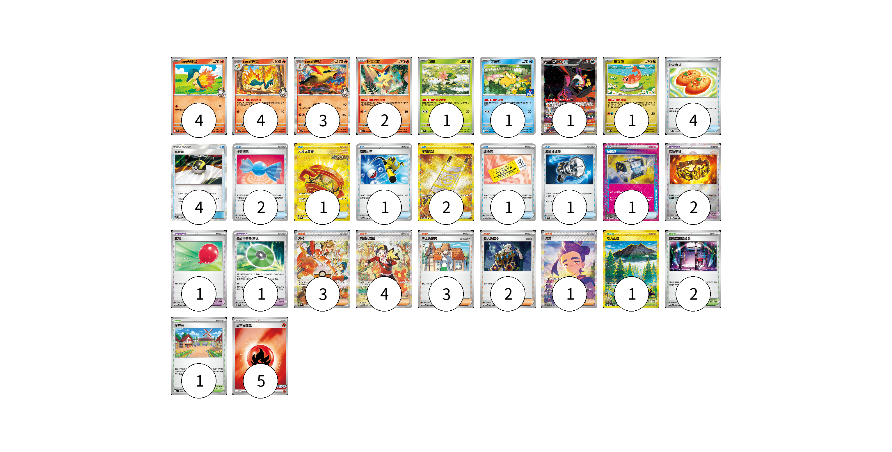 牌組構築方案 以此牌組為基礎新構築牌組 顯示卡面 顯示列表 寶可夢卡(17) 4 4 3 2 1 1 1 1 寶可夢道具(4) 2 1 1 物品卡(17) 4 4 2 1 1 2 1 1 1 支援者卡(13) 3 4 3 2 1 競技場卡(4) 1 2 1 能量卡(5) 5 寶可夢卡(17) 卡牌名稱 張數 卡牌名稱 張數 <阿響的>火球鼠 SV9a 015/063 04 <阿響的>火岩鼠 SV9a 016/063 04 <阿響的>火爆獸 SV9a 017/063 03 比克提尼 SV8 012/106 02 謝米 SV9a 006/063 01 可達鴨 SV-P 220/SV-P 01 吉雉雞ex SV6a 089/064 01 米立龍 MBD 010/022 01 寶可夢道具(4) 卡牌名稱 張數 卡牌名稱 張數 猛攻手鐲 SV11W 082/086 02 氣球 MBD 018/022 01 招式學習器 演進 SV8a 160/187 01 物品卡(17) 卡牌名稱 張數 卡牌名稱 張數 好友寶芬 MBD 013/022 04 高級球 AS5b 178/186 04 神奇糖果 SVTS 015/022 02 大地之容器 SV6a 093/064 01 厲害釣竿 SVTL 009/021 01 夜間擔架 SV8 137/106 02 調換票 SV9 090/100 01 反擊捕捉器 SV8a 139/187 01 秘密箱 SV6 092/101 01 支援者卡(13) 卡牌名稱 張數 卡牌名稱 張數 派帕 SV4a 353/190 03 阿響的冒險 SV9a 089/063 04 博士的研究 SV11B 084/086 03 老大的指令 MBD 020/022 02 烏栗 SV8a 230/187 01 競技場卡(4) 卡牌名稱 張數 卡牌名稱 張數 引力山岳 SV8 138/106 01 對戰圓形競技場 M2 079/080 02 深缽鎮 SV1a 070/073 01 能量卡(5) 卡牌名稱 張數 卡牌名稱 張數 基本【火】能量 M-P 032/M-P 05 以此牌組為基礎新構築牌組 牌組編碼 xVENbC-QOsQph-CEUwta copy 列印牌組單 牌組編碼已複製 分享至SNS