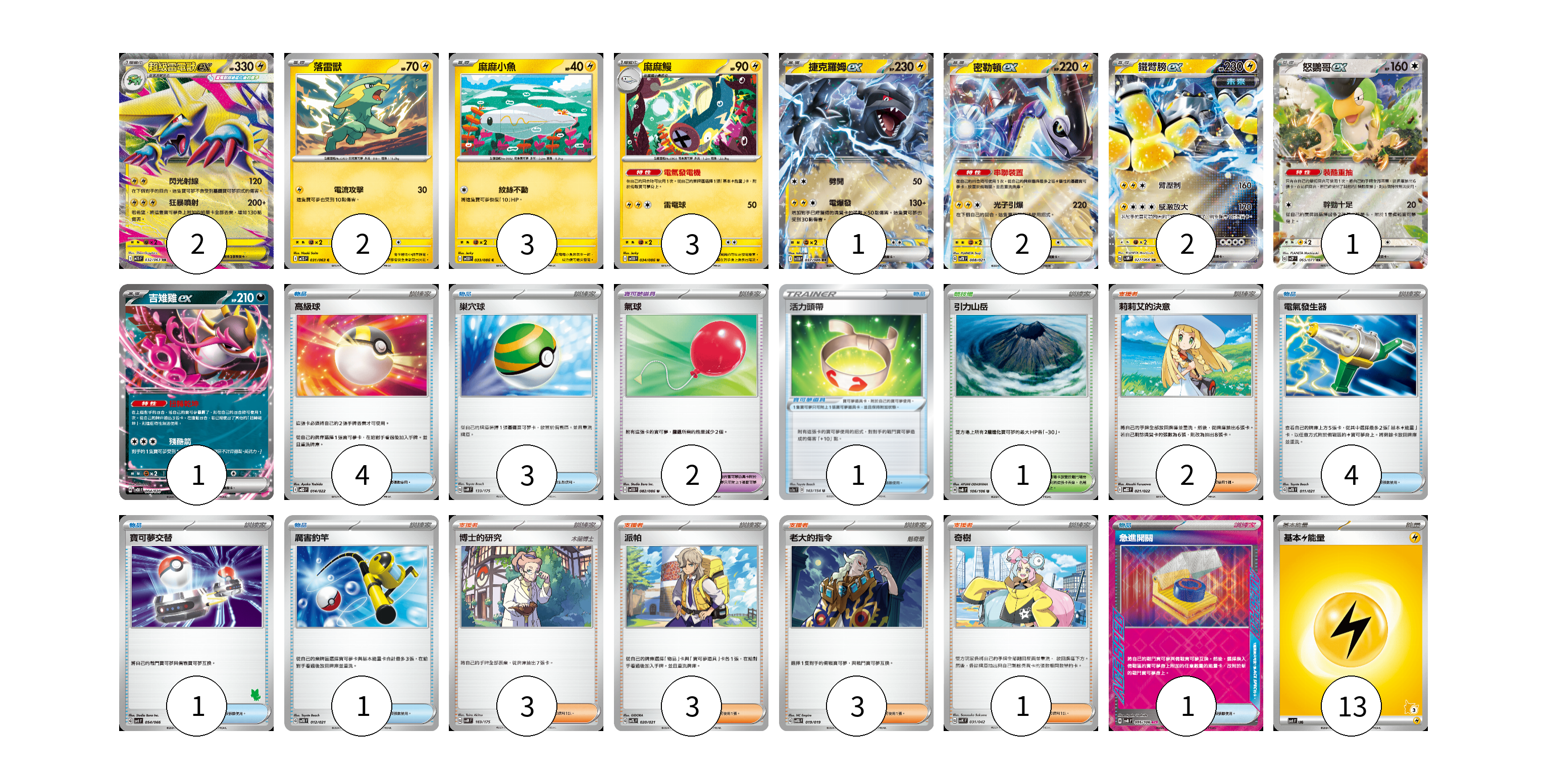 牌組構築方案 以此牌組為基礎新構築牌組 顯示卡面 顯示列表 寶可夢卡(17) 2 2 3 3 1 2 2 1 1 寶可夢道具(3) 2 1 物品卡(14) 4 3 4 1 1 1 支援者卡(12) 2 3 3 3 1 競技場卡(1) 1 能量卡(13) 13 寶可夢卡(17) 卡牌名稱 張數 卡牌名稱 張數 超級雷電獸ex M1S 032/063 02 落雷獸 M1S 031/063 02 麻麻小魚 SV11B 033/086 03 麻麻鰻 SV11B 034/086 03 捷克羅姆ex SV11B 037/086 01 密勒頓ex SVTR 008/021 02 鐵臂膀ex SV4M 027/066 02 怒鸚哥ex SV2P 065/071 01 吉雉雞ex SVOD 004/020 01 寶可夢道具(3) 卡牌名稱 張數 卡牌名稱 張數 氣球 SV11B 082/086 02 活力頭帶 SC1a 143/154 01 物品卡(14) 卡牌名稱 張數 卡牌名稱 張數 高級球 MBD 014/022 04 巢穴球 SVM 133/175 03 電氣發生器 SVTR 011/021 04 寶可夢交替 SVI 054/066 01 厲害釣竿 SVTR 012/021 01 急進開關 SV8 095/106 01 支援者卡(12) 卡牌名稱 張數 卡牌名稱 張數 莉莉艾的決意 MBD 021/022 02 博士的研究 SVM 169/175 03 派帕 SVTL 020/021 03 老大的指令 SVTG 019/019 03 奇樹 SVK 031/042 01 競技場卡(1) 卡牌名稱 張數 卡牌名稱 張數 引力山岳 SV8 106/106 01 能量卡(13) 卡牌名稱 張數 卡牌名稱 張數 基本【雷】能量 SVI LIG 13 以此牌組為基礎新構築牌組 牌組編碼 xWfWvJ-GUZASY-cjmzHB copy 列印牌組單 牌組編碼已複製 分享至SNS