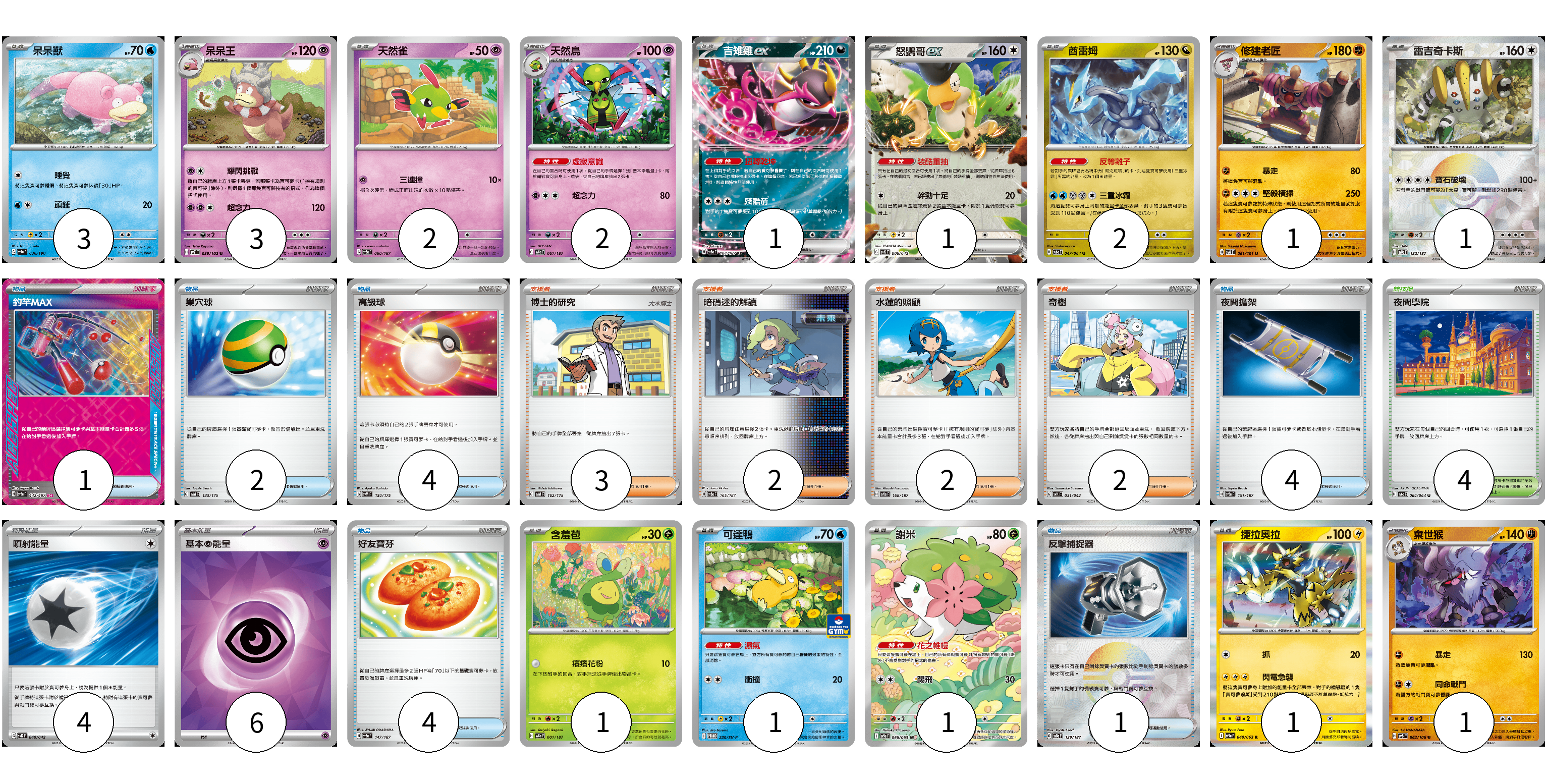 牌組構築方案 以此牌組為基礎新構築牌組 顯示卡面 顯示列表 寶可夢卡(21) 3 3 2 2 1 1 2 1 1 1 1 1 1 1 物品卡(16) 1 2 4 4 4 1 支援者卡(9) 3 2 2 2 競技場卡(4) 4 能量卡(10) 4 6 寶可夢卡(21) 卡牌名稱 張數 卡牌名稱 張數 呆呆獸 SV4a 036/190 03 呆呆王 SV7 039/102 03 天然雀 SV8a 060/187 02 天然鳥 SV8a 061/187 02 吉雉雞ex SV8a 104/187 01 怒鸚哥ex SVK 006/042 01 酋雷姆 SV6a 047/064 02 修建老匠 SV6 061/101 01 雷吉奇卡斯 SV8a 132/187 01 含羞苞 SV8a 001/187 01 可達鴨 SV-P 220/SV-P 01 謝米 SV9a 066/063 01 捷拉奧拉 SV9a 040/063 01 棄世猴 SV8 062/106 01 物品卡(16) 卡牌名稱 張數 卡牌名稱 張數 釣竿MAX SV8a 142/187 01 巢穴球 SVM 133/175 02 高級球 SVM 134/175 04 夜間擔架 SV8a 151/187 04 好友寶芬 SV8a 147/187 04 反擊捕捉器 SV8a 139/187 01 支援者卡(9) 卡牌名稱 張數 卡牌名稱 張數 博士的研究 SVM 162/175 03 暗碼迷的解讀 SV8a 165/187 02 水蓮的照顧 SV8a 168/187 02 奇樹 SVK 031/042 02 競技場卡(4) 卡牌名稱 張數 卡牌名稱 張數 夜間學院 SV6a 064/064 04 能量卡(10) 卡牌名稱 張數 卡牌名稱 張數 噴射能量 SVK 040/042 04 基本【超】能量 SVK PSY 06 以此牌組為基礎新構築牌組 牌組編碼 xXdBQQ-SMRwme-IlAgLV copy 列印牌組單 牌組編碼已複製 分享至SNS