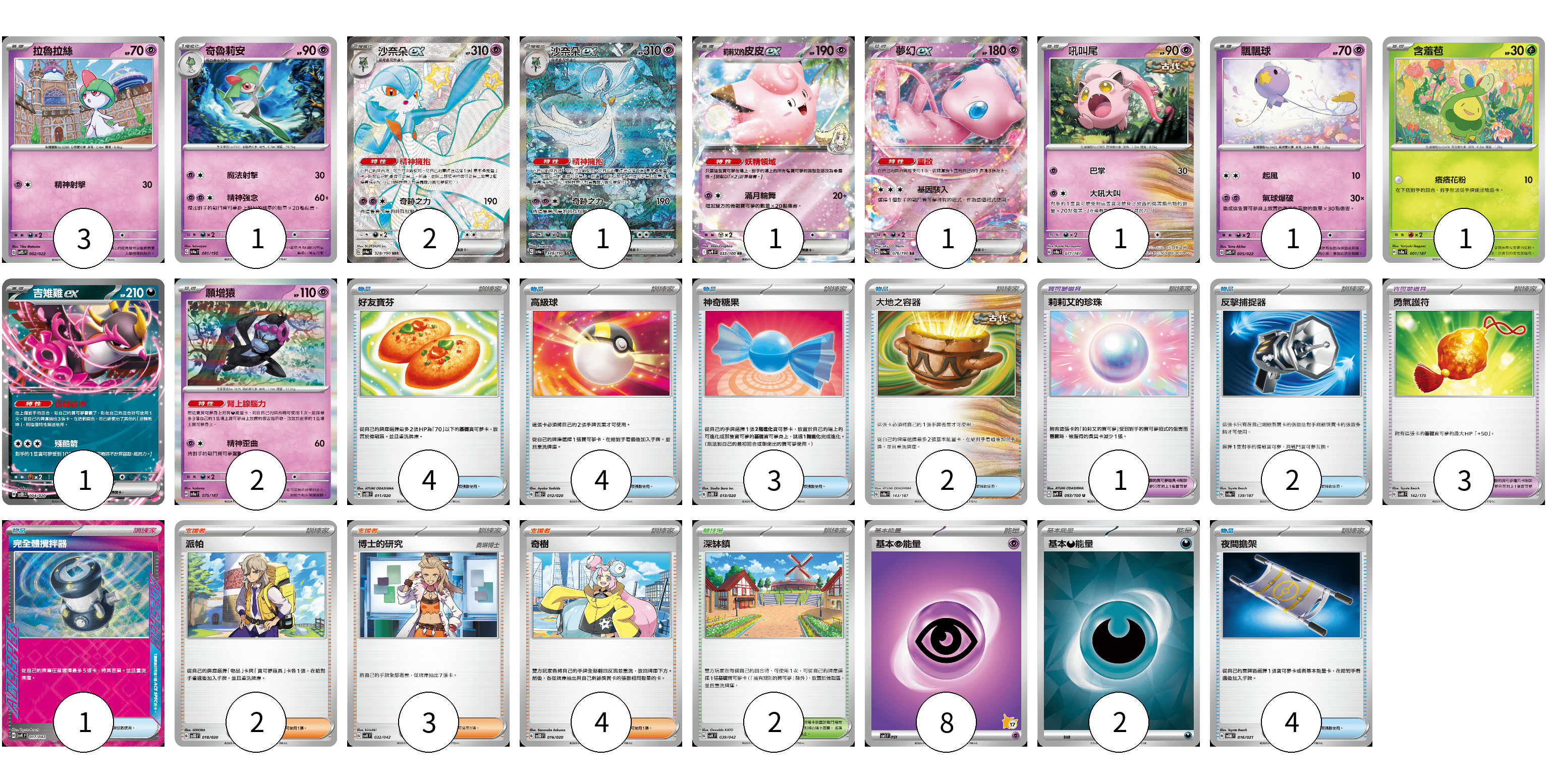 牌組構築方案 以此牌組為基礎新構築牌組 顯示卡面 顯示列表 寶可夢卡(15) 3 1 2 1 1 1 1 1 1 1 2 寶可夢道具(4) 1 3 物品卡(20) 4 4 3 2 2 1 4 支援者卡(9) 2 3 4 競技場卡(2) 2 能量卡(10) 8 2 寶可夢卡(15) 卡牌名稱 張數 卡牌名稱 張數 拉魯拉絲 SVTS 002/022 03 奇魯莉安 SV4a 081/190 01 沙奈朵ex SV4a 328/190 02 沙奈朵ex SV4a 348/190 01 莉莉艾的皮皮ex SV9 033/100 01 夢幻ex SV4a 076/190 01 吼叫尾 SV8a 071/187 01 飄飄球 SVTS 005/022 01 含羞苞 SV8a 001/187 01 吉雉雞ex SVOD 004/020 01 願增猿 SV8a 075/187 02 寶可夢道具(4) 卡牌名稱 張數 卡牌名稱 張數 莉莉艾的珍珠 SV9 093/100 01 勇氣護符 SVM 142/175 03 物品卡(20) 卡牌名稱 張數 卡牌名稱 張數 好友寶芬 SVOD 011/020 04 高級球 SVOD 012/020 04 神奇糖果 SVOD 013/020 03 大地之容器 SV8a 143/187 02 反擊捕捉器 SV8a 139/187 02 完全體攪拌器 SVK 017/042 01 夜間擔架 SVOM 016/021 04 支援者卡(9) 卡牌名稱 張數 卡牌名稱 張數 派帕 SVOD 018/020 02 博士的研究 SVK 032/042 03 奇樹 SVOD 016/020 04 競技場卡(2) 卡牌名稱 張數 卡牌名稱 張數 深缽鎮 SVK 039/042 02 能量卡(10) 卡牌名稱 張數 卡牌名稱 張數 基本【超】能量 SVI PSY 08 基本【惡】能量 SVOM DAR 02 以此牌組為基礎新構築牌組 牌組編碼 xXyjXt-fBoseu-XyWoFP copy 列印牌組單 牌組編碼已複製 分享至SNS