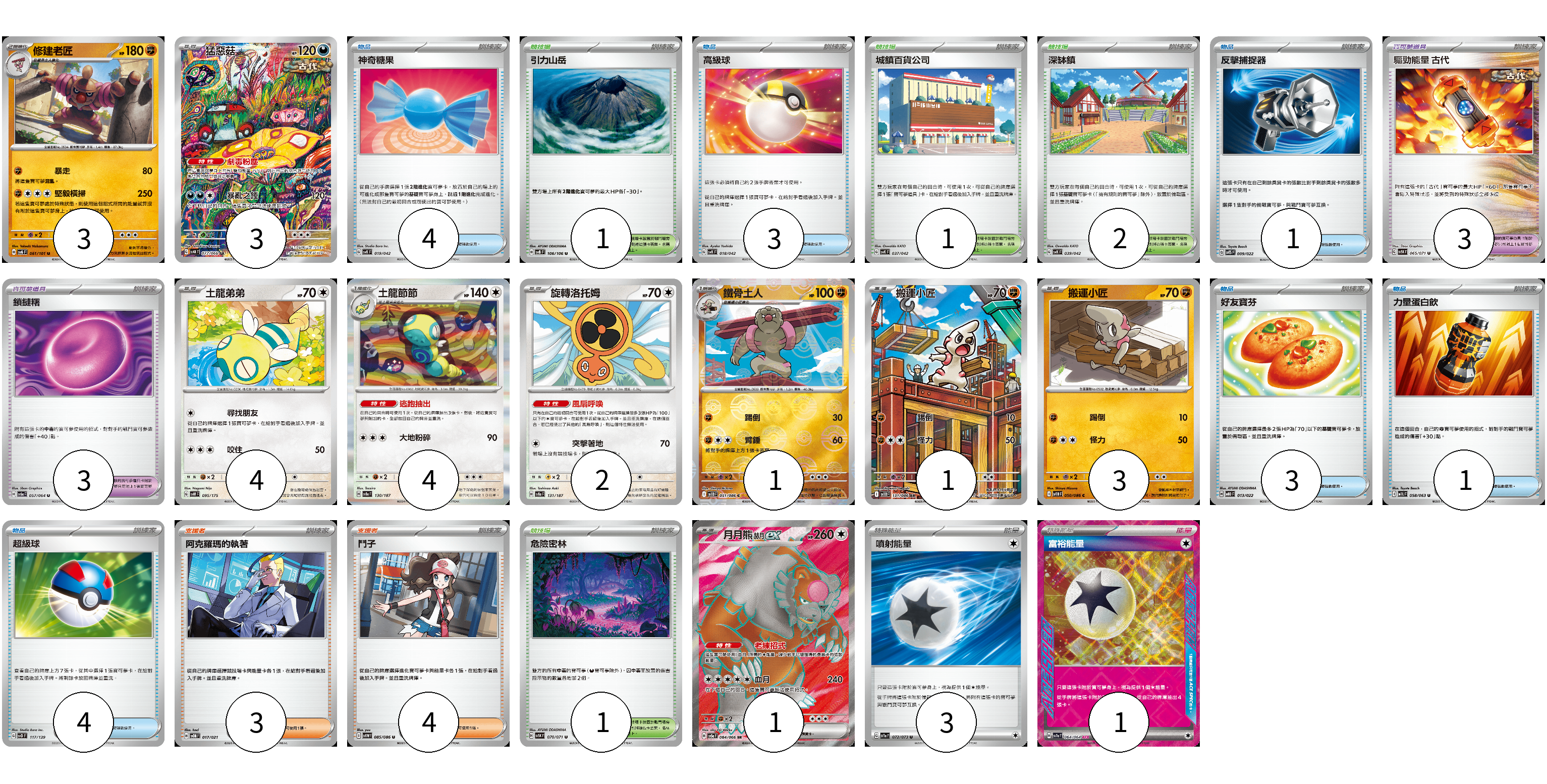 牌組構築方案 以此牌組為基礎新構築牌組 顯示卡面 顯示列表 寶可夢卡(22) 3 3 4 4 2 1 1 3 1 寶可夢道具(6) 3 3 物品卡(16) 4 3 1 3 1 4 支援者卡(7) 3 4 競技場卡(5) 1 1 2 1 能量卡(4) 3 1 寶可夢卡(22) 卡牌名稱 張數 卡牌名稱 張數 修建老匠 SV6 061/101 03 猛惡菇 SV4K 077/066 03 土龍弟弟 SVM 095/175 04 土龍節節 SV8a 130/187 04 旋轉洛托姆 SV8a 131/187 02 鐵骨土人 SV11B 051/086 01 搬運小匠 SV11B 131/086 01 搬運小匠 SV11B 050/086 03 月月熊 赫月 ex SV5a 084/066 01 寶可夢道具(6) 卡牌名稱 張數 卡牌名稱 張數 驅勁能量 古代 SV5K 065/071 03 鎖鏈糬 SV6a 057/064 03 物品卡(16) 卡牌名稱 張數 卡牌名稱 張數 神奇糖果 SVK 019/042 04 高級球 SVK 018/042 03 反擊捕捉器 SVTS 009/022 01 好友寶芬 MBD 013/022 03 力量蛋白飲 M1L 058/063 01 超級球 SVD 117/139 04 支援者卡(7) 卡牌名稱 張數 卡牌名稱 張數 阿克羅瑪的執著 SVOM 017/021 03 鬥子 SV11W 085/086 04 競技場卡(5) 卡牌名稱 張數 卡牌名稱 張數 引力山岳 SV8 106/106 01 城鎮百貨公司 SVK 037/042 01 深缽鎮 SVK 039/042 02 危險密林 SV5K 070/071 01 能量卡(4) 卡牌名稱 張數 卡牌名稱 張數 噴射能量 SV1a 072/073 03 富裕能量 SV7a 064/064 01 以此牌組為基礎新構築牌組 牌組編碼 xZtmes-RFqfiw-jTVWEo copy 列印牌組單 牌組編碼已複製 分享至SNS