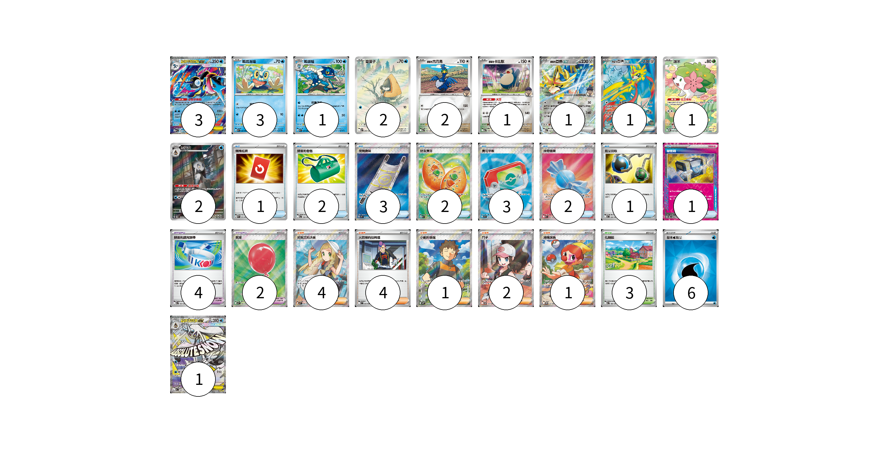 牌組構築方案 以此牌組為基礎新構築牌組 顯示卡面 顯示列表 寶可夢卡(18) 3 3 1 2 2 1 1 1 1 2 1 寶可夢道具(6) 4 2 物品卡(15) 1 2 3 2 3 2 1 1 支援者卡(12) 4 4 1 2 1 競技場卡(3) 3 能量卡(6) 6 寶可夢卡(18) 卡牌名稱 張數 卡牌名稱 張數 超級甲賀忍蛙ex M4 022/083 03 呱呱泡蛙 M4 020/083 03 呱頭蛙 M4 021/083 01 雪童子 M2a 200/193 02 赫普的古月鳥 M2a 143/193 02 赫普的卡比獸 M2a 136/193 01 赫普的蒼響ex M2a 123/193 01 赫普的蒼響ex SV9 118/100 01 謝米 SV9a 066/063 01 雪妖女 SV6 104/101 02 超級雪妖女ex M2a 224/193 01 寶可夢道具(6) 卡牌名稱 張數 卡牌名稱 張數 赫普的講究頭帶 M2a 167/193 04 氣球 M1L 084/063 02 物品卡(15) 卡牌名稱 張數 卡牌名稱 張數 特殊紅牌 M4 072/083 01 赫普的包包 M2a 156/193 02 夜間擔架 M1L 083/063 03 好友寶芬 M1S 081/063 02 寶可平板 M3 103/080 03 神奇糖果 M1S 082/063 02 能量回收 MC 636/742 01 秘密箱 SV6 092/101 01 支援者卡(12) 卡牌名稱 張數 卡牌名稱 張數 莉莉艾的決意 M1L 086/063 04 火箭隊的拉姆達 SV10 094/098 04 小剛的發掘 SV9 123/100 01 鬥子 SV11W 166/086 02 滑稽演員 SV11W 165/086 01 競技場卡(3) 卡牌名稱 張數 卡牌名稱 張數 化朗鎮 M2a 186/193 03 能量卡(6) 卡牌名稱 張數 卡牌名稱 張數 基本【水】能量 SVM WAT 06 以此牌組為基礎新構築牌組 牌組編碼 xahOkz-KLNWvg-TiQYAv copy 列印牌組單 牌組編碼已複製 分享至SNS