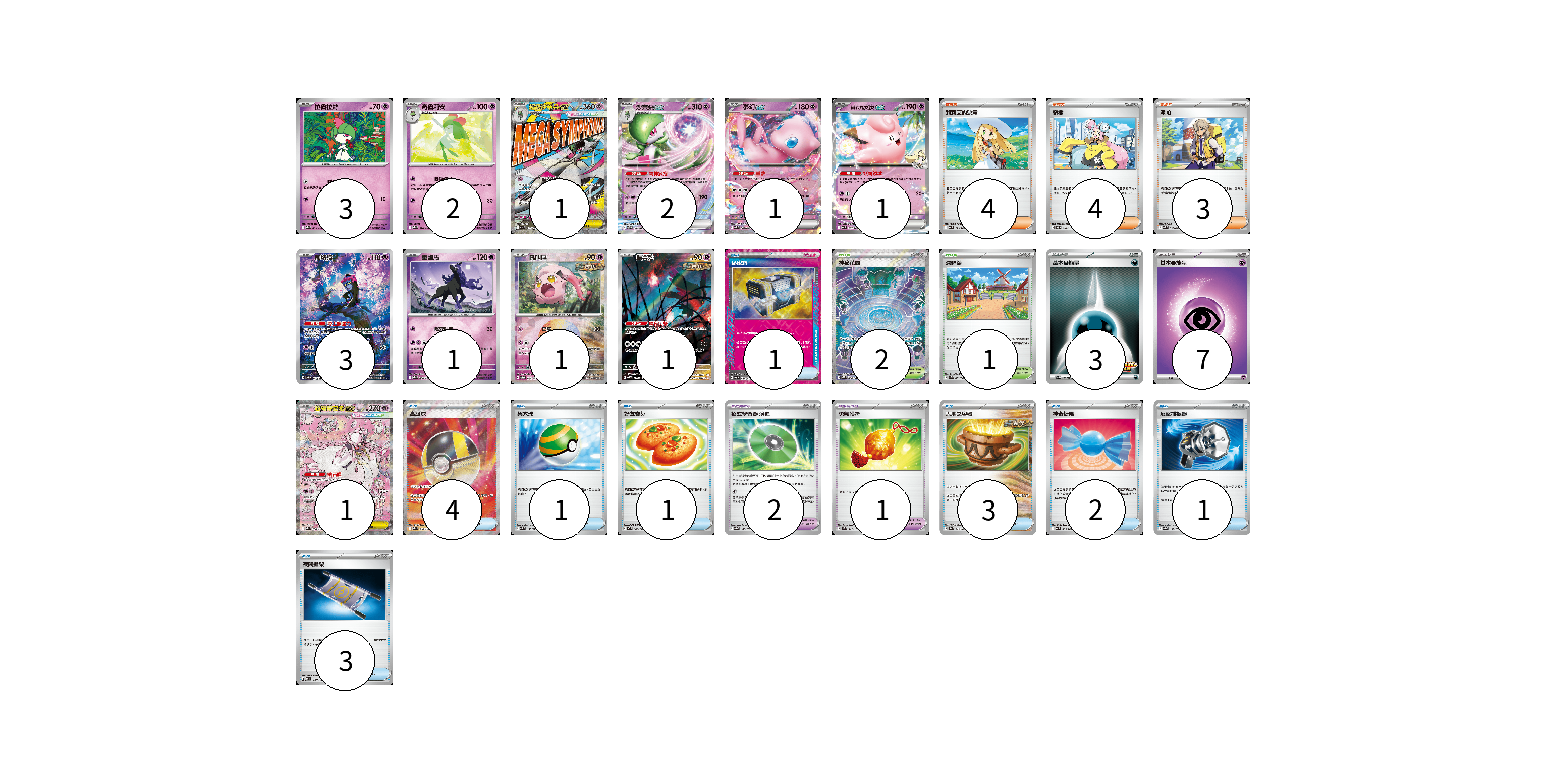 牌組構築方案 以此牌組為基礎新構築牌組 顯示卡面 顯示列表 寶可夢卡(17) 3 2 1 2 1 1 3 1 1 1 1 寶可夢道具(3) 2 1 物品卡(16) 1 4 1 1 3 2 1 3 支援者卡(11) 4 4 3 競技場卡(3) 2 1 能量卡(10) 3 7 寶可夢卡(17) 卡牌名稱 張數 卡牌名稱 張數 拉魯拉絲 M2a 069/193 03 奇魯莉安 M2a 070/193 02 超級沙奈朵ex M2a 226/193 01 沙奈朵ex SVTS 004/022 02 夢幻ex SVK 001/042 01 <莉莉艾的>皮皮ex MC 287/742 01 願增猿 SV6 107/101 03 靈幽馬 M2a 080/193 01 吼叫尾 SV8a 071/187 01 振翼髮 SV5K 076/071 01 超級蒂安希ex M2a 238/193 01 寶可夢道具(3) 卡牌名稱 張數 卡牌名稱 張數 招式學習器 演進 SV8a 160/187 02 勇氣護符 SVM 142/175 01 物品卡(16) 卡牌名稱 張數 卡牌名稱 張數 秘密箱 SV6 092/101 01 高級球 M2a 216/193 04 巢穴球 SVM 133/175 01 好友寶芬 MC 648/742 01 大地之容器 SV8a 143/187 03 神奇糖果 MC 655/742 02 反擊捕捉器 SV8a 139/187 01 夜間擔架 MC 670/742 03 支援者卡(11) 卡牌名稱 張數 卡牌名稱 張數 莉莉艾的決意 MC 729/742 04 奇樹 SVOD 016/020 04 派帕 SVK 035/042 03 競技場卡(3) 卡牌名稱 張數 卡牌名稱 張數 神秘花園 M1S 086/063 02 深缽鎮 SVK 039/042 01 能量卡(10) 卡牌名稱 張數 卡牌名稱 張數 基本【惡】能量 SV-P 263/SV-P 03 基本【超】能量 MC PSY 07 以此牌組為基礎新構築牌組 牌組編碼 xaqVyG-FELcfn-tweCOP copy 列印牌組單 牌組編碼已複製 分享至SNS