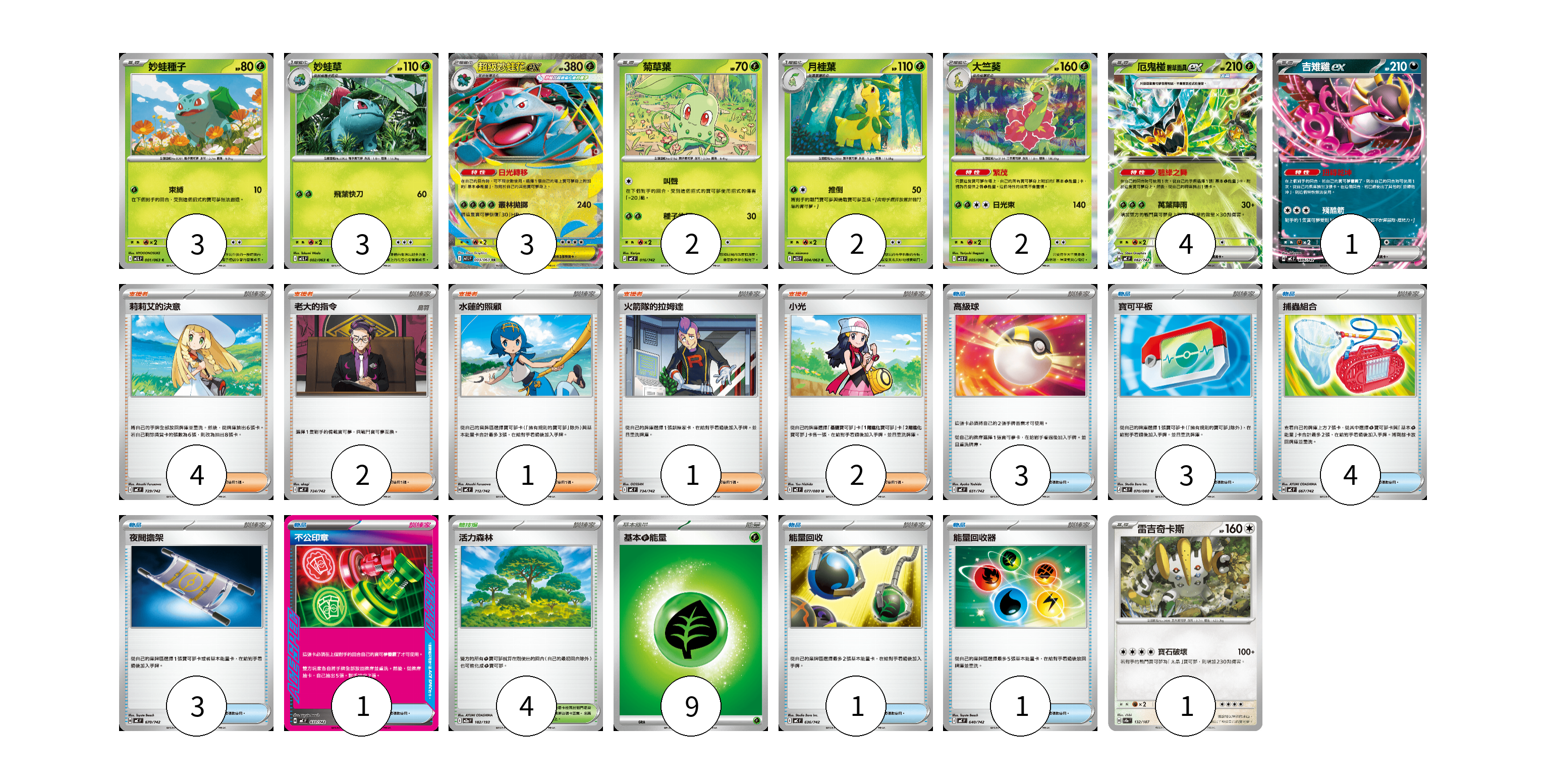 牌組構築方案 以此牌組為基礎新構築牌組 顯示卡面 顯示列表 寶可夢卡(21) 3 3 3 2 2 2 4 1 1 物品卡(16) 3 3 4 3 1 1 1 支援者卡(10) 4 2 1 1 2 競技場卡(4) 4 能量卡(9) 9 寶可夢卡(21) 卡牌名稱 張數 卡牌名稱 張數 妙蛙種子 M1L 001/063 03 妙蛙草 M1L 002/063 03 超級妙蛙花ex M1L 003/063 03 菊草葉 MC 016/742 02 月桂葉 M1S 004/063 02 大竺葵 M1S 005/063 02 厄鬼椪 碧草面具ex MC 082/742 04 吉雉雞ex MC 489/742 01 雷吉奇卡斯 SV8a 132/187 01 物品卡(16) 卡牌名稱 張數 卡牌名稱 張數 高級球 MC 651/742 03 寶可平板 M3 070/080 03 捕蟲組合 MC 667/742 04 夜間擔架 MC 670/742 03 不公印章 MC 633/742 01 能量回收 MC 636/742 01 能量回收器 MC 640/742 01 支援者卡(10) 卡牌名稱 張數 卡牌名稱 張數 莉莉艾的決意 MC 729/742 04 老大的指令 MC 724/742 02 水蓮的照顧 MC 712/742 01 火箭隊的拉姆達 MC 734/742 01 小光 M2 077/080 02 競技場卡(4) 卡牌名稱 張數 卡牌名稱 張數 活力森林 M2a 182/193 04 能量卡(9) 卡牌名稱 張數 卡牌名稱 張數 基本【草】能量 MC GRA 09 以此牌組為基礎新構築牌組 牌組編碼 xdCQrC-afexMv-IglrIj copy 列印牌組單 牌組編碼已複製 分享至SNS