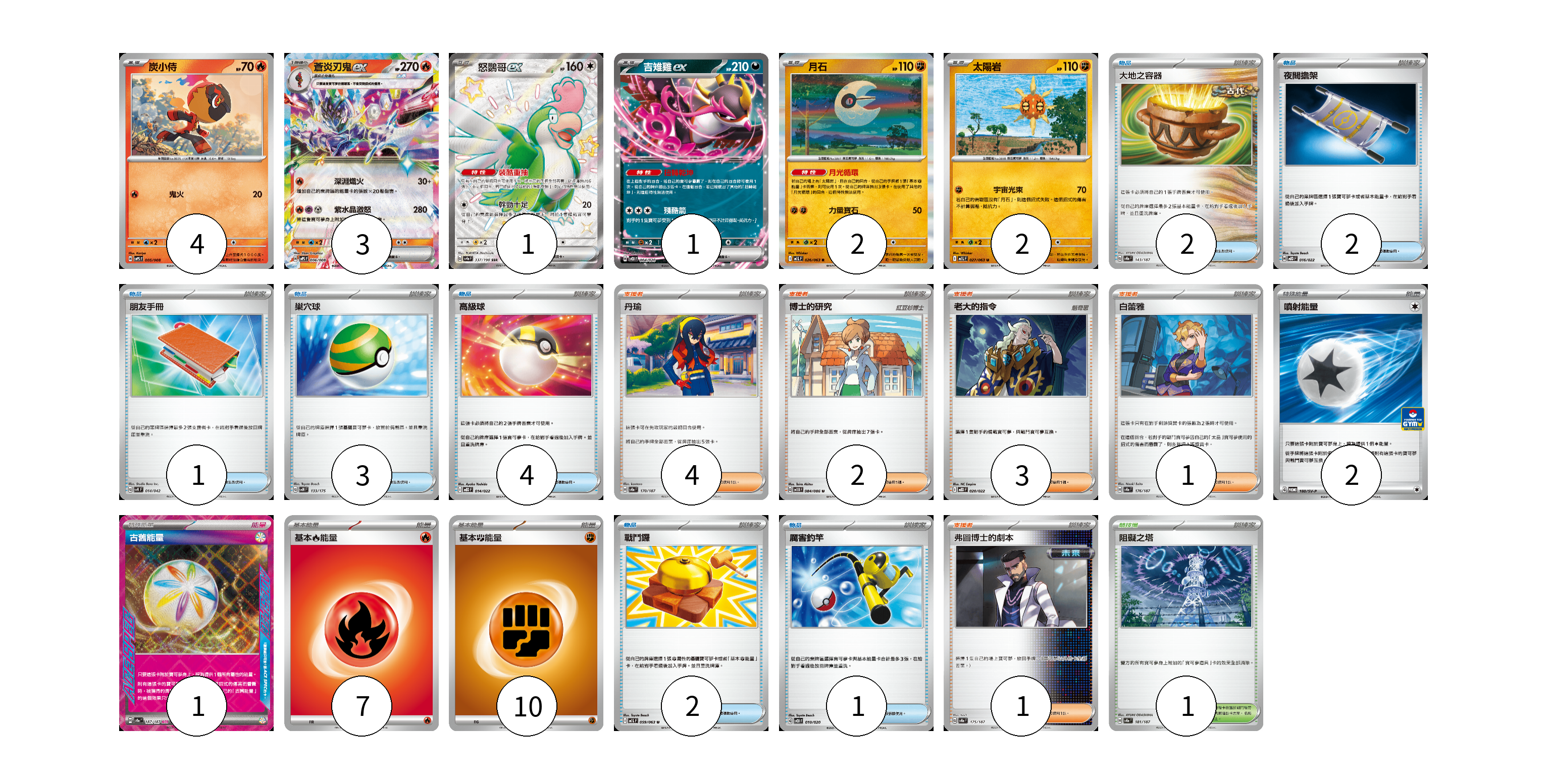 牌組構築方案 以此牌組為基礎新構築牌組 顯示卡面 顯示列表 寶可夢卡(13) 4 3 1 1 2 2 物品卡(15) 2 2 1 3 4 2 1 支援者卡(11) 4 2 3 1 1 競技場卡(1) 1 能量卡(20) 2 1 7 10 寶可夢卡(13) 卡牌名稱 張數 卡牌名稱 張數 炭小侍 SVPS 005/008 04 蒼炎刃鬼ex SVPS 006/008 03 怒鸚哥ex SV4a 337/190 01 吉雉雞ex SVOD 004/020 01 月石 M1L 026/063 02 太陽岩 M1L 027/063 02 物品卡(15) 卡牌名稱 張數 卡牌名稱 張數 大地之容器 SV8a 143/187 02 夜間擔架 MBD 016/022 02 朋友手冊 SVK 014/042 01 巢穴球 SVM 133/175 03 高級球 MBD 014/022 04 戰鬥鑼 M1L 059/063 02 厲害釣竿 SVOD 010/020 01 支援者卡(11) 卡牌名稱 張數 卡牌名稱 張數 丹瑜 SV8a 170/187 04 博士的研究 SV11B 084/086 02 老大的指令 MBD 020/022 03 白蕾雅 SV8a 176/187 01 弗圖博士的劇本 SV8a 175/187 01 競技場卡(1) 卡牌名稱 張數 卡牌名稱 張數 阻礙之塔 SV8a 181/187 01 能量卡(20) 卡牌名稱 張數 卡牌名稱 張數 噴射能量 SV-P 180/SV-P 02 古舊能量 SV8a 187/187 01 基本火能量 sv-p FIR 07 基本鬥能量 sv-p FIG 10 以此牌組為基礎新構築牌組 牌組編碼 xeLiug-sJwKee-OvICKx copy 列印牌組單 牌組編碼已複製 分享至SNS