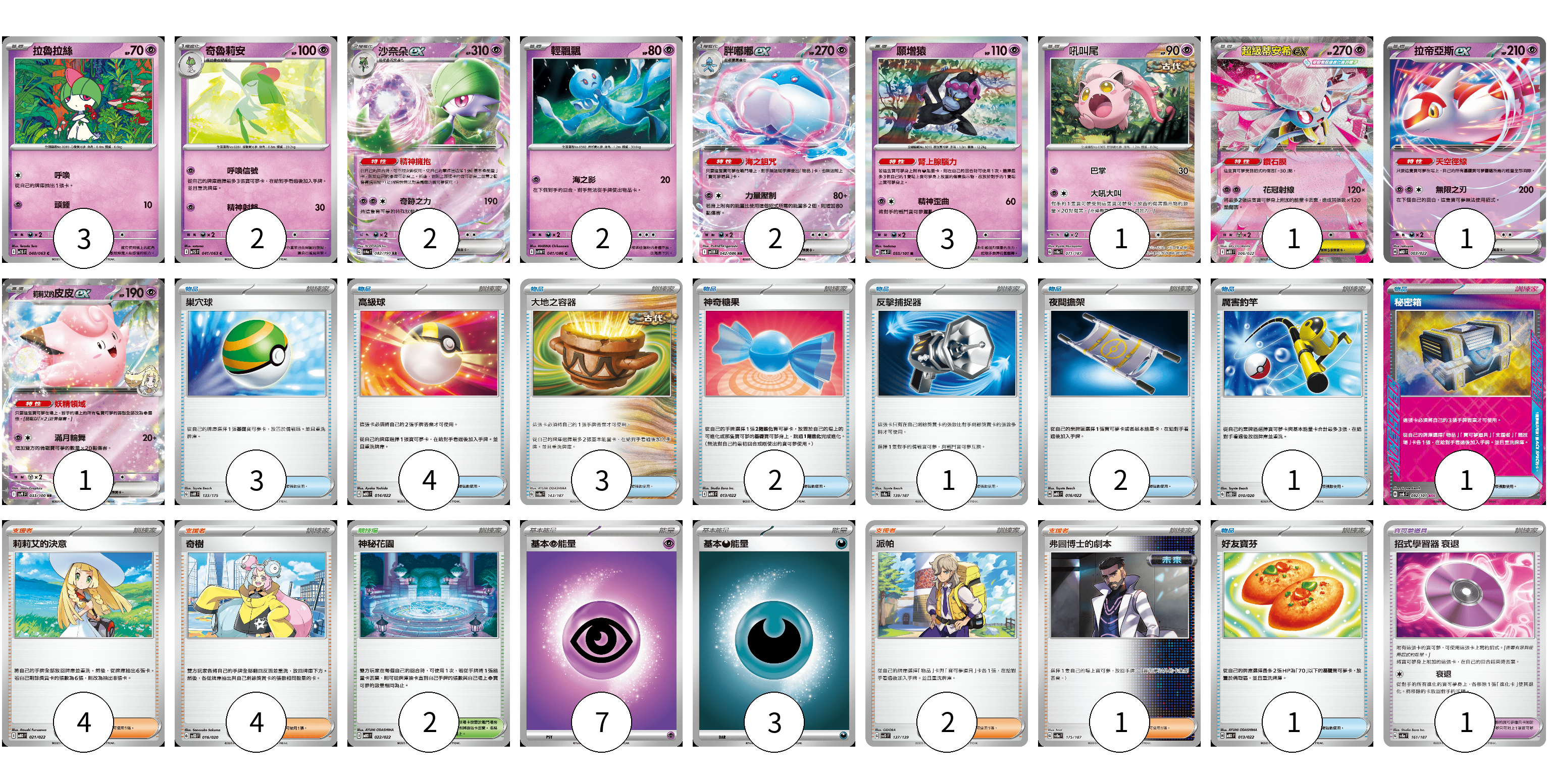 牌組構築方案 以此牌組為基礎新構築牌組 顯示卡面 顯示列表 寶可夢卡(18) 3 2 2 2 2 3 1 1 1 1 寶可夢道具(1) 1 物品卡(18) 3 4 3 2 1 2 1 1 1 支援者卡(11) 4 4 2 1 競技場卡(2) 2 能量卡(10) 7 3 寶可夢卡(18) 卡牌名稱 張數 卡牌名稱 張數 拉魯拉絲 M1S 040/063 03 奇魯莉安 M1S 041/063 02 沙奈朵ex SV4a 082/190 02 輕飄飄 SV11W 041/086 02 胖嘟嘟ex SV11W 042/086 02 願增猿 SV6 055/101 03 吼叫尾 SV8a 071/187 01 超級蒂安希ex MBD 006/022 01 拉帝亞斯ex MBD 003/022 01 莉莉艾的皮皮ex SV9 033/100 01 寶可夢道具(1) 卡牌名稱 張數 卡牌名稱 張數 招式學習器 衰退 SV8a 161/187 01 物品卡(18) 卡牌名稱 張數 卡牌名稱 張數 巢穴球 SVM 133/175 03 高級球 MBD 014/022 04 大地之容器 SV8a 143/187 03 神奇糖果 MBG 013/022 02 反擊捕捉器 SV8a 139/187 01 夜間擔架 MBD 016/022 02 厲害釣竿 SVOD 010/020 01 秘密箱 SV6 092/101 01 好友寶芬 MBD 013/022 01 支援者卡(11) 卡牌名稱 張數 卡牌名稱 張數 莉莉艾的決意 MBD 021/022 04 奇樹 SVOD 016/020 04 派帕 SVD 137/139 02 弗圖博士的劇本 SV8a 175/187 01 競技場卡(2) 卡牌名稱 張數 卡牌名稱 張數 神秘花園 MBD 022/022 02 能量卡(10) 卡牌名稱 張數 卡牌名稱 張數 基本【超】能量 MBD PSY 07 基本【惡】能量 MBG DAR 03 以此牌組為基礎新構築牌組 牌組編碼 xfKdjX-oKkaTP-FSVAcW copy 列印牌組單 牌組編碼已複製 分享至SNS