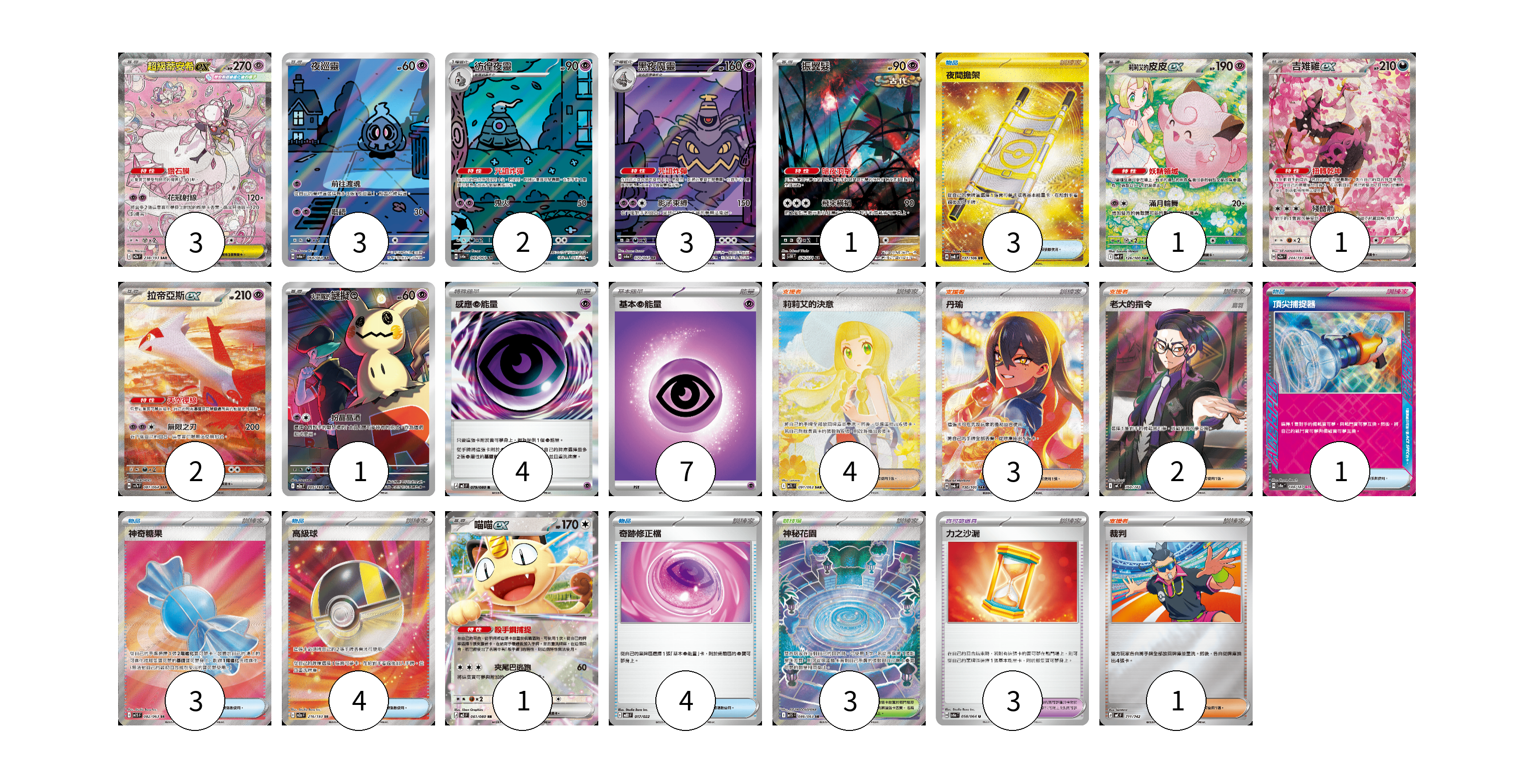 牌組構築方案 以此牌組為基礎新構築牌組 顯示卡面 顯示列表 寶可夢卡(18) 3 3 2 3 1 1 1 2 1 1 寶可夢道具(3) 3 物品卡(15) 3 1 3 4 4 支援者卡(10) 4 3 2 1 競技場卡(3) 3 能量卡(11) 4 7 寶可夢卡(18) 卡牌名稱 張數 卡牌名稱 張數 超級蒂安希ex M2a 238/193 03 夜巡靈 SV6a 068/064 03 彷徨夜靈 SV6a 069/064 02 黑夜魔靈 SV6a 070/064 03 振翼髮 SV5K 076/071 01 莉莉艾的皮皮ex SV9 126/100 01 吉雉雞ex M2a 244/193 01 拉帝亞斯ex SV7a 087/064 02 <火箭隊的>謎擬Q M2a 205/193 01 喵喵ex M3 061/080 01 寶可夢道具(3) 卡牌名稱 張數 卡牌名稱 張數 力之沙漏 SV6a 058/064 03 物品卡(15) 卡牌名稱 張數 卡牌名稱 張數 夜間擔架 SV8 137/106 03 頂尖捕捉器 SV8a 148/187 01 神奇糖果 M1S 082/063 03 高級球 M2a 216/193 04 奇跡修正檔 MBD 017/022 04 支援者卡(10) 卡牌名稱 張數 卡牌名稱 張數 莉莉艾的決意 M1L 091/063 04 丹瑜 SV6 130/101 03 老大的指令(烏羽) MC 760/742 02 裁判 MC 711/742 01 競技場卡(3) 卡牌名稱 張數 卡牌名稱 張數 神秘花園 M1S 086/063 03 能量卡(11) 卡牌名稱 張數 卡牌名稱 張數 感應【超】能量 M3 079/080 04 基本【超】能量 MBD PSY 07 以此牌組為基礎新構築牌組 牌組編碼 xhQTdh-AmnWhZ-rThLEx copy 列印牌組單 牌組編碼已複製 分享至SNS