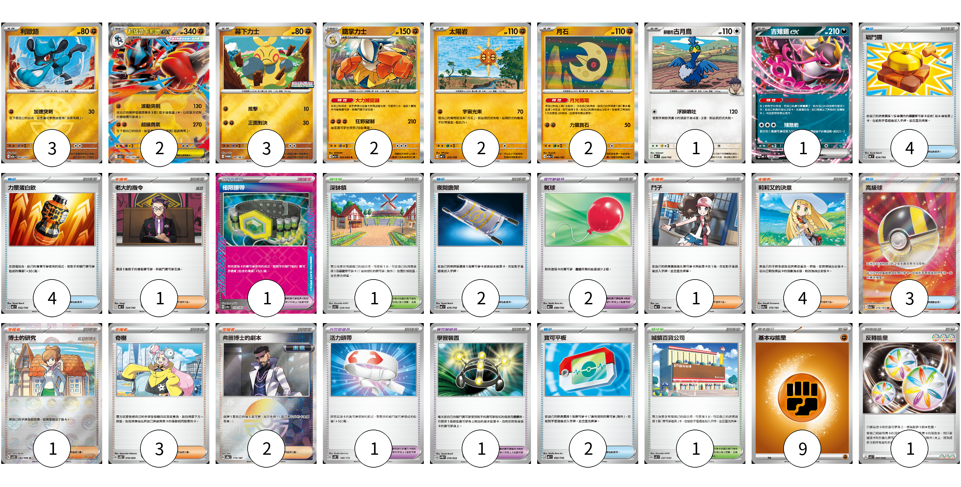 牌組構築方案 以此牌組為基礎新構築牌組 顯示卡面 顯示列表 寶可夢卡(16) 3 2 3 2 2 2 1 1 寶可夢道具(5) 1 2 1 1 物品卡(15) 4 4 2 3 2 支援者卡(12) 1 1 4 1 3 2 競技場卡(2) 1 1 能量卡(10) 9 1 寶可夢卡(16) 卡牌名稱 張數 卡牌名稱 張數 利歐路 M2a 091/193 03 超級路卡利歐ex M2a 092/193 02 幕下力士 M-P 007/M-P 03 鐵掌力士 M1L 025/063 02 太陽岩 MC 372/742 02 月石 M2a 086/193 02 <赫普的>古月鳥 MC 624/742 01 吉雉雞ex MC 489/742 01 寶可夢道具(5) 卡牌名稱 張數 卡牌名稱 張數 極限腰帶 SV8a 159/187 01 氣球 MC 688/742 02 活力頭帶 SVM 140/175 01 學習裝置 SVTM 016/022 01 物品卡(15) 卡牌名稱 張數 卡牌名稱 張數 戰鬥鑼 MC 654/742 04 力量蛋白飲 MC 652/742 04 夜間擔架 MC 670/742 02 高級球 M2a 216/193 03 寶可平板 MC 662/742 02 支援者卡(12) 卡牌名稱 張數 卡牌名稱 張數 老大的指令 MC 724/742 01 鬥子 MC 718/742 01 莉莉艾的決意 M2a 175/193 04 博士的研究 SV11B 084/086 01 奇樹 SVOD 016/020 03 弗圖博士的劇本 SV8a 175/187 02 競技場卡(2) 卡牌名稱 張數 卡牌名稱 張數 深缽鎮 SVK 039/042 01 城鎮百貨公司 SVK 037/042 01 能量卡(10) 卡牌名稱 張數 卡牌名稱 張數 基本【鬥】能量 MC FIG 09 反轉能量 SVK 041/042 01 以此牌組為基礎新構築牌組 牌組編碼 xjCiDV-KVGhHz-lLhjbG copy 列印牌組單 牌組編碼已複製 分享至SNS