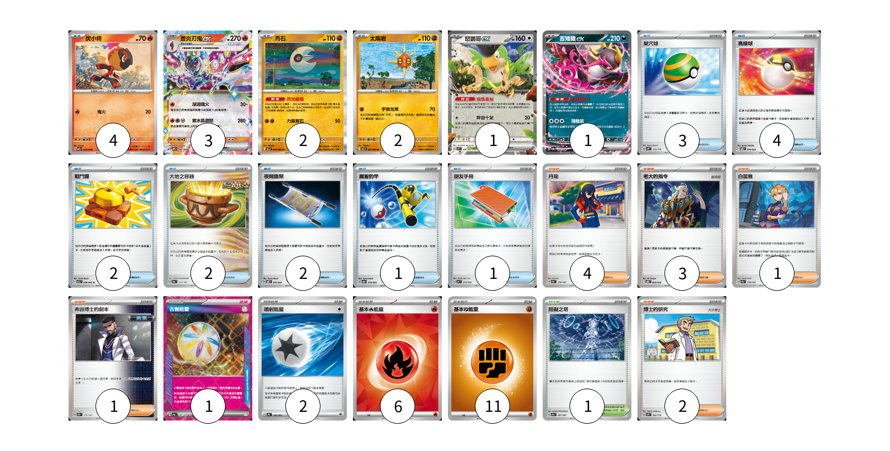 牌組構築方案 以此牌組為基礎新構築牌組 顯示卡面 顯示列表 寶可夢卡(13) 4 3 2 2 1 1 物品卡(15) 3 4 2 2 2 1 1 支援者卡(11) 4 3 1 1 2 競技場卡(1) 1 能量卡(20) 1 2 6 11 寶可夢卡(13) 卡牌名稱 張數 卡牌名稱 張數 炭小侍 SVPS 005/008 04 蒼炎刃鬼ex SVPS 006/008 03 月石 M1L 026/063 02 太陽岩 M1L 027/063 02 怒鸚哥ex SVK 006/042 01 吉雉雞ex SVOD 004/020 01 物品卡(15) 卡牌名稱 張數 卡牌名稱 張數 巢穴球 SVM 133/175 03 高級球 MBD 014/022 04 戰鬥鑼 M1L 059/063 02 大地之容器 SV8a 143/187 02 夜間擔架 MBD 016/022 02 厲害釣竿 SVOD 010/020 01 朋友手冊 SVK 014/042 01 支援者卡(11) 卡牌名稱 張數 卡牌名稱 張數 丹瑜 SV8a 170/187 04 老大的指令 MBD 020/022 03 白蕾雅 SV8a 176/187 01 弗圖博士的劇本 SV8a 175/187 01 博士的研究 SVM 162/175 02 競技場卡(1) 卡牌名稱 張數 卡牌名稱 張數 阻礙之塔 SV8a 181/187 01 能量卡(20) 卡牌名稱 張數 卡牌名稱 張數 古舊能量 SV8a 187/187 01 噴射能量 SV8a 185/187 02 基本【火】能量 SVQL FIR 06 基本【鬥】能量 M-P FIG 11 以此牌組為基礎新構築牌組 牌組編碼 xjqTNj-UqIYtx-lzBAgD copy 列印牌組單 牌組編碼已複製 分享至SNS
