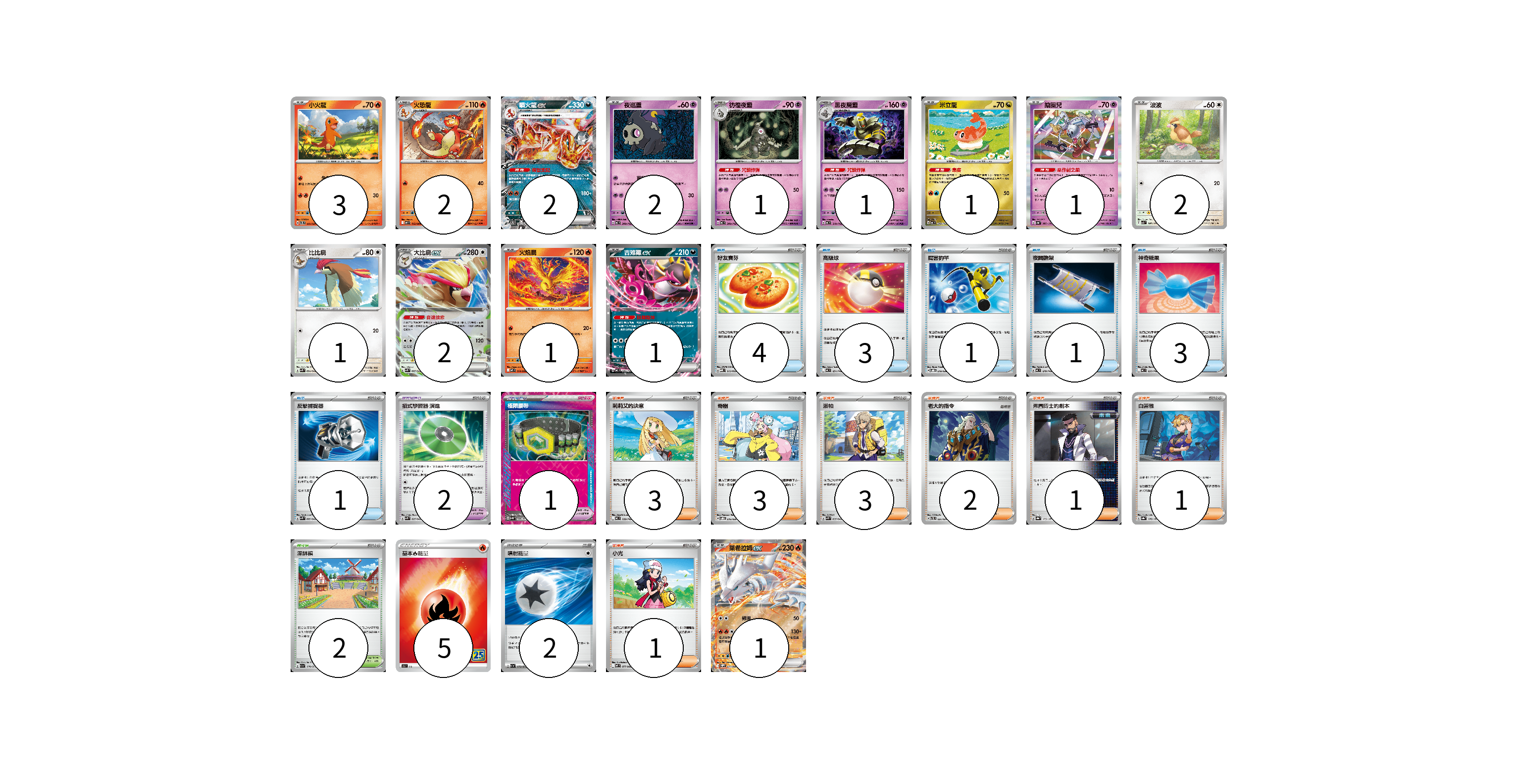 牌組構築方案 以此牌組為基礎新構築牌組 顯示卡面 顯示列表 寶可夢卡(21) 3 2 2 2 1 1 1 1 2 1 2 1 1 1 寶可夢道具(3) 2 1 物品卡(13) 4 3 1 1 3 1 支援者卡(14) 3 3 3 2 1 1 1 競技場卡(2) 2 能量卡(7) 5 2 寶可夢卡(21) 卡牌名稱 張數 卡牌名稱 張數 小火龍 SVTL 001/021 03 火恐龍 M2 012/080 02 噴火龍ex SVTL 006/021 02 夜巡靈 MC 308/742 02 彷徨夜靈 MC 309/742 01 黑夜魔靈 MC 310/742 01 米立龍 MC 549/742 01 鑰圈兒 SV4a 087/190 01 波波 SV3 087/108 02 比比鳥 SVK 004/042 01 大比鳥ex SVK 005/042 02 火焰鳥 M2 014/080 01 吉雉雞ex MC 489/742 01 萊希拉姆ex SV11W 017/086 01 寶可夢道具(3) 卡牌名稱 張數 卡牌名稱 張數 招式學習器 演進 SVK 025/042 02 極限腰帶 SV5K 066/071 01 物品卡(13) 卡牌名稱 張數 卡牌名稱 張數 好友寶芬 MBD 013/022 04 高級球 MC 651/742 03 厲害釣竿 SVOD 010/020 01 夜間擔架 MC 670/742 01 神奇糖果 MC 655/742 03 反擊捕捉器 SVK 009/042 01 支援者卡(14) 卡牌名稱 張數 卡牌名稱 張數 莉莉艾的決意 MC 729/742 03 奇樹 SVOD 016/020 03 派帕 SVK 035/042 03 老大的指令 SVTL 021/021 02 弗圖博士的劇本 SV8a 175/187 01 白蕾雅 SV8a 176/187 01 小光 M2 077/080 01 競技場卡(2) 卡牌名稱 張數 卡牌名稱 張數 深缽鎮 SV1a 070/073 02 能量卡(7) 卡牌名稱 張數 卡牌名稱 張數 基本火能量 S8a FIR 05 噴射能量 SV1a 072/073 02 以此牌組為基礎新構築牌組 牌組編碼 xkEhsd-WADjCt-aAMweO copy 列印牌組單 牌組編碼已複製 分享至SNS