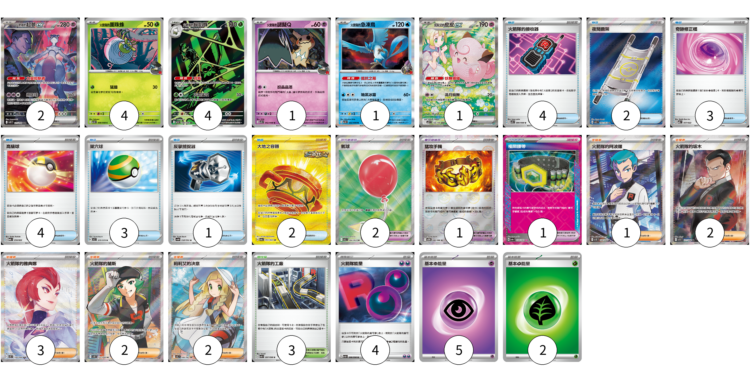 牌組構築方案 以此牌組為基礎新構築牌組 顯示卡面 顯示列表 寶可夢卡(13) 2 4 4 1 1 1 寶可夢道具(4) 2 1 1 物品卡(19) 4 2 3 4 3 1 2 支援者卡(10) 1 2 3 2 2 競技場卡(3) 3 能量卡(11) 4 5 2 寶可夢卡(13) 卡牌名稱 張數 卡牌名稱 張數 <火箭隊的>超夢ex SV10 125/098 02 <火箭隊的>團珠蛛 SV10 008/098 04 <火箭隊的>操陷蛛 SV10 099/098 04 <火箭隊的>謎擬Q SV10 042/098 01 <火箭隊的>急凍鳥 SV10 022/098 01 莉莉艾的皮皮ex SV9 126/100 01 寶可夢道具(4) 卡牌名稱 張數 卡牌名稱 張數 氣球 M1L 084/063 02 猛攻手鐲 SV11W 082/086 01 極限腰帶 SV8a 159/187 01 物品卡(19) 卡牌名稱 張數 卡牌名稱 張數 火箭隊的接收器 SV10 090/098 04 夜間擔架 M1L 083/063 02 奇跡修正檔 MBD 017/022 03 高級球 MBD 014/022 04 巢穴球 SV1S 070/078 03 反擊捕捉器 SV4M 059/066 01 大地之容器 SV6a 093/064 02 支援者卡(10) 卡牌名稱 張數 卡牌名稱 張數 火箭隊的阿波羅 SV10 120/098 01 火箭隊的坂木 SV10 121/098 02 火箭隊的雅典娜 SV10 128/098 03 火箭隊的蘭斯 SV10 123/098 02 莉莉艾的決意 M1L 086/063 02 競技場卡(3) 卡牌名稱 張數 卡牌名稱 張數 火箭隊的工廠 SV10 097/098 03 能量卡(11) 卡牌名稱 張數 卡牌名稱 張數 火箭隊能量 SV10 098/098 04 基本超能量 sv-p PSY 05 基本草能量 sv-p GRA 02 以此牌組為基礎新構築牌組 牌組編碼 xkdwGc-kmVLZy-pNNZph copy 列印牌組單 牌組編碼已複製 分享至SNS