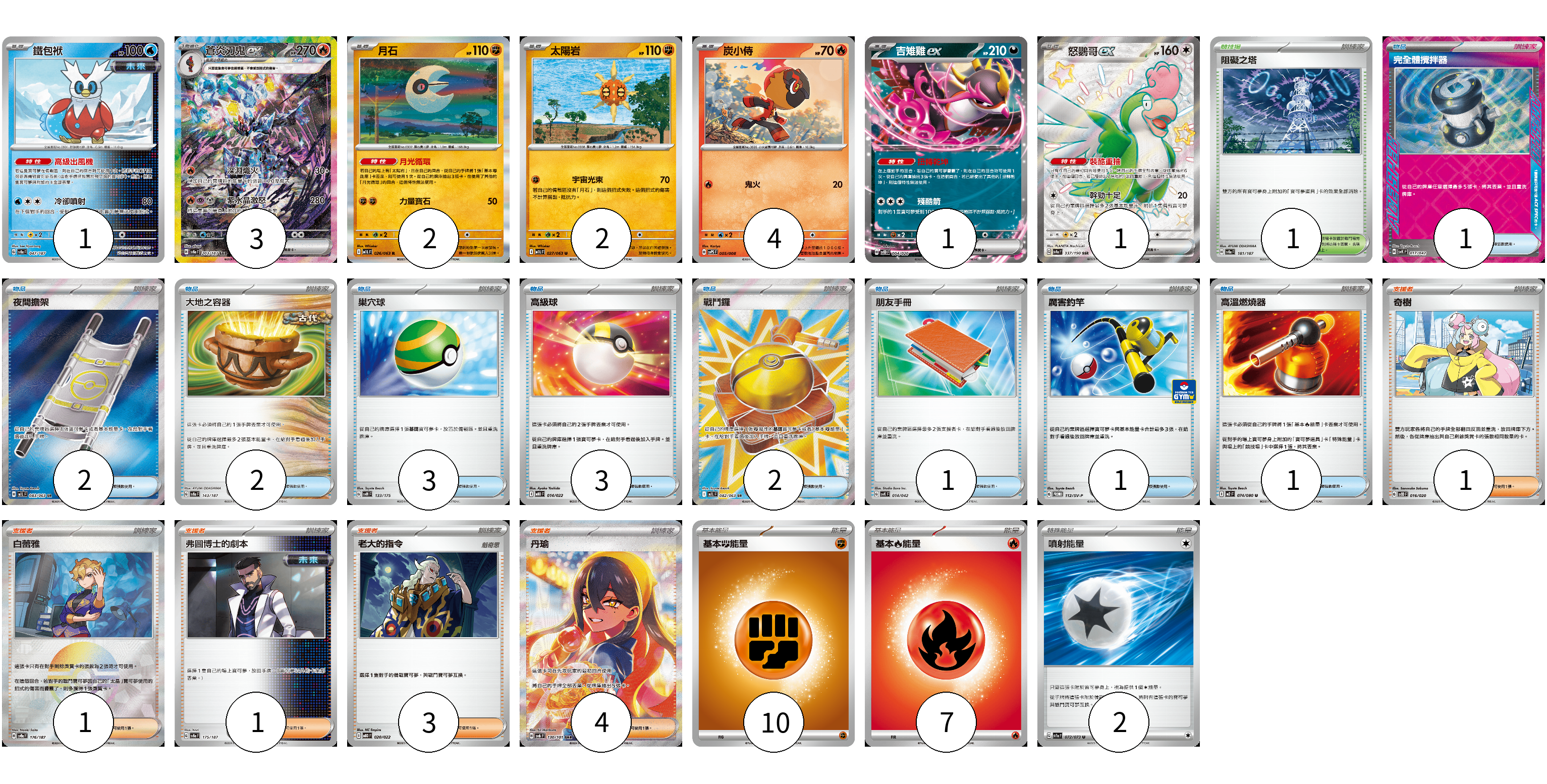 牌組構築方案 以此牌組為基礎新構築牌組 顯示卡面 顯示列表 寶可夢卡(14) 1 3 2 2 4 1 1 物品卡(16) 1 2 2 3 3 2 1 1 1 支援者卡(10) 1 1 1 3 4 競技場卡(1) 1 能量卡(19) 10 7 2 寶可夢卡(14) 卡牌名稱 張數 卡牌名稱 張數 鐵包袱 SV8a 047/187 01 蒼炎刃鬼ex SV8a 203/187 03 月石 M1L 026/063 02 太陽岩 M1L 027/063 02 炭小侍 SVPS 005/008 04 吉雉雞ex SVOD 004/020 01 怒鸚哥ex SV4a 337/190 01 物品卡(16) 卡牌名稱 張數 卡牌名稱 張數 完全體攪拌器 SVK 017/042 01 夜間擔架 M1L 083/063 02 大地之容器 SV8a 143/187 02 巢穴球 SVM 133/175 03 高級球 MBD 014/022 03 戰鬥鑼 M1L 082/063 02 朋友手冊 SVK 014/042 01 厲害釣竿 SV-P 112/SV-P 01 高溫燃燒器 M2 074/080 01 支援者卡(10) 卡牌名稱 張數 卡牌名稱 張數 奇樹 SVOD 016/020 01 白蕾雅 SV8a 176/187 01 弗圖博士的劇本 SV8a 175/187 01 老大的指令 MBD 020/022 03 丹瑜 SV6 130/101 04 競技場卡(1) 卡牌名稱 張數 卡牌名稱 張數 阻礙之塔 SV8a 181/187 01 能量卡(19) 卡牌名稱 張數 卡牌名稱 張數 基本【鬥】能量 M-P FIG 10 基本【火】能量 M-P FIR 07 噴射能量 SV1a 072/073 02 以此牌組為基礎新構築牌組 牌組編碼 xmLXht-uLwxbw-qNxRfP copy 列印牌組單 牌組編碼已複製 分享至SNS