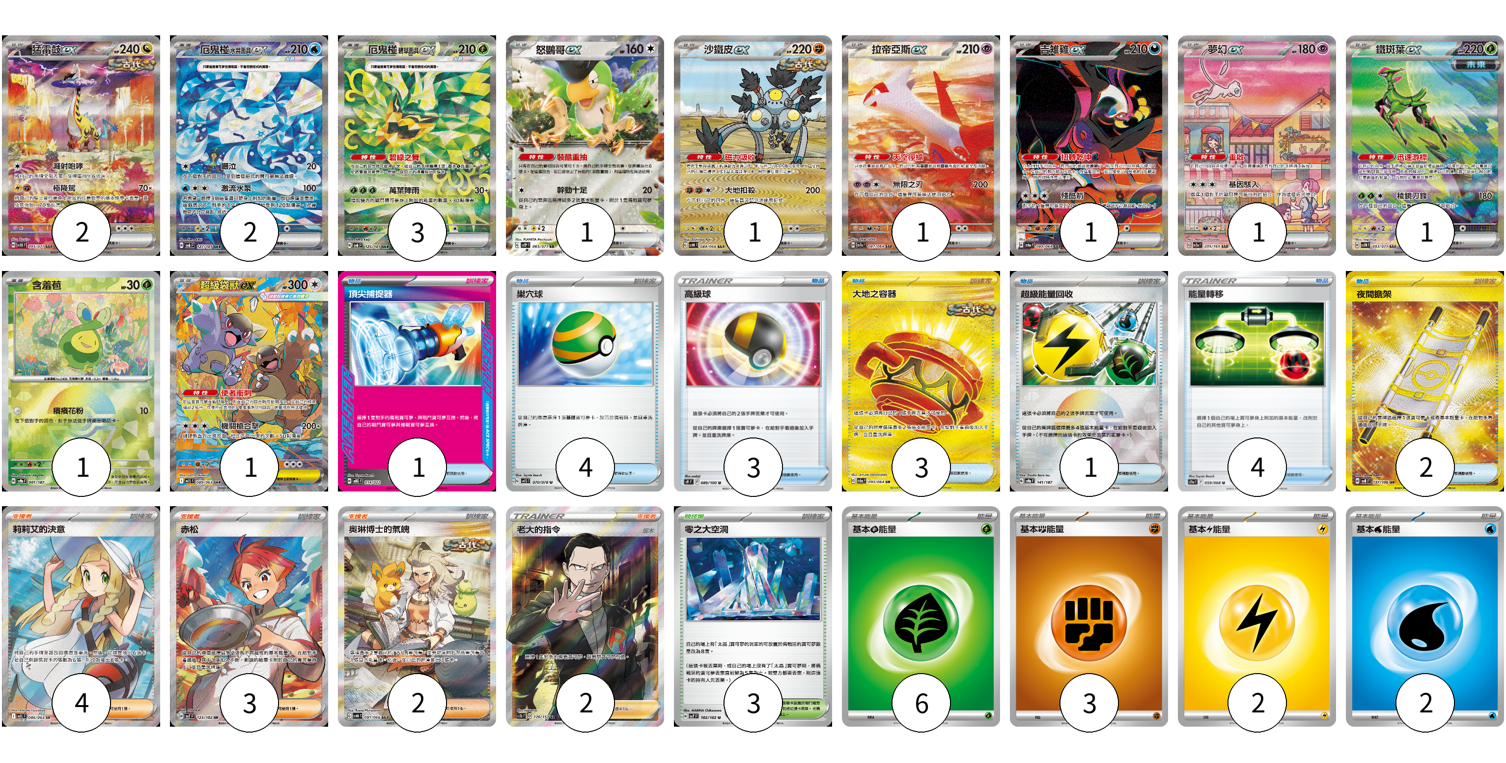 牌組構築方案 以此牌組為基礎新構築牌組 顯示卡面 顯示列表 寶可夢卡(15) 2 2 3 1 1 1 1 1 1 1 1 物品卡(18) 1 4 3 3 1 4 2 支援者卡(11) 4 3 2 2 競技場卡(3) 3 能量卡(13) 6 3 2 2 寶可夢卡(15) 卡牌名稱 張數 卡牌名稱 張數 猛雷鼓ex SV5K 095/071 02 厄鬼椪 水井面具ex SV6 127/101 02 厄鬼椪 碧草面具ex SV6 125/101 03 怒鸚哥ex SV2P 065/071 01 沙鐵皮ex SV4K 089/066 01 拉帝亞斯ex SV7a 087/064 01 吉雉雞ex SV6a 089/064 01 夢幻ex SV2a 205/165 01 鐵斑葉ex SV5M 093/071 01 含羞苞 SV8a 001/187 01 超級袋獸ex M1S 089/063 01 物品卡(18) 卡牌名稱 張數 卡牌名稱 張數 頂尖捕捉器 MBG 014/022 01 巢穴球 SV1S 070/078 04 高級球 S9 089/100 03 大地之容器 SV6a 093/064 03 超級能量回收 SV8a 141/187 01 能量轉移 S11a 059/068 04 夜間擔架 SV8 137/106 02 支援者卡(11) 卡牌名稱 張數 卡牌名稱 張數 莉莉艾的決意 M1L 086/063 04 赤松 SV7 123/102 03 奧琳博士的氣魄 SV4K 091/066 02 老大的指令(坂木) SC1b 170/153 02 競技場卡(3) 卡牌名稱 張數 卡牌名稱 張數 零之大空洞 SV7 102/102 03 能量卡(13) 卡牌名稱 張數 卡牌名稱 張數 基本草能量 sv-p GRA 06 基本【鬥】能量 SVAM FIG 03 基本雷能量 sv-p LIG 02 基本水能量 sv-p WAT 02 以此牌組為基礎新構築牌組 牌組編碼 xmvxWU-gepKzi-JyWtVx copy 列印牌組單 牌組編碼已複製 分享至SNS