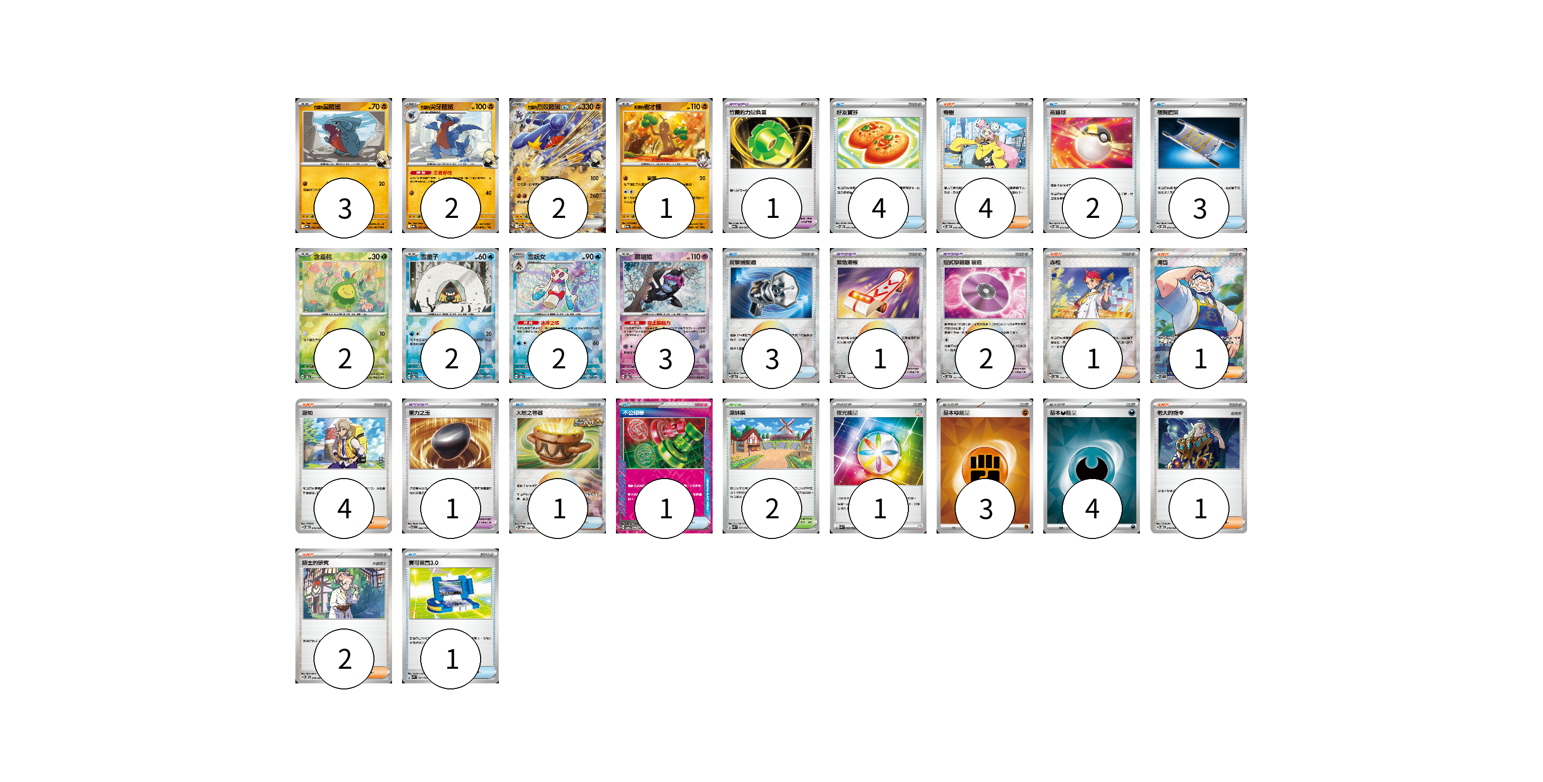 牌組構築方案 以此牌組為基礎新構築牌組 顯示卡面 顯示列表 寶可夢卡(17) 3 2 2 1 2 2 2 3 寶可夢道具(5) 1 1 2 1 物品卡(15) 4 2 3 3 1 1 1 支援者卡(13) 4 1 1 4 1 2 競技場卡(2) 2 能量卡(8) 1 3 4 寶可夢卡(17) 卡牌名稱 張數 卡牌名稱 張數 <竹蘭的>圓陸鯊 SV9a 042/063 03 <竹蘭的>尖牙陸鯊 SV9a 043/063 02 <竹蘭的>烈咬陸鯊ex SV9a 044/063 02 <阿響的>樹才怪 SV9a 041/063 01 含羞苞 SV8a 001/187 02 雪童子 SV8a 037/187 02 雪妖女 SV8a 038/187 02 願增猿 SV8a 075/187 03 寶可夢道具(5) 卡牌名稱 張數 卡牌名稱 張數 竹蘭的力量負重 SV9a 060/063 01 緊急滑板 SV8a 153/187 01 招式學習器 衰退 SV8a 161/187 02 重力之玉 SV7 095/102 01 物品卡(15) 卡牌名稱 張數 卡牌名稱 張數 好友寶芬 SVOD 011/020 04 高級球 SVOD 012/020 02 夜間擔架 SVOM 016/021 03 反擊捕捉器 SV8a 139/187 03 大地之容器 SV8a 143/187 01 不公印章 SV5a 053/066 01 寶可裝置3.0 SVK 021/042 01 支援者卡(13) 卡牌名稱 張數 卡牌名稱 張數 奇樹 SVOD 016/020 04 赤松 SV8a 163/187 01 海岱 SV7 125/102 01 派帕 SVOD 018/020 04 老大的指令 SVOD 019/020 01 博士的研究 SVOM 019/021 02 競技場卡(2) 卡牌名稱 張數 卡牌名稱 張數 深缽鎮 SVK 039/042 02 能量卡(8) 卡牌名稱 張數 卡牌名稱 張數 夜光能量 SVK 042/042 01 基本【鬥】能量 SVK FIG 03 基本【惡】能量 SVK DAR 04 以此牌組為基礎新構築牌組 牌組編碼 xnlyXY-ANVZng-cYJfyY copy 列印牌組單 牌組編碼已複製 分享至SNS
